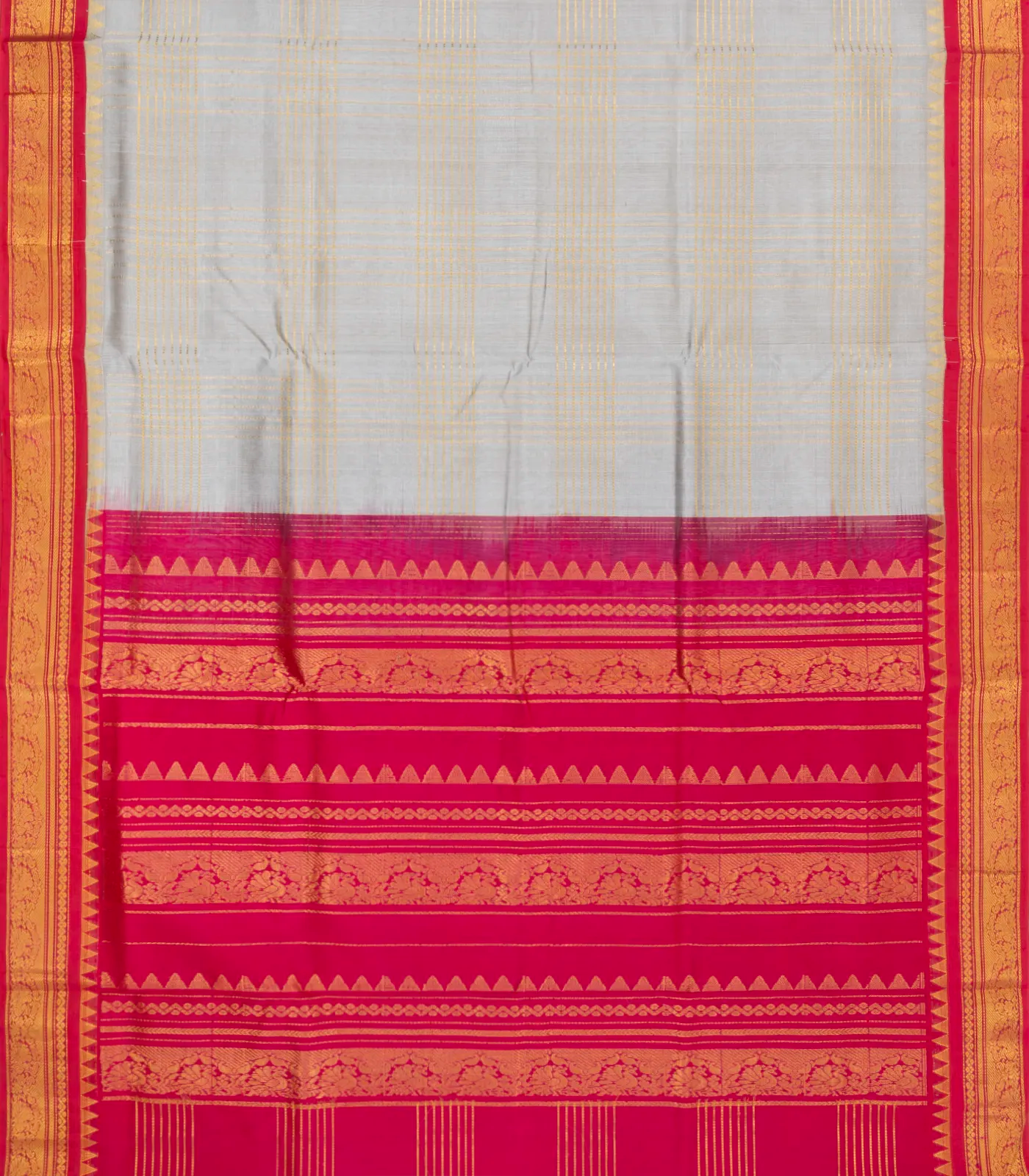 Grey Handloom Korvai Silk Cotton Saree With Checks & Contrast Border-SC3871