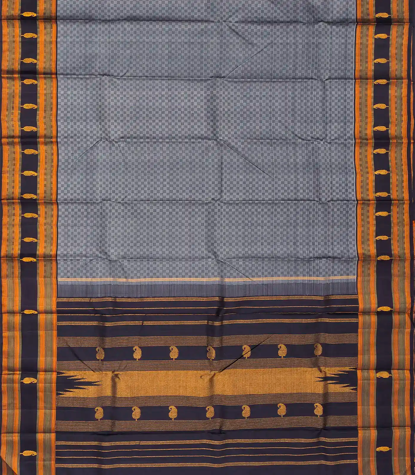 This handwoven payadi kanchipuram silk saree is filled with checks in grey body along with contrast border and pallu