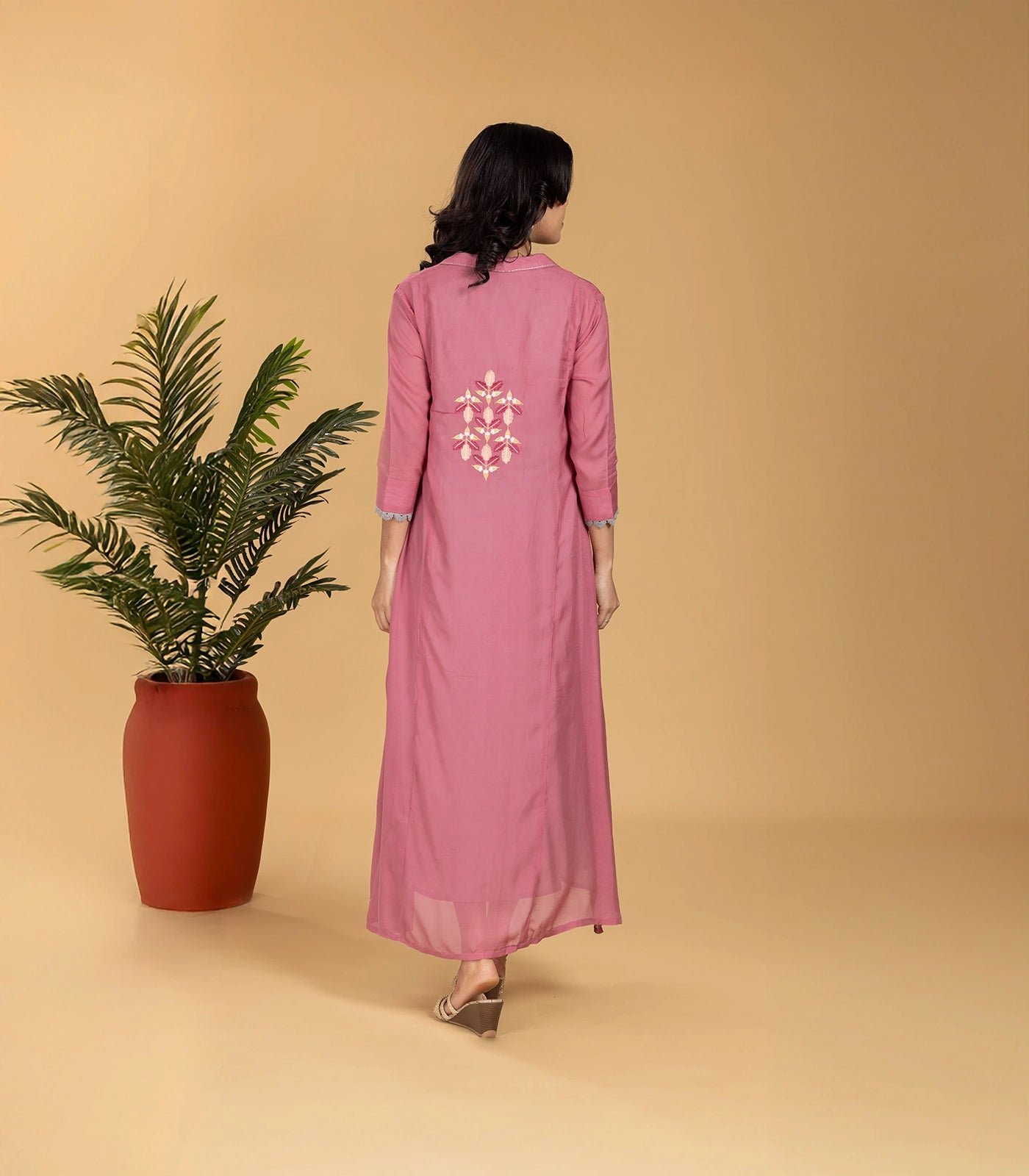 ● Round neckline with placement embroidery at centre front and at the back ● Sleeveless A-line maxi dress ● Paired with matching pink jacket with minimal embroidery detailing.