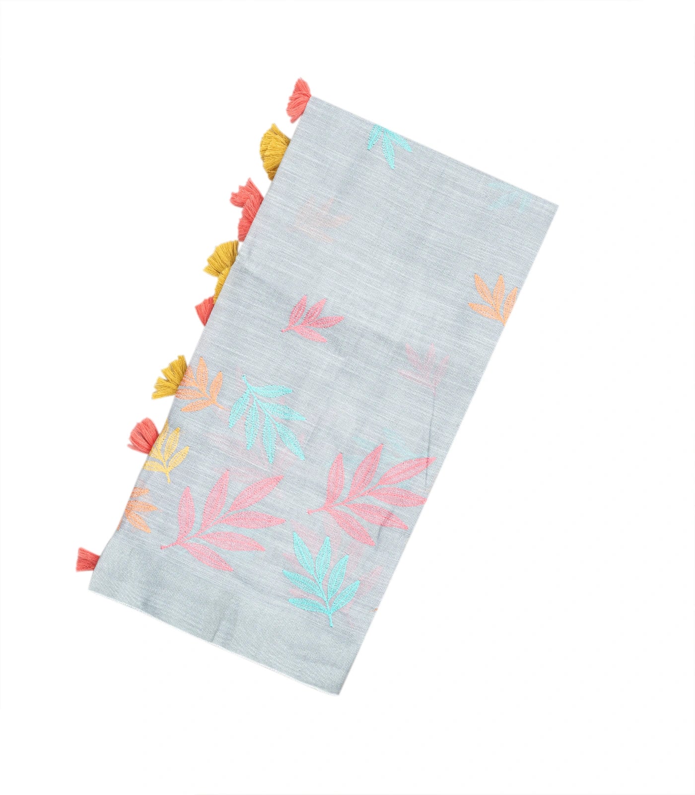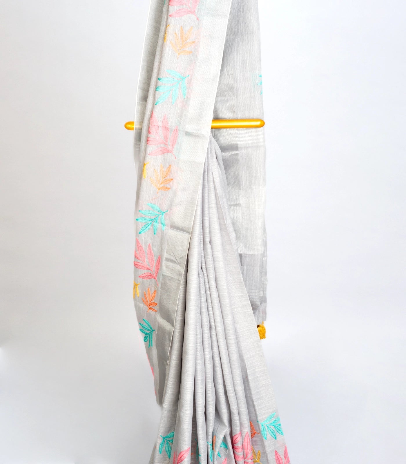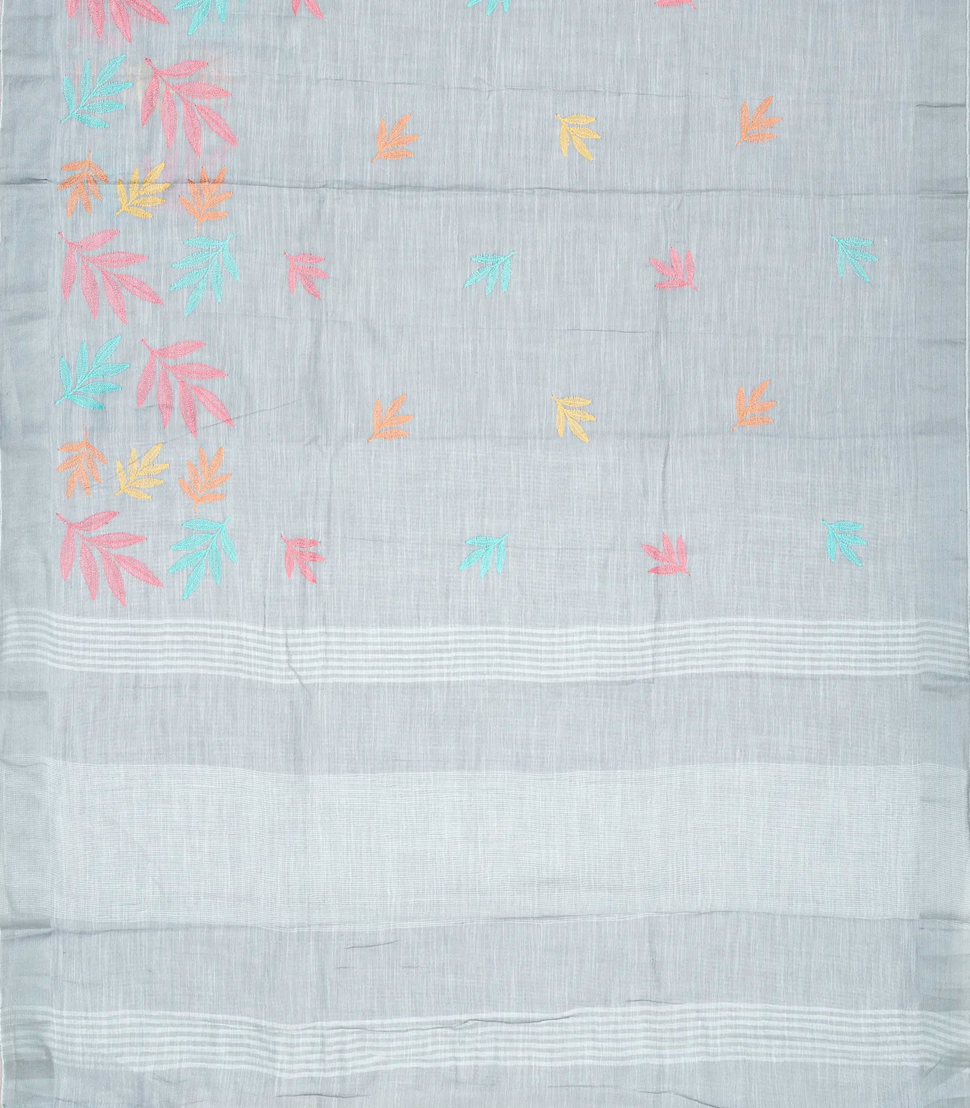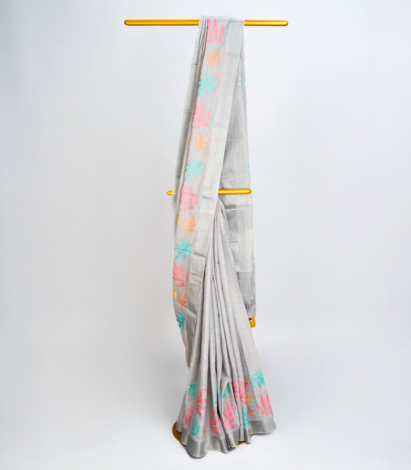 Grey Woven Art Linen Saree With Embroidered Floral Motifs-BL3766