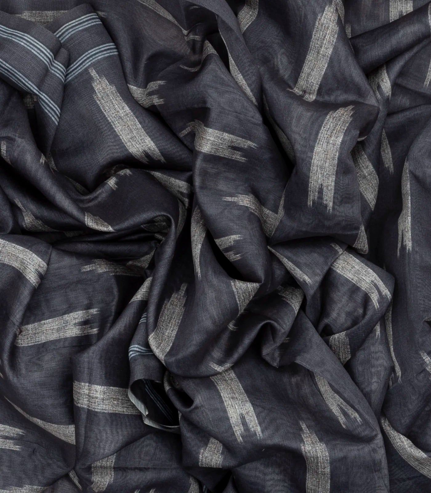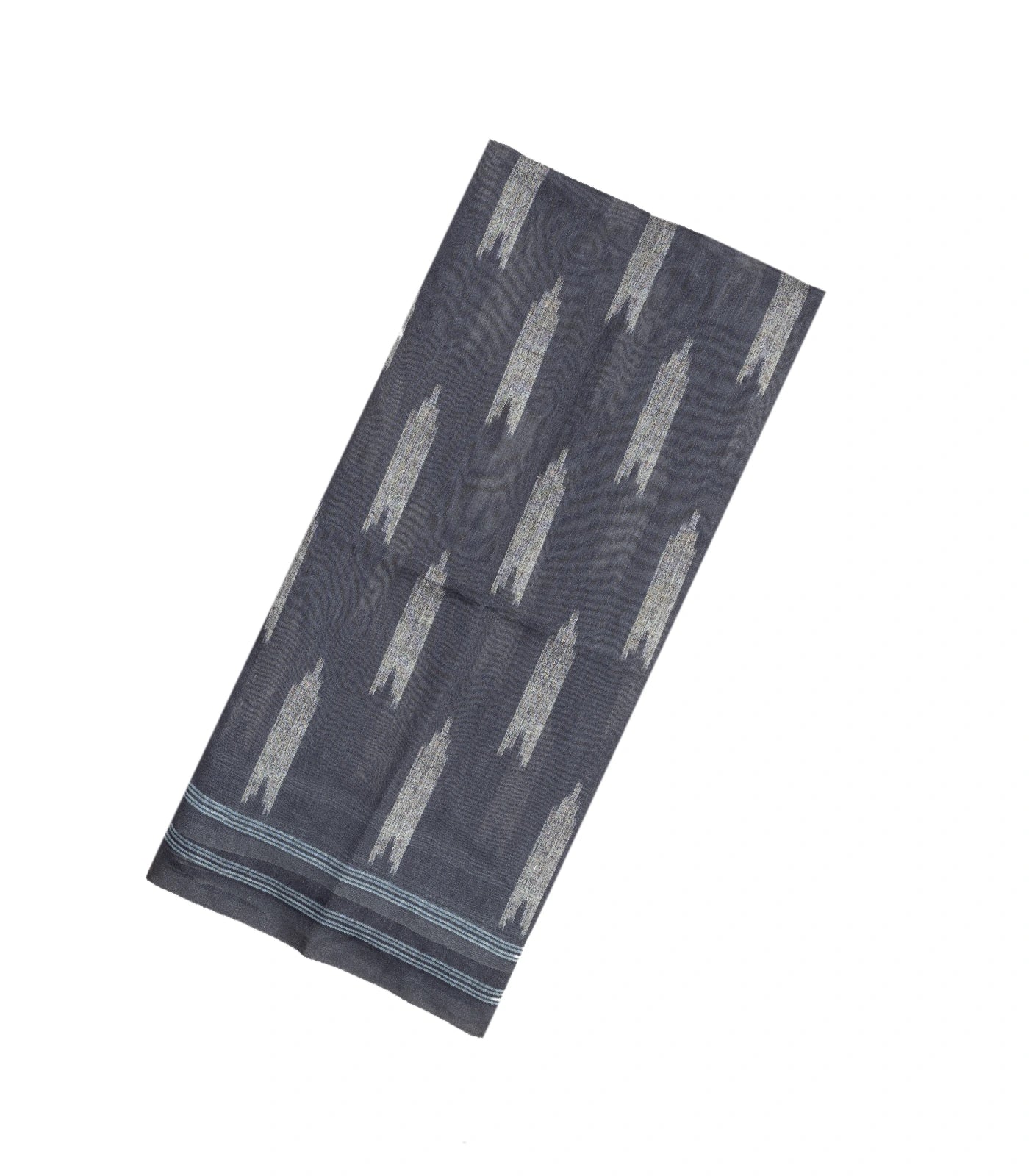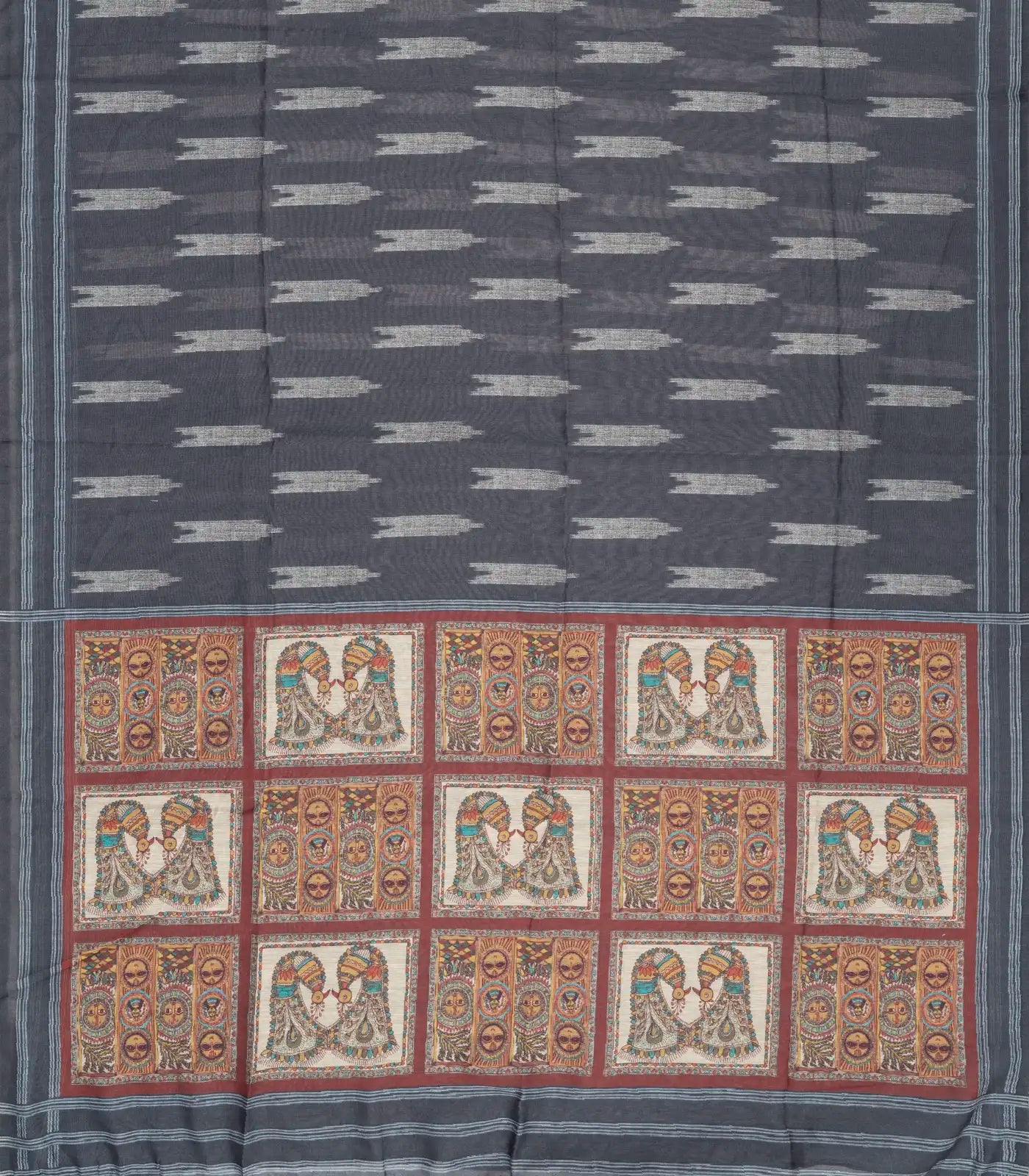 This woven art linen saree is filled with buttas in grey body along with border and printed pallu