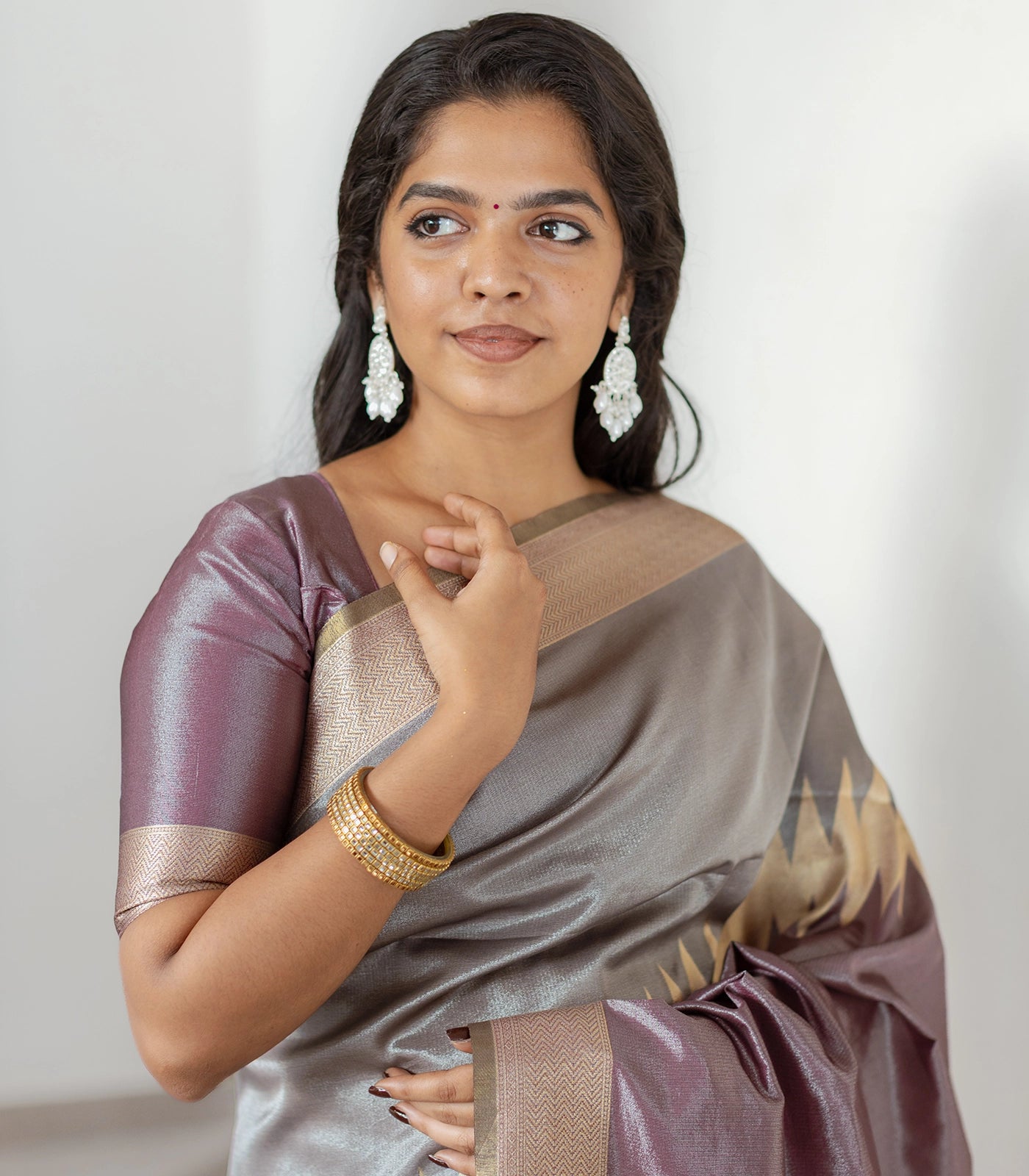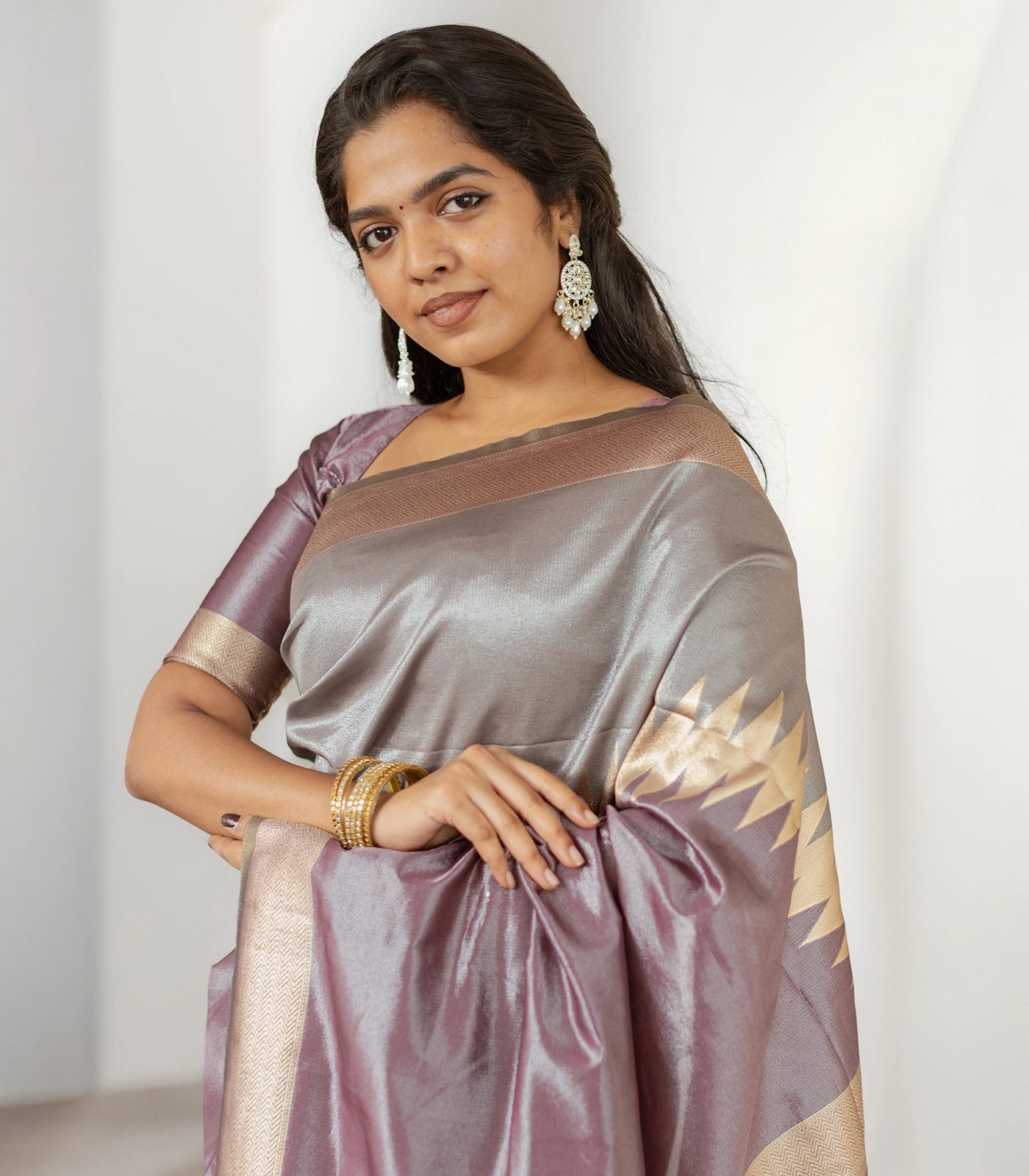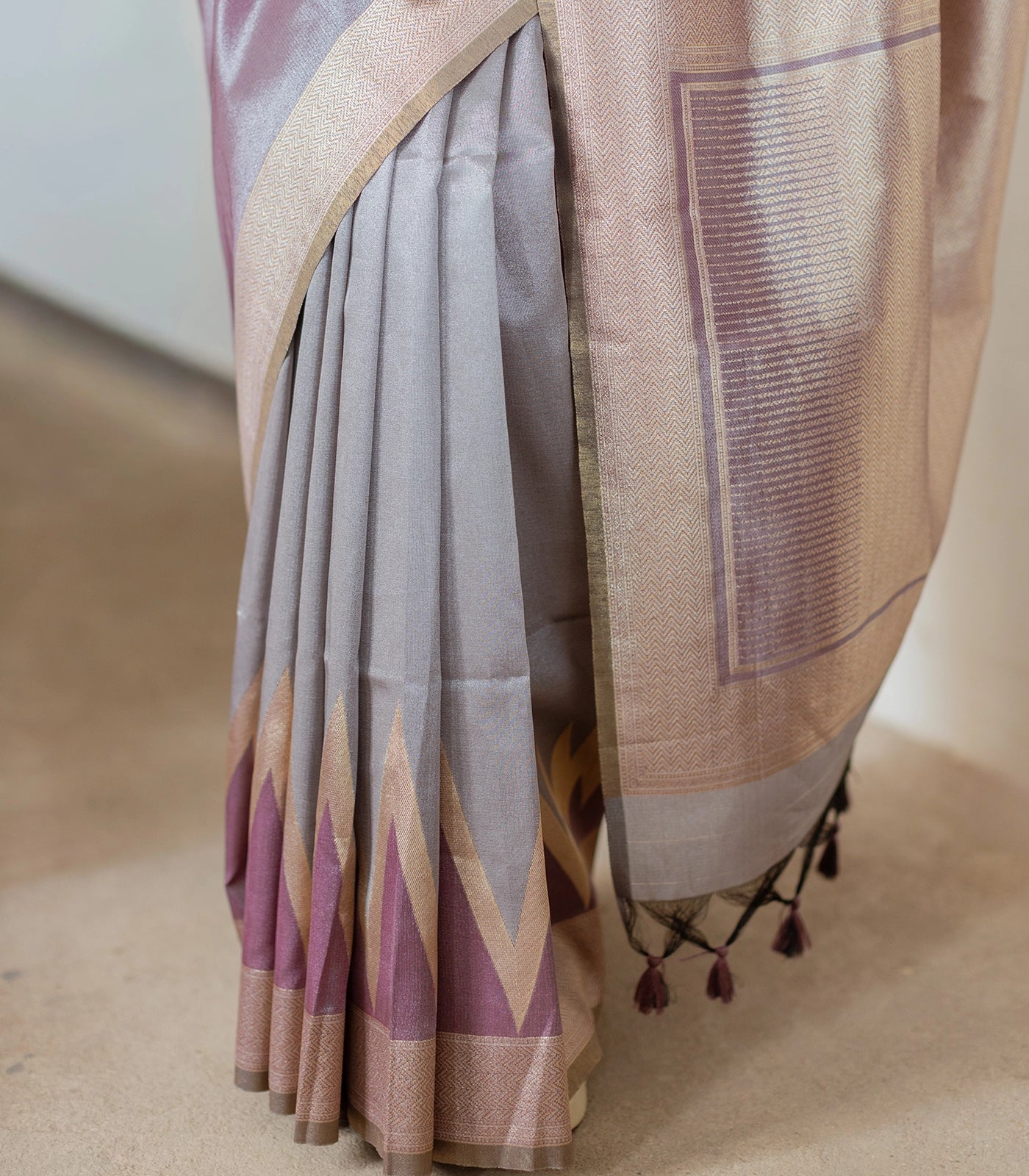 This woven art tussar silk saree with plain grey body along with rising border and pallu