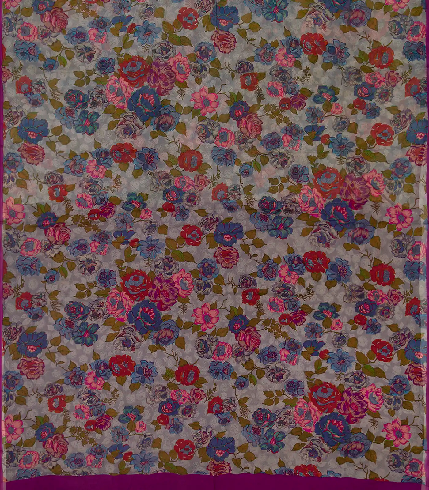 This woven chiffon silk saree is printed with floral motifs in grey body