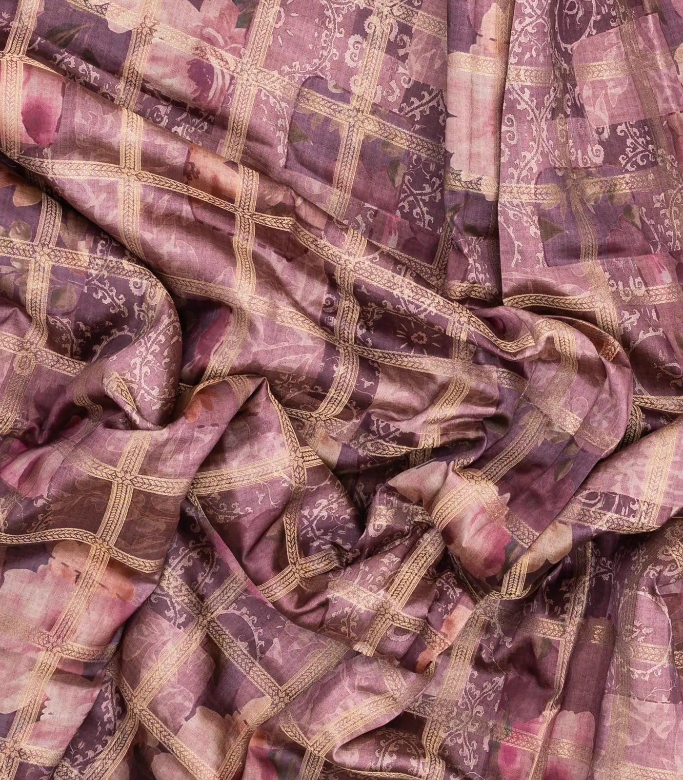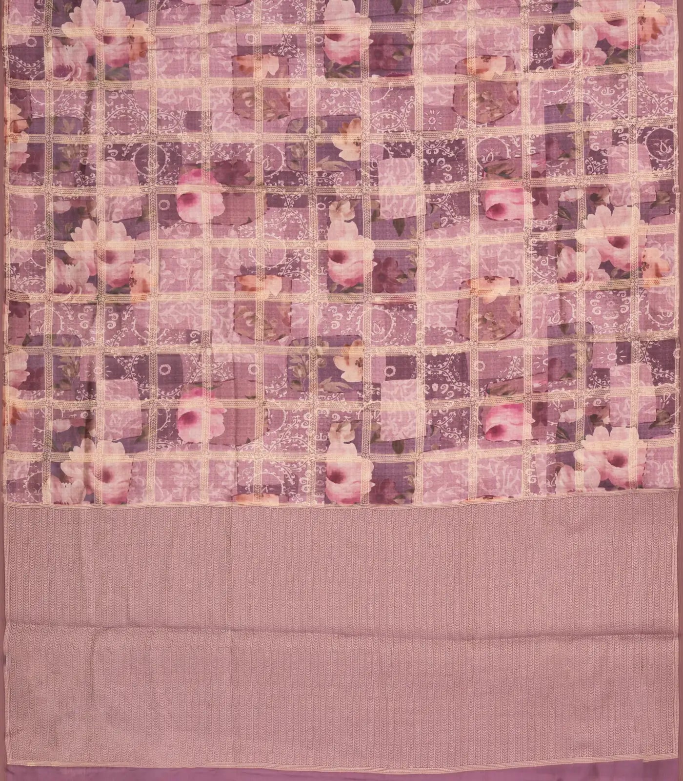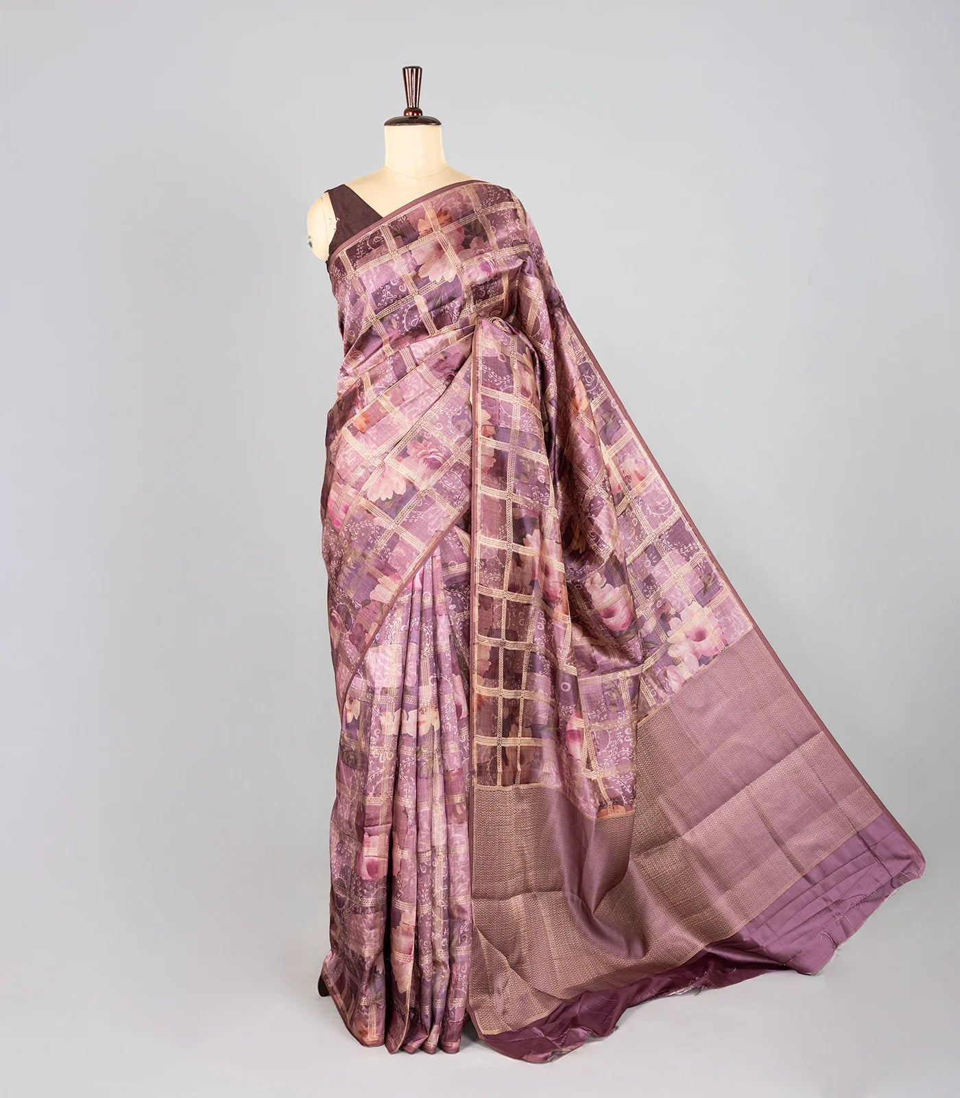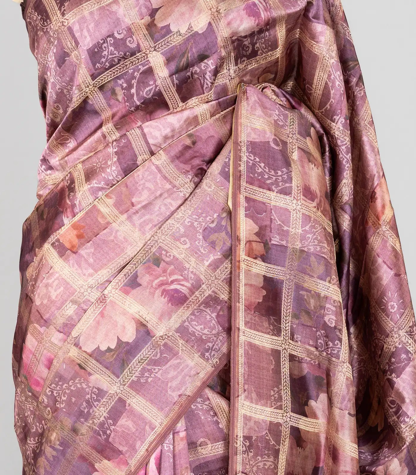This woven synthetic dola silk saree is filled with checks & printed floral motifs in grey body along with pallu