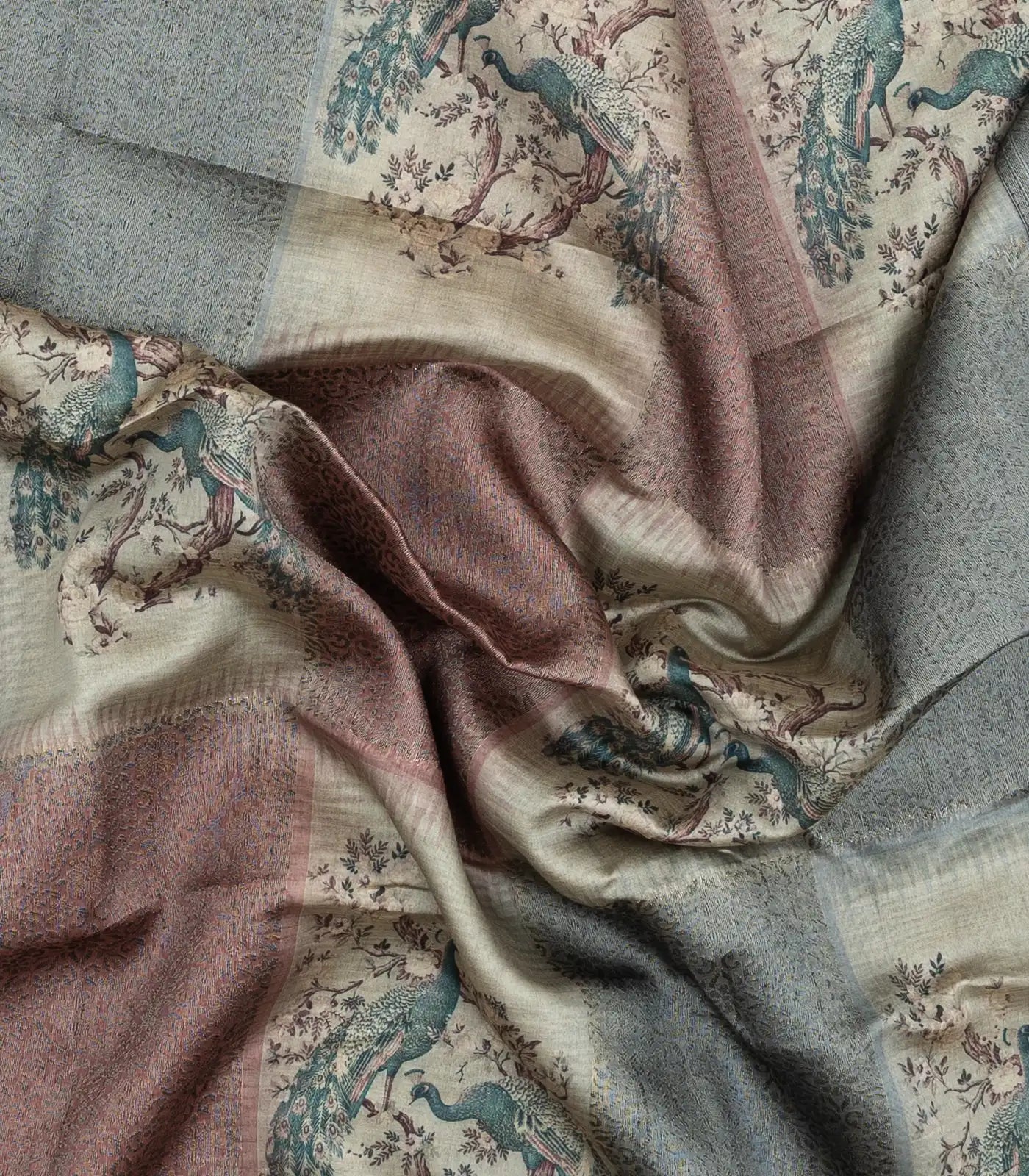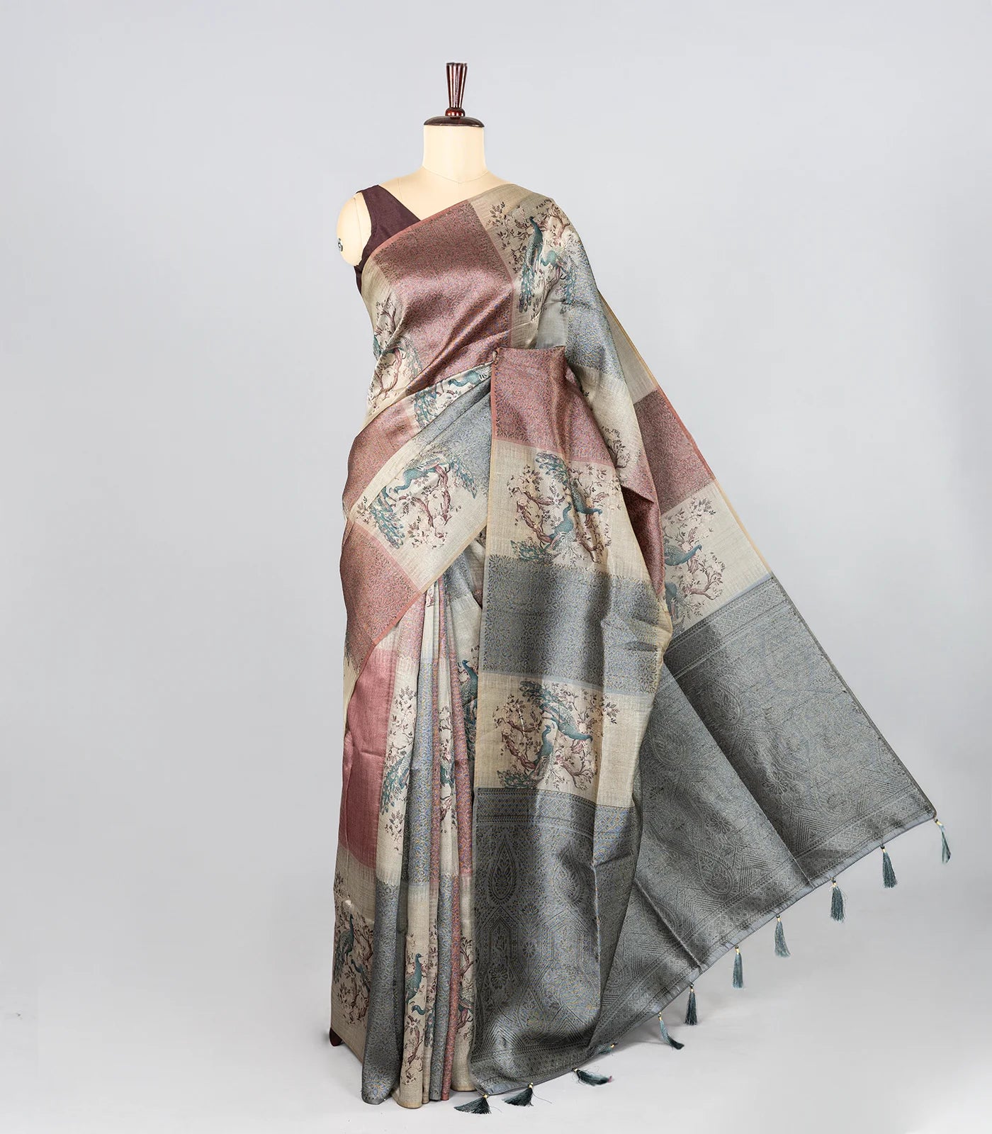 This woven synthetic dola silk saree is filled with woven & printed floral motifs in grey body along with pallu