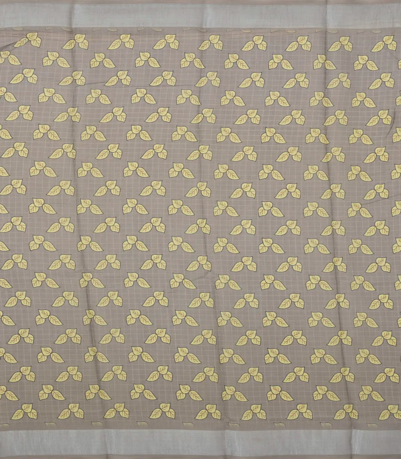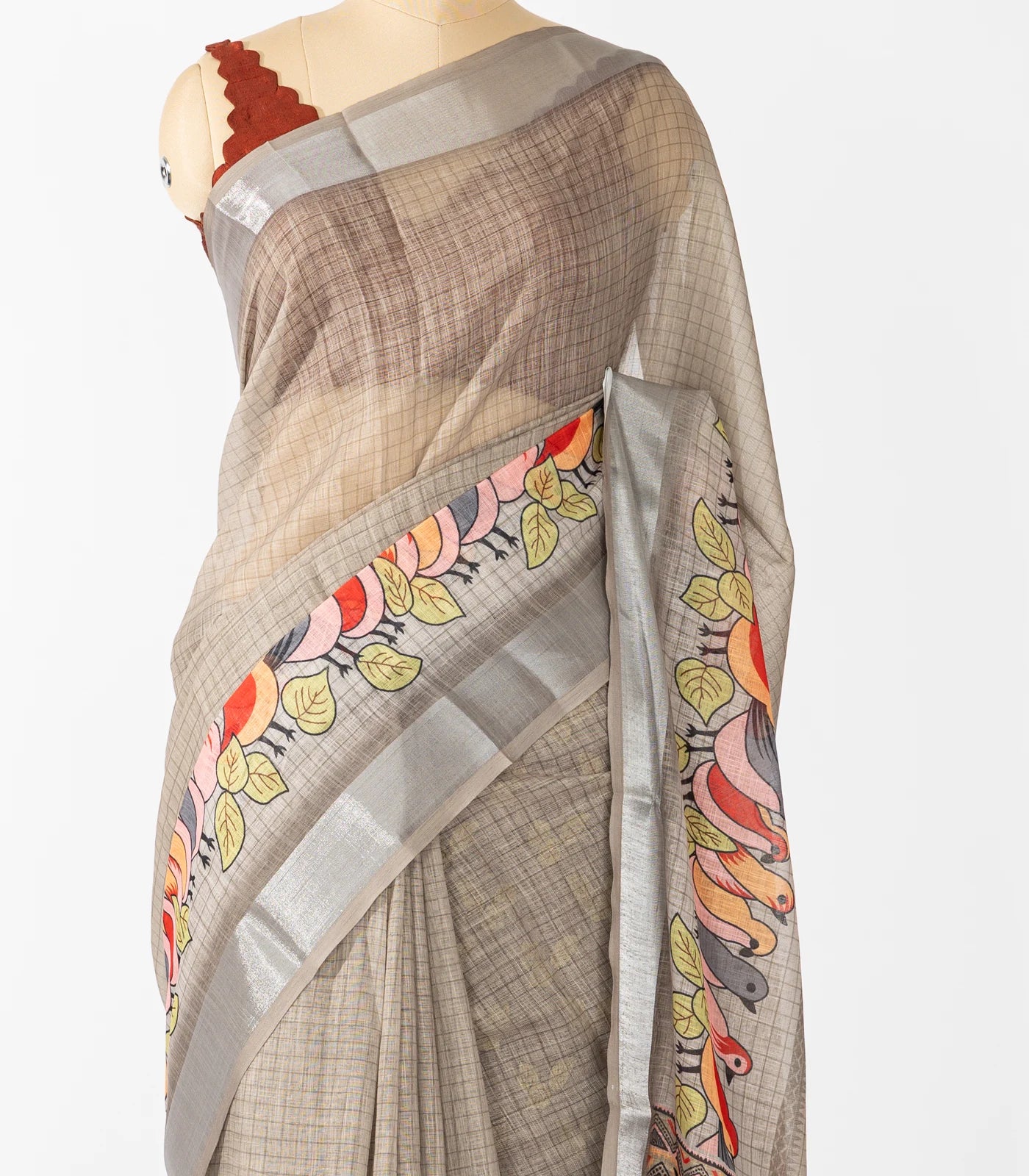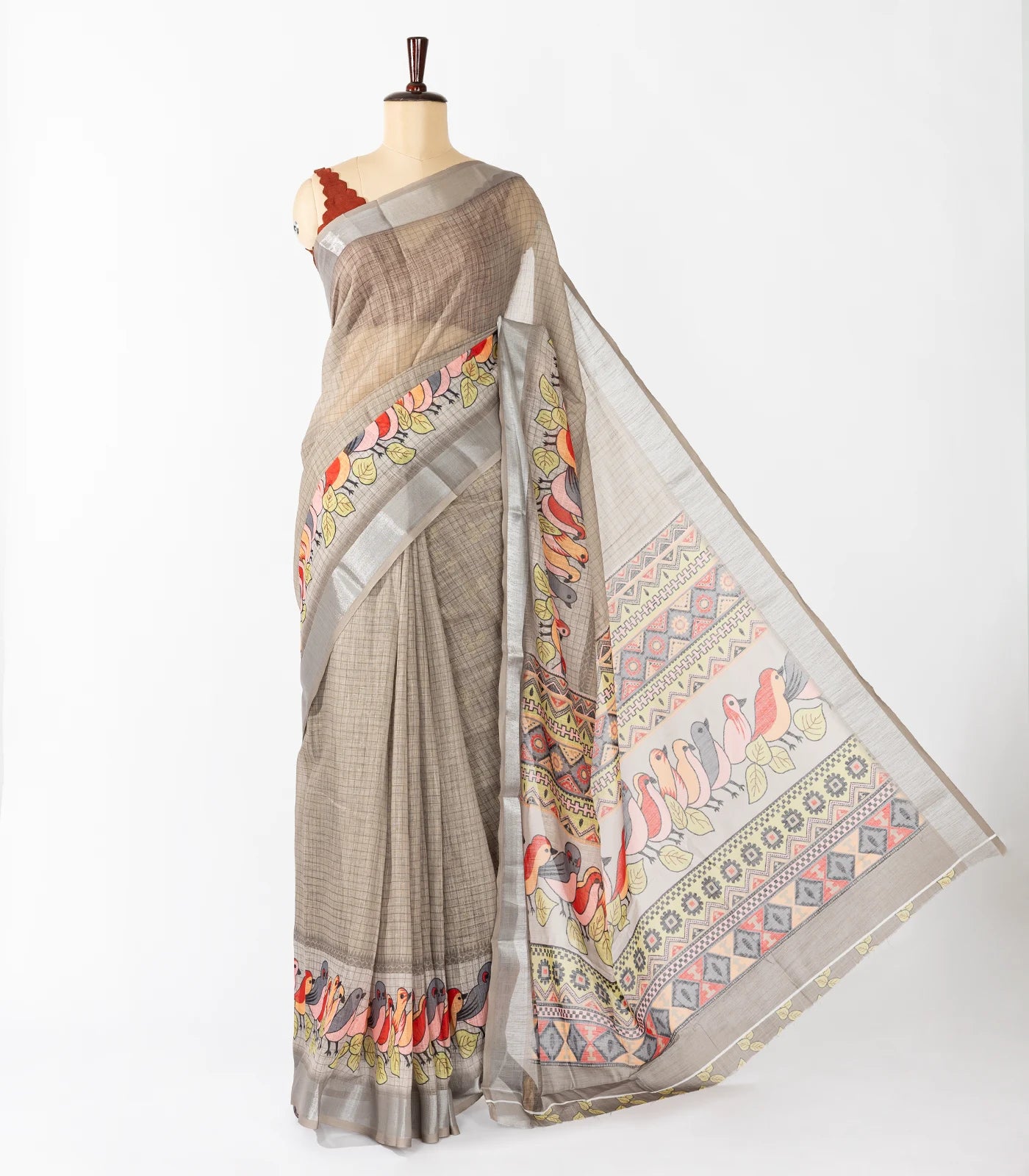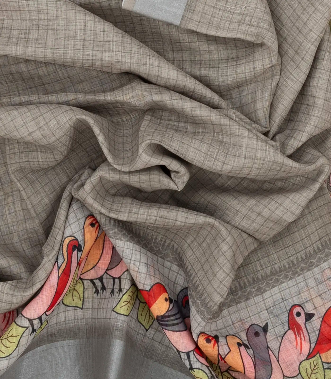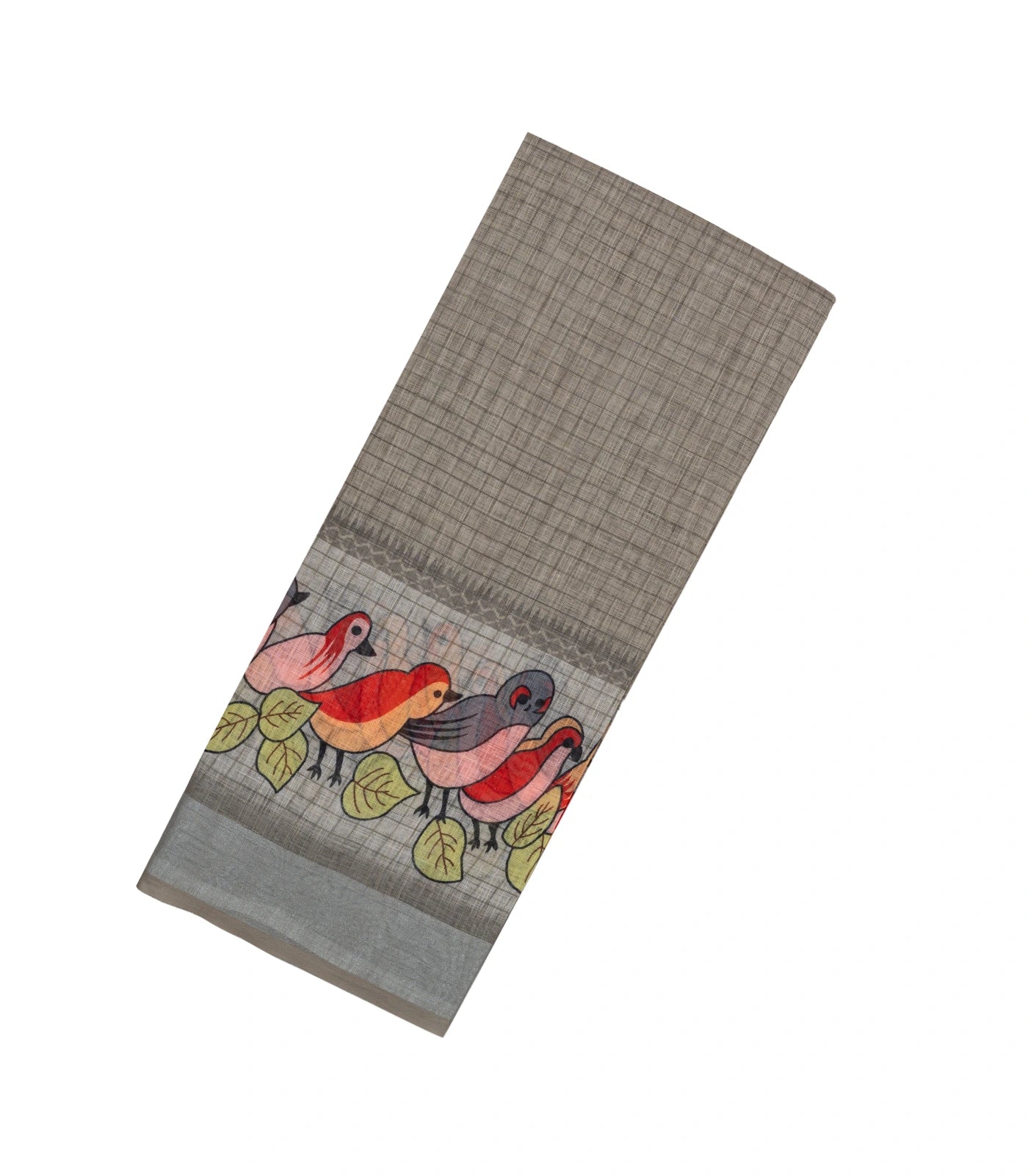 Grey Woven Synthetic Linen Saree With Printed Bird Motifs-BL4405
