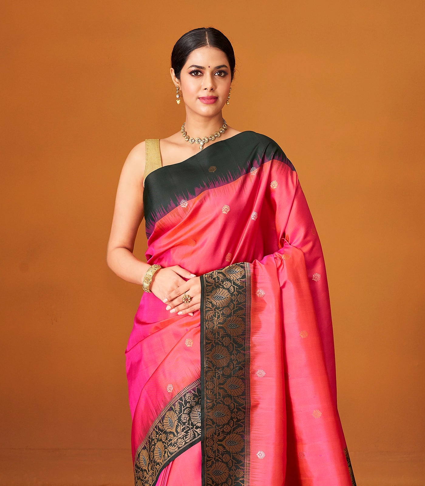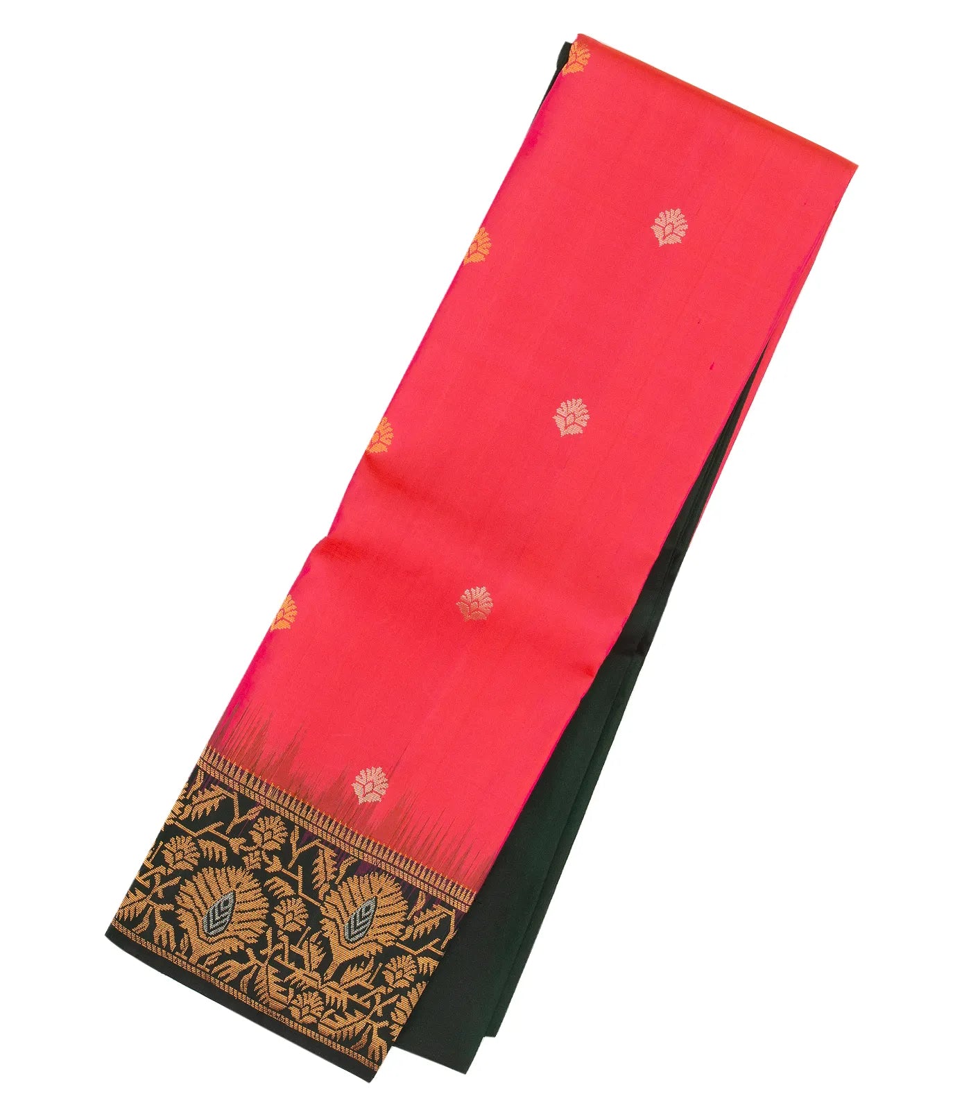 This handwoven soft silk saree is filled with zari buttas in hot peach body along with contrast border and pallu