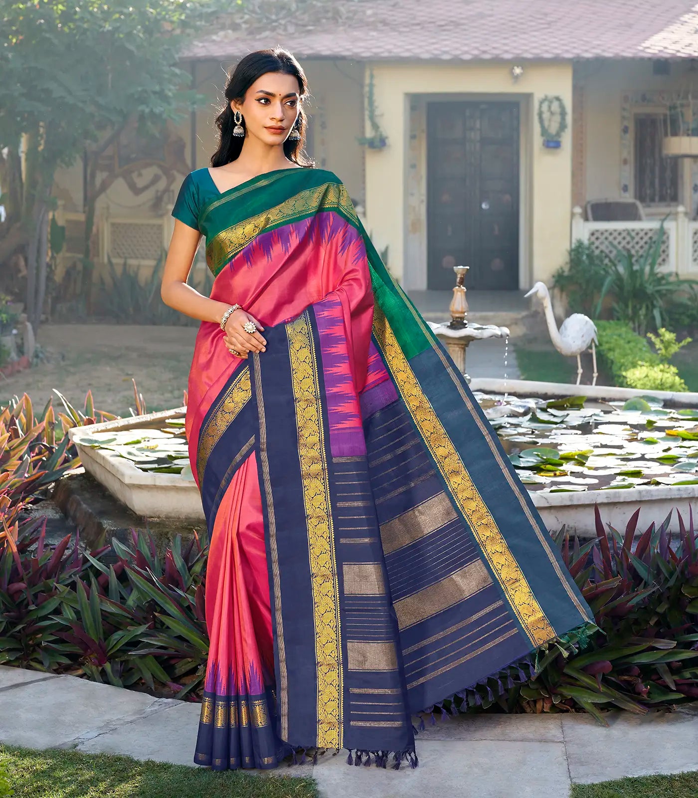 Hot Pink Handloom Korvai Kanchipuram Silk Saree With Ganga Jamuna Border-KA14798