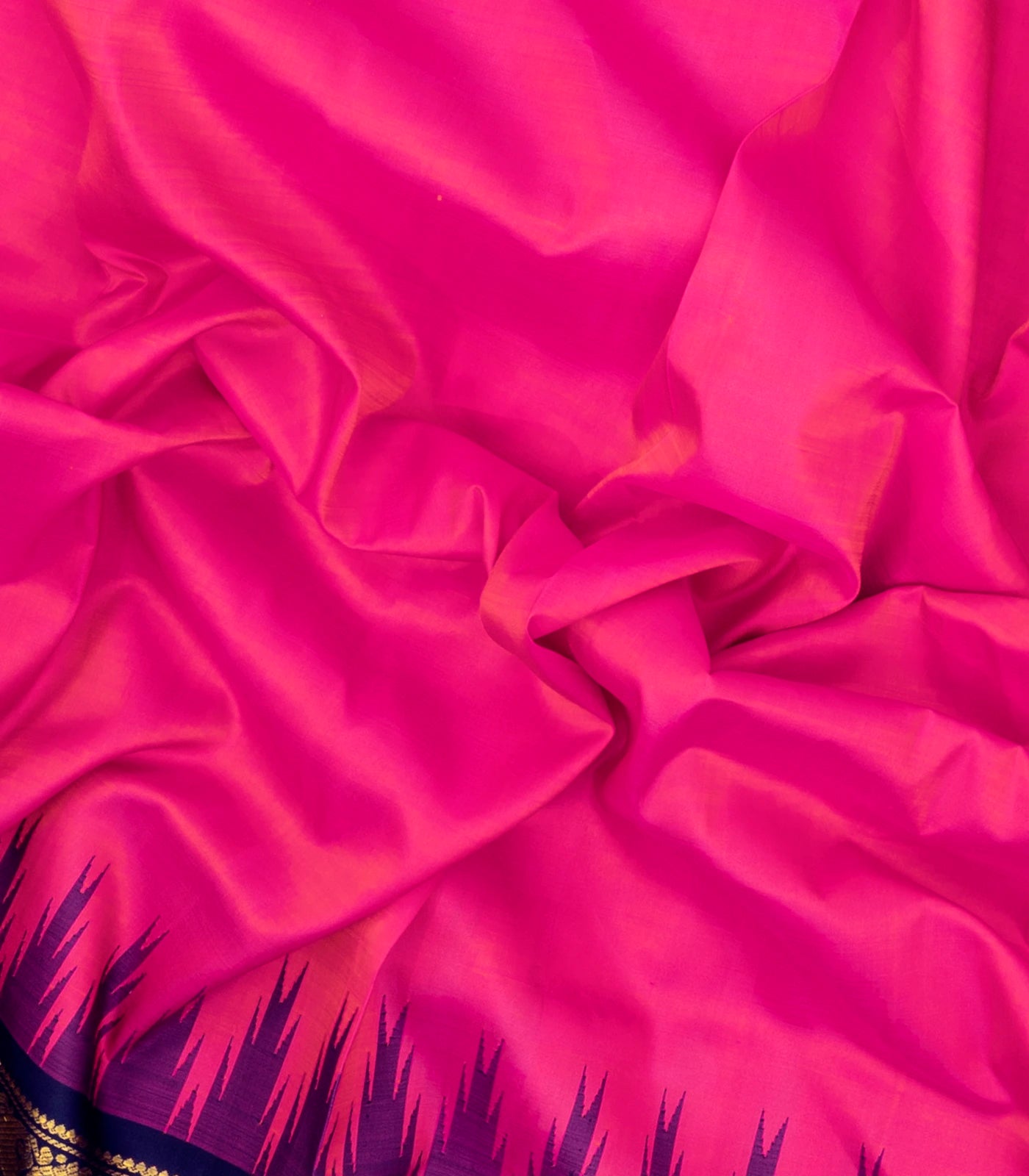 This handwoven korvai kanchipuram silk saree is filled with plain hot pink body along with contrast ganga jamuna temple border and pallu