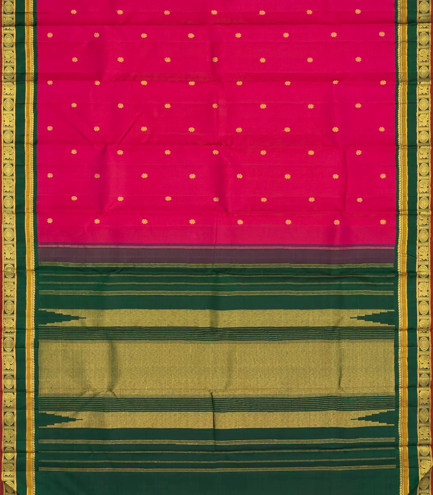 This handwoven korvai kanchipuram silk saree is filled with kamalam motifs in hot pink body along with contrast green zari border and pallu