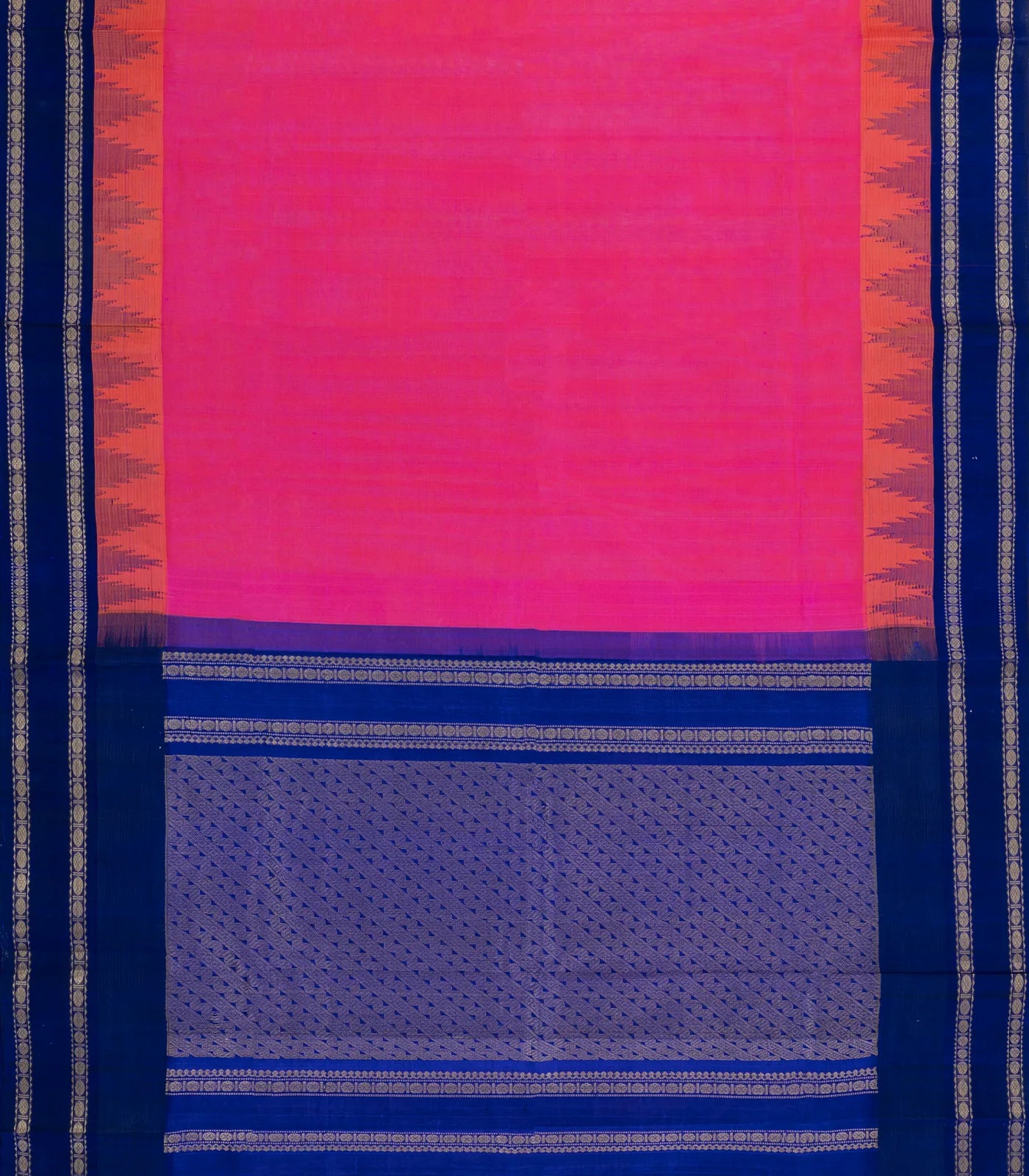 This handwoven silk cotton saree is filled with plain hot pink body along with contrast temple border and pallu