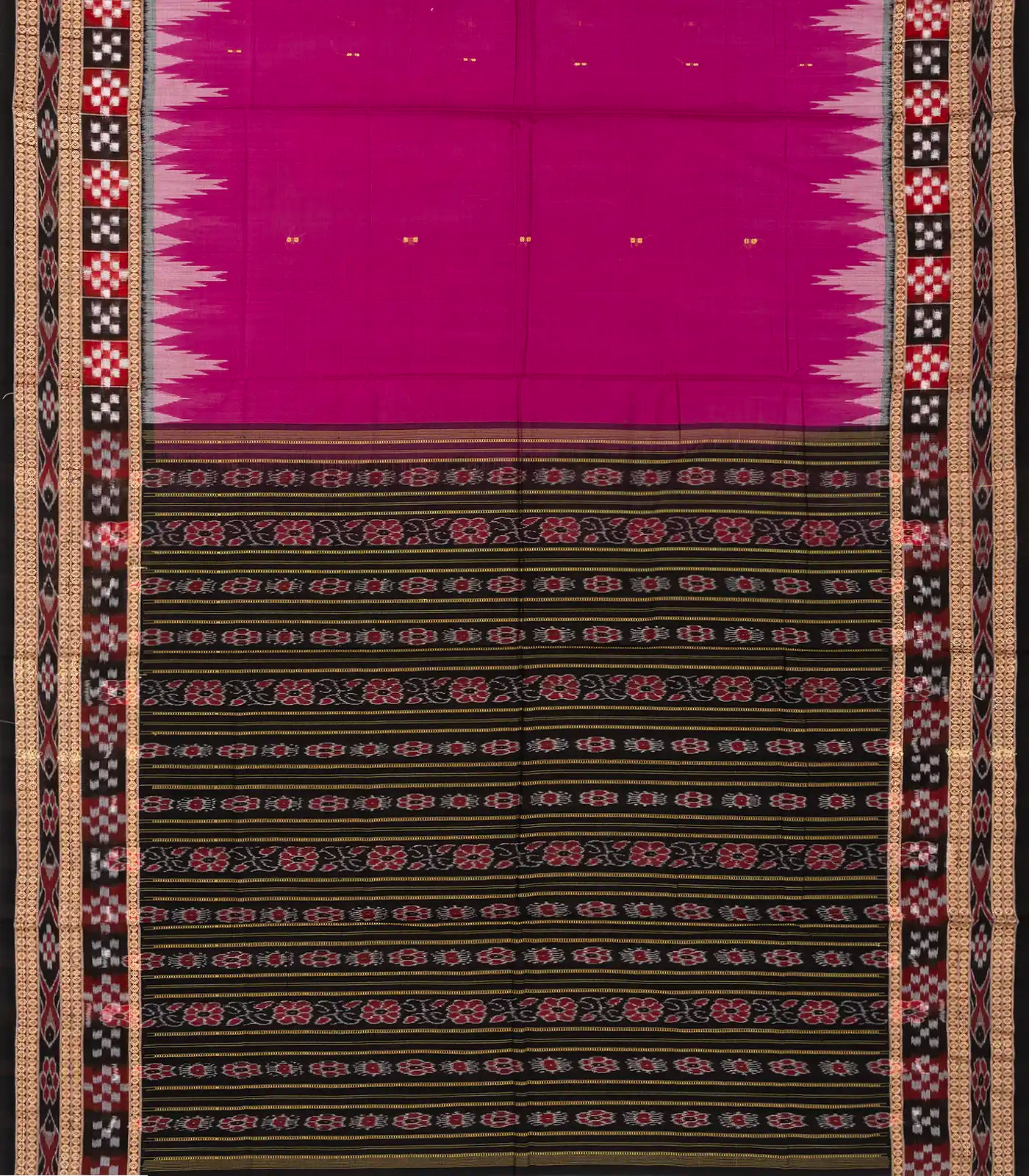 This woven orissa cotton saree is filled with tie & dye and temple border motifs in hot pink body along with border and pallu