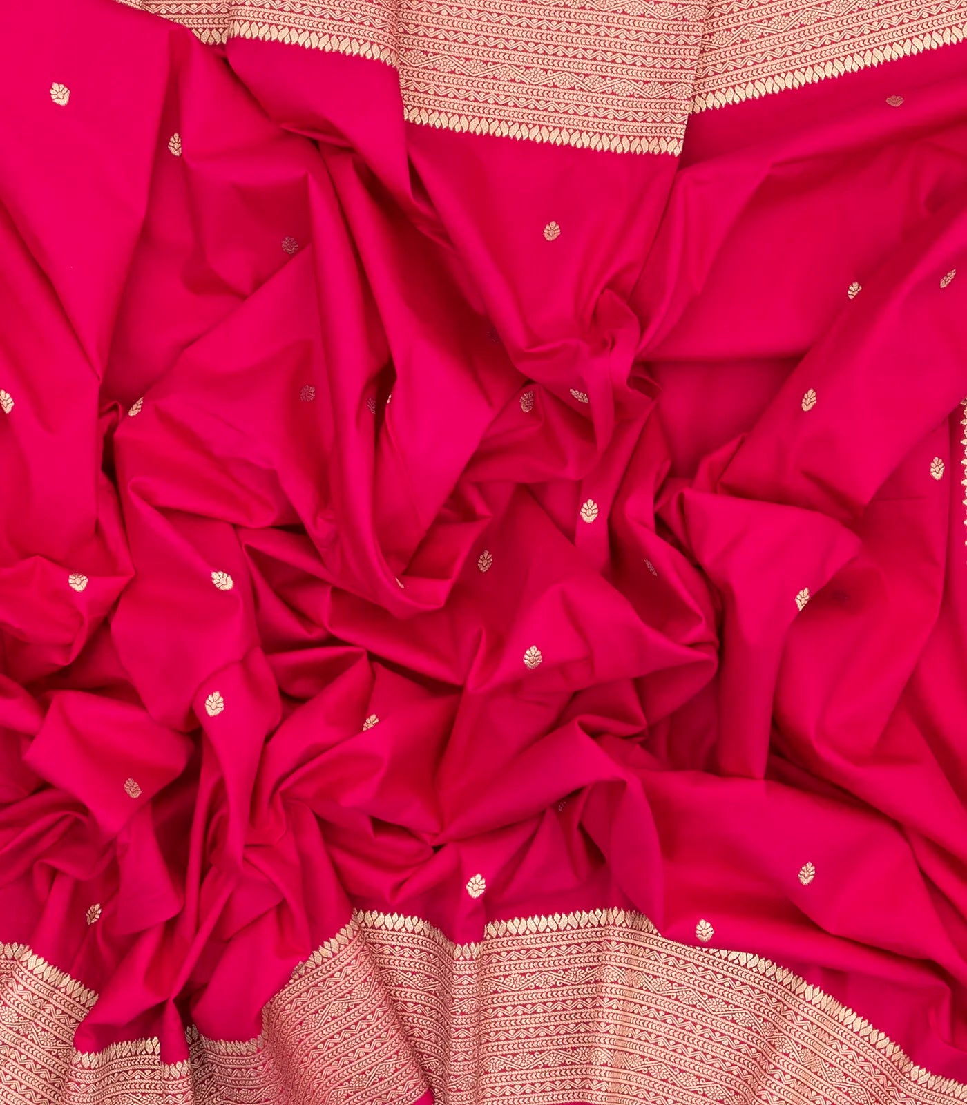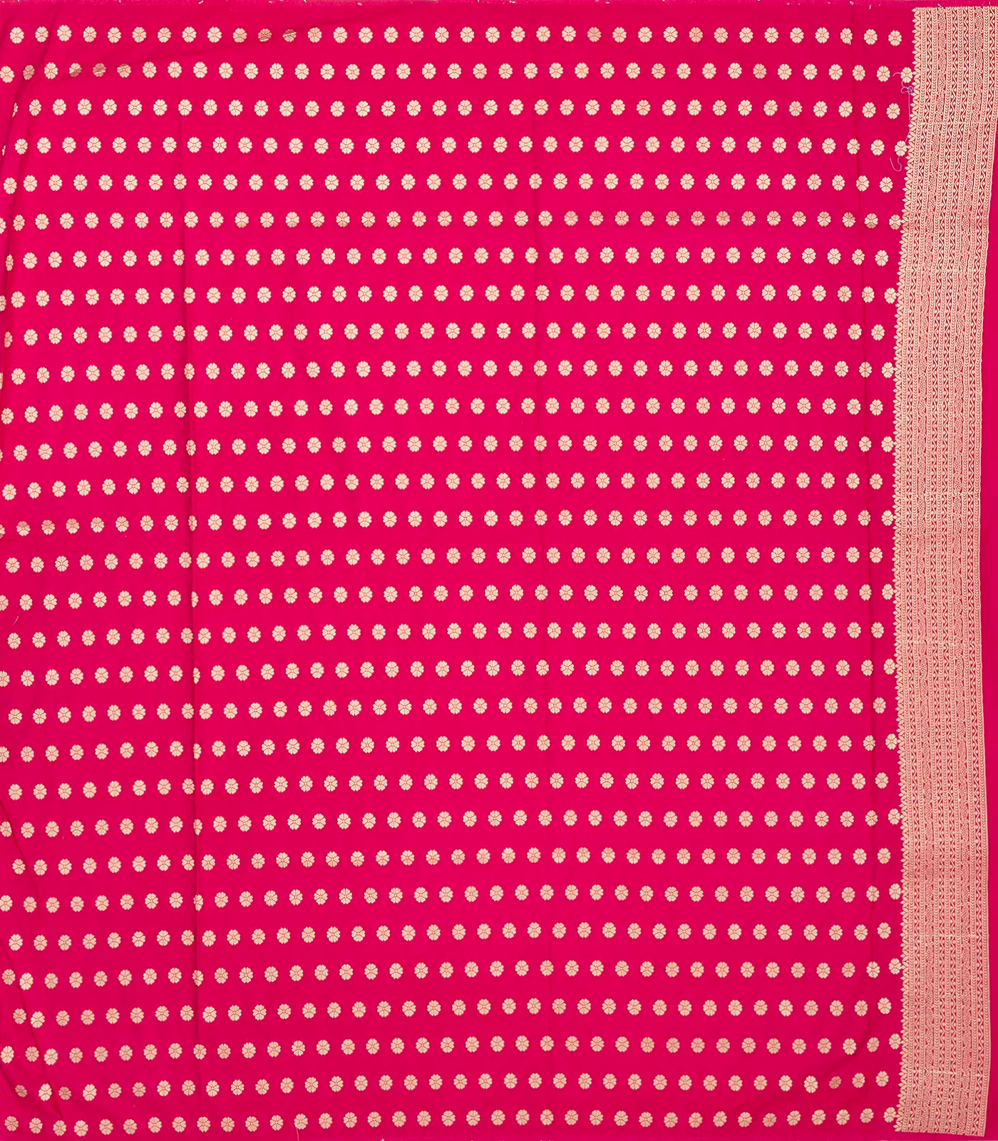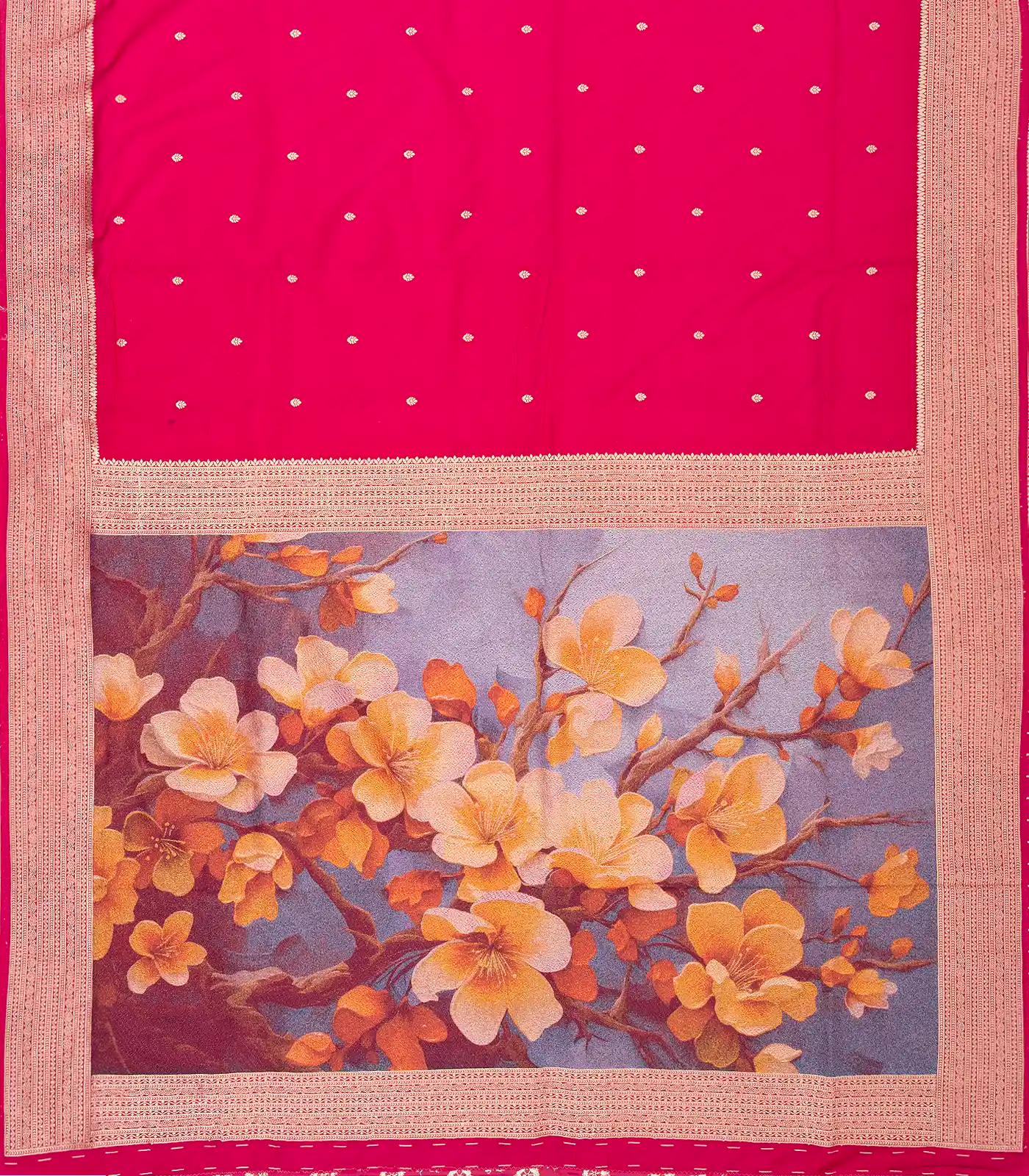 This woven blended soft silk saree is filled with floral buttas in hot pink body along with border and digital weaving floral motifs in pallu