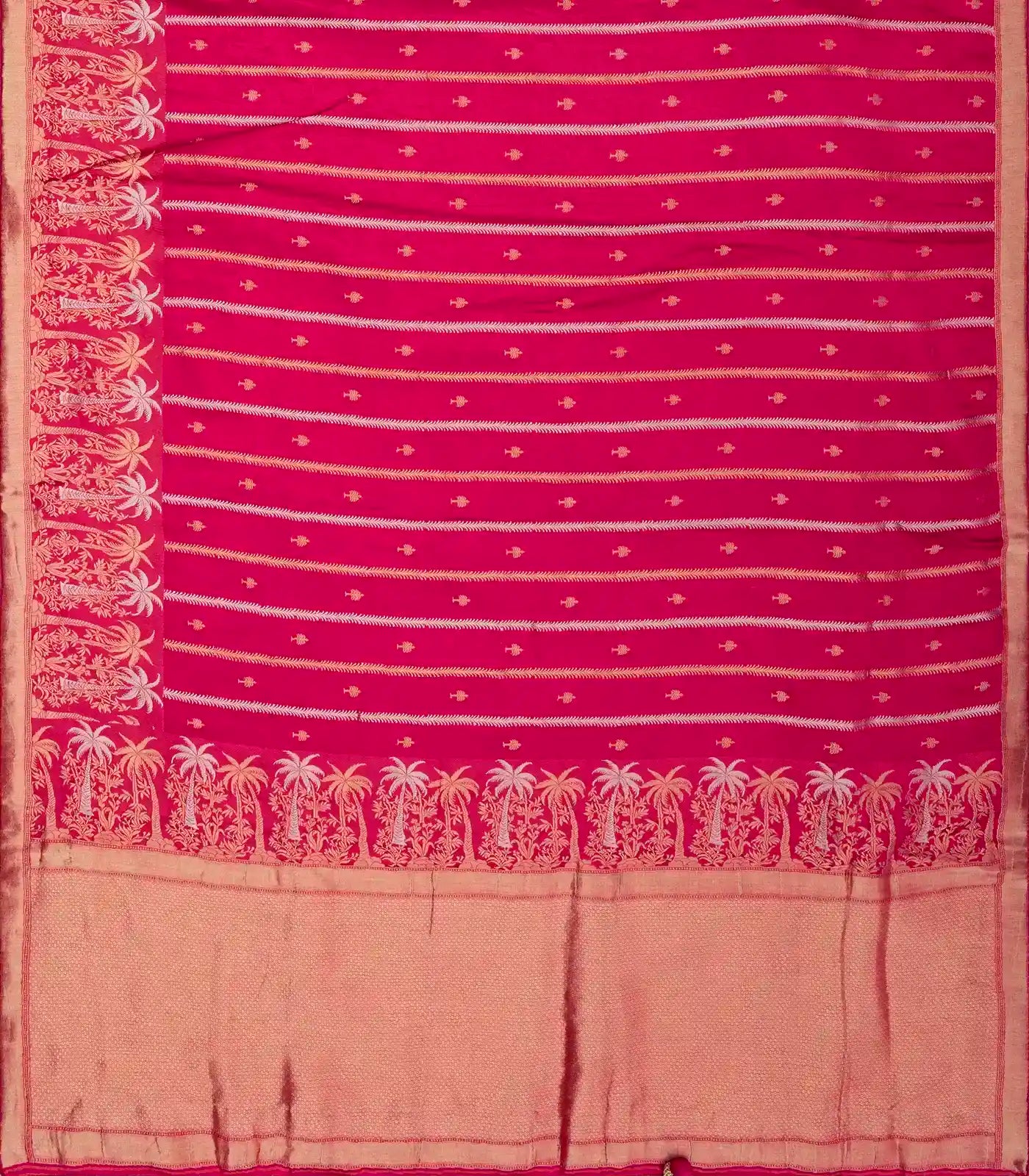 This woven satin crepe saree is filled with zari stripes in hot pink body along with border and pallu embroidered blouse