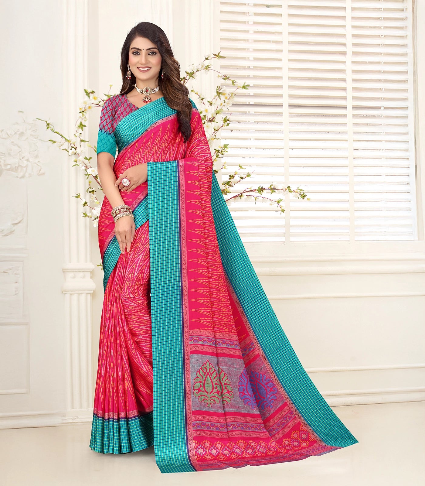 This woven synthetic turkey saree is printed with floral motifs in hot pink body along with border and pallu