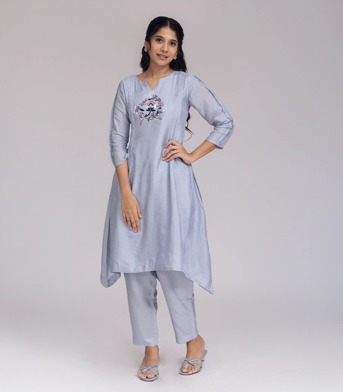 ● Stylised neckline with placement hand embroidery at the centre front ● 3/4th sleeves ● A-line silhouette ● Stylised Hemline ● Paired with matching trousers