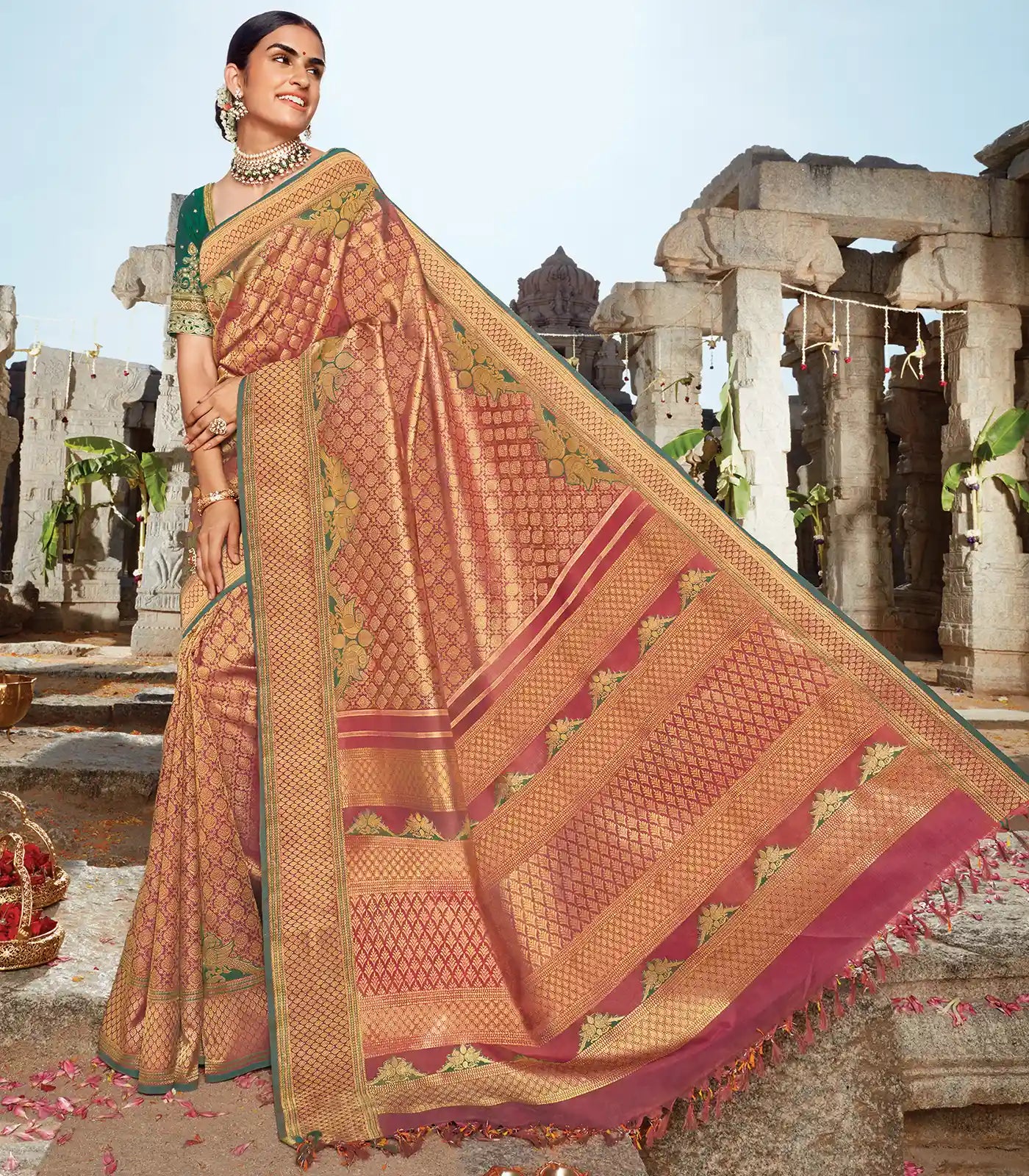 he Uppada Parrot from the Revival Silk Saree Collection is a stunning piece that emanates a regal aura with its vibrant crimson hue. The skillfully woven body features the intricate jacquard weave, which adds to the grandeur of the Uppada Parrot. The crimson shade on the body is derived from the natural ingredient lac. Inspired by the Uppada style, this Kancheepuram silk saree features double parrot motifs that adorn the pallu and border. The green highlights on the pallu and border which elevate the saree's overall look are attained through a unique blend of indigo and mulberry. The mesmerizing motifs with the amalgamation of contrasting colors create an aesthetic look to the Uppada Parrot saree. Embrace the silk heritage of India in your wedding with RmKV revival silk sarees - inspired by the royals and crafted by RmKV Masterweavers.