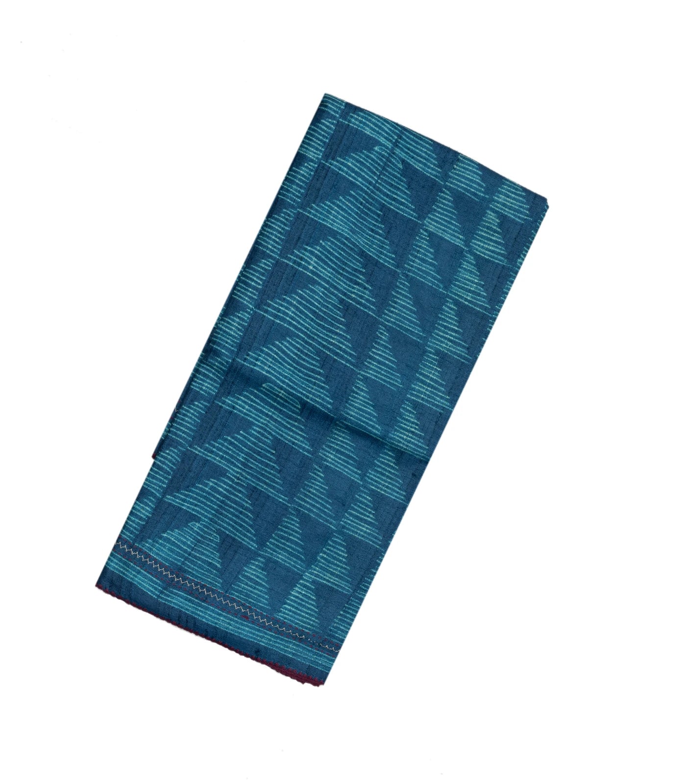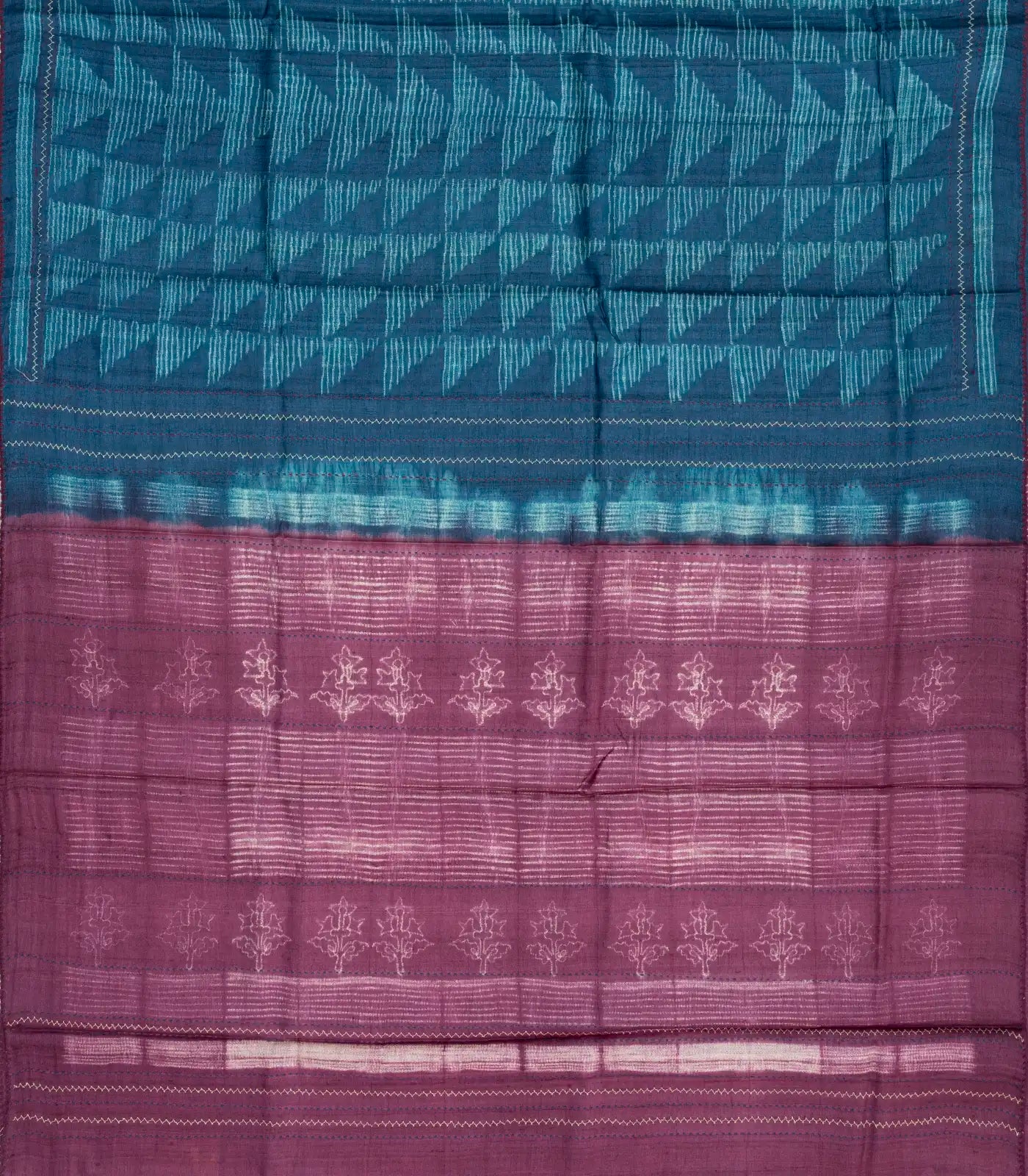 This handwoven tussar silk saree is filled with printed geometric motifs in indigo body along with pallu