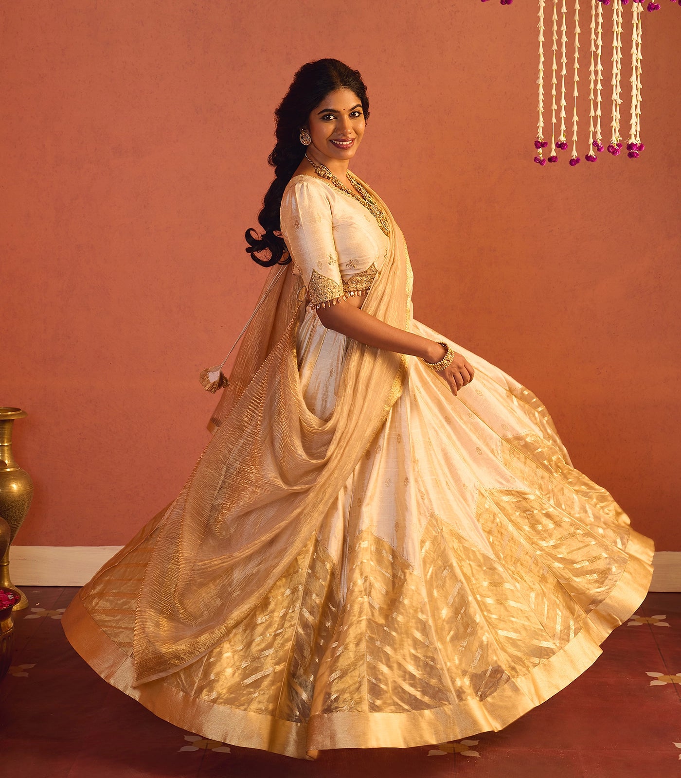 The ensemble is paired with a crushed gold tissue dupatta, finished with a gold border. Light, lustrous, and layered in elegance