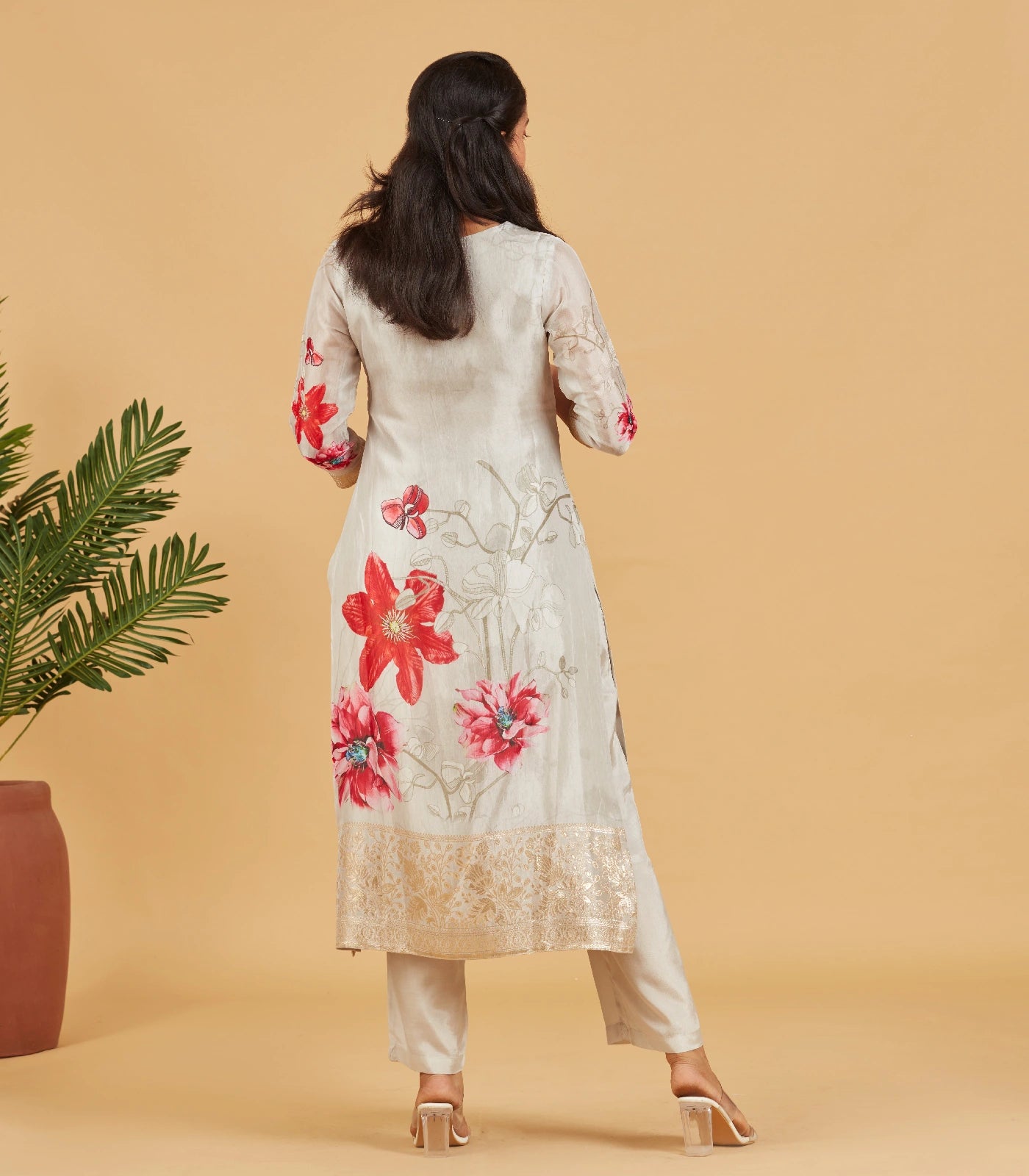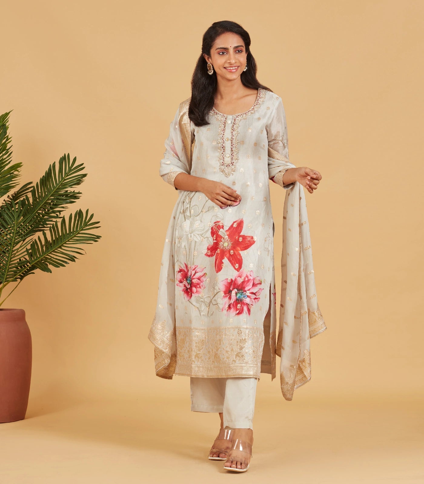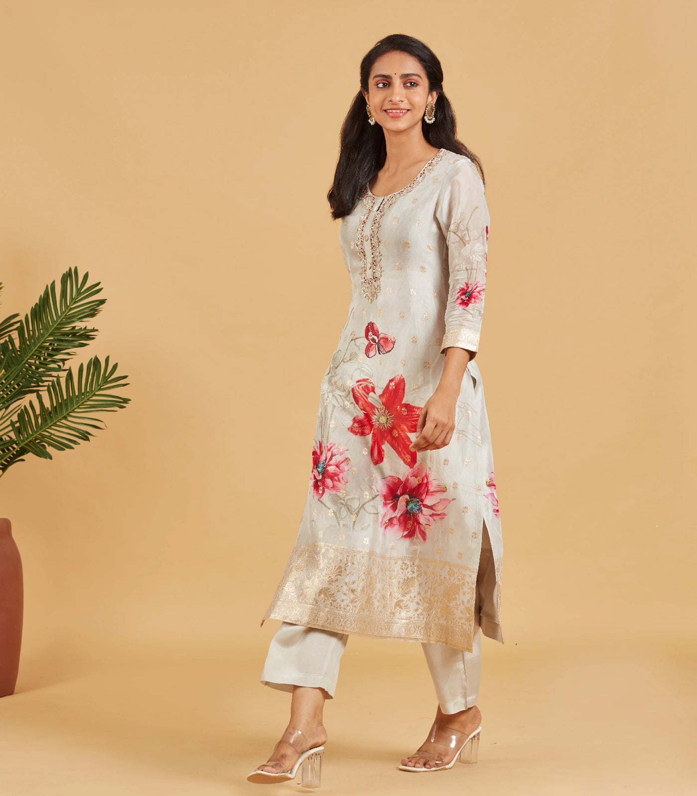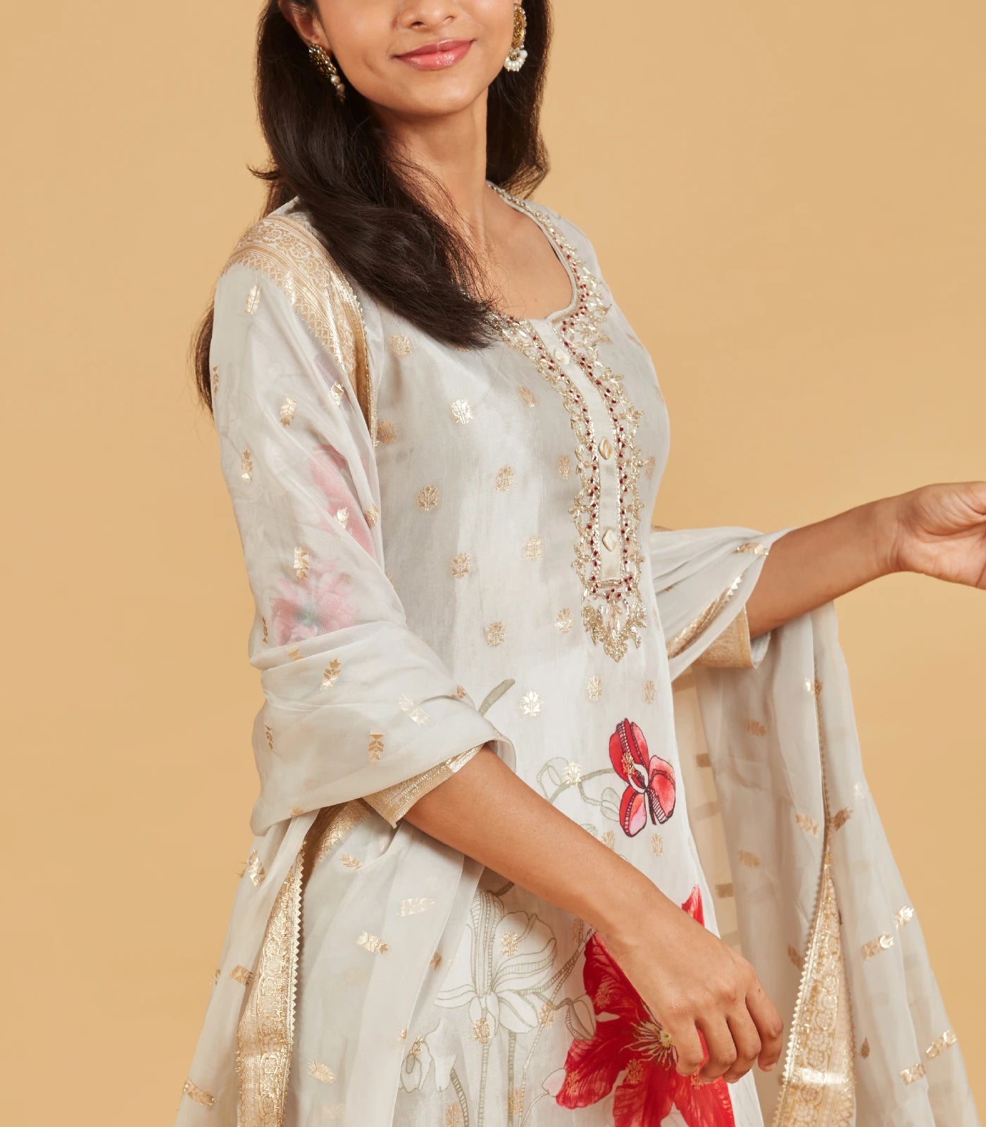 This understated yet elegant kurta set is a study in subtle sophistication. A mesmerizing digital print with gold highlights, reminiscent of a misty morning, adorned with neckline embellishments adding shine. The ensemble, composed of a graceful kurta and chic palazzo pants and a matching dupatta, is a symphony of grey hues. It is designed to make you feel both relaxed and refined.