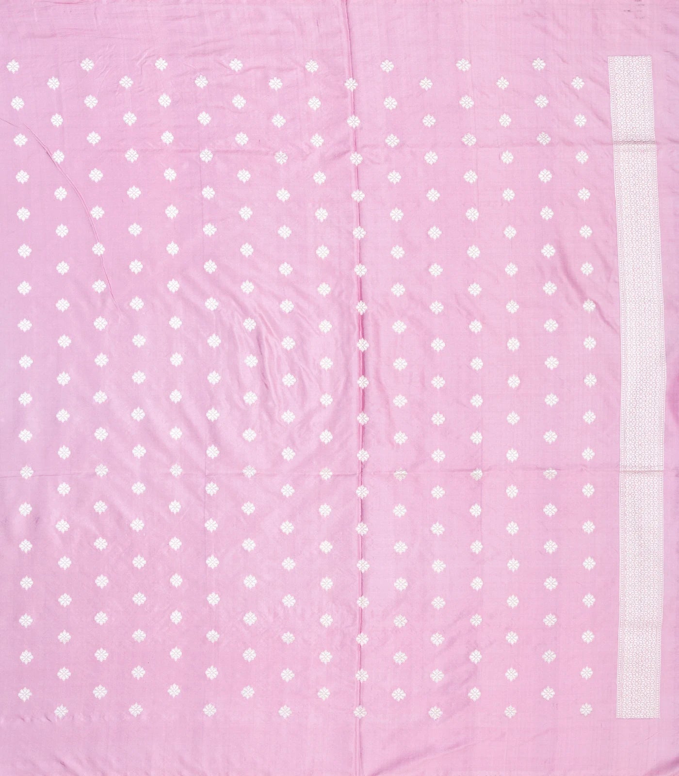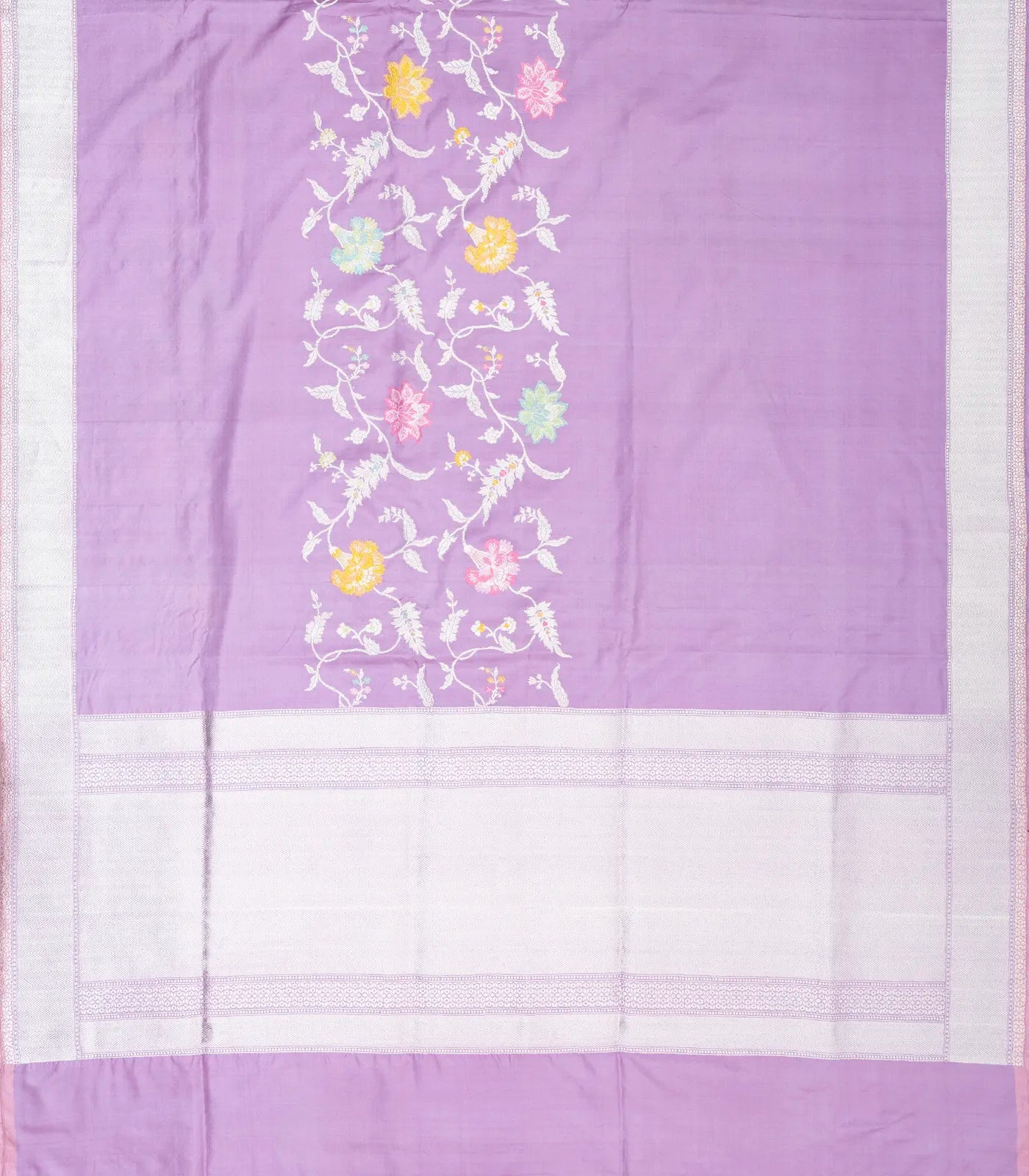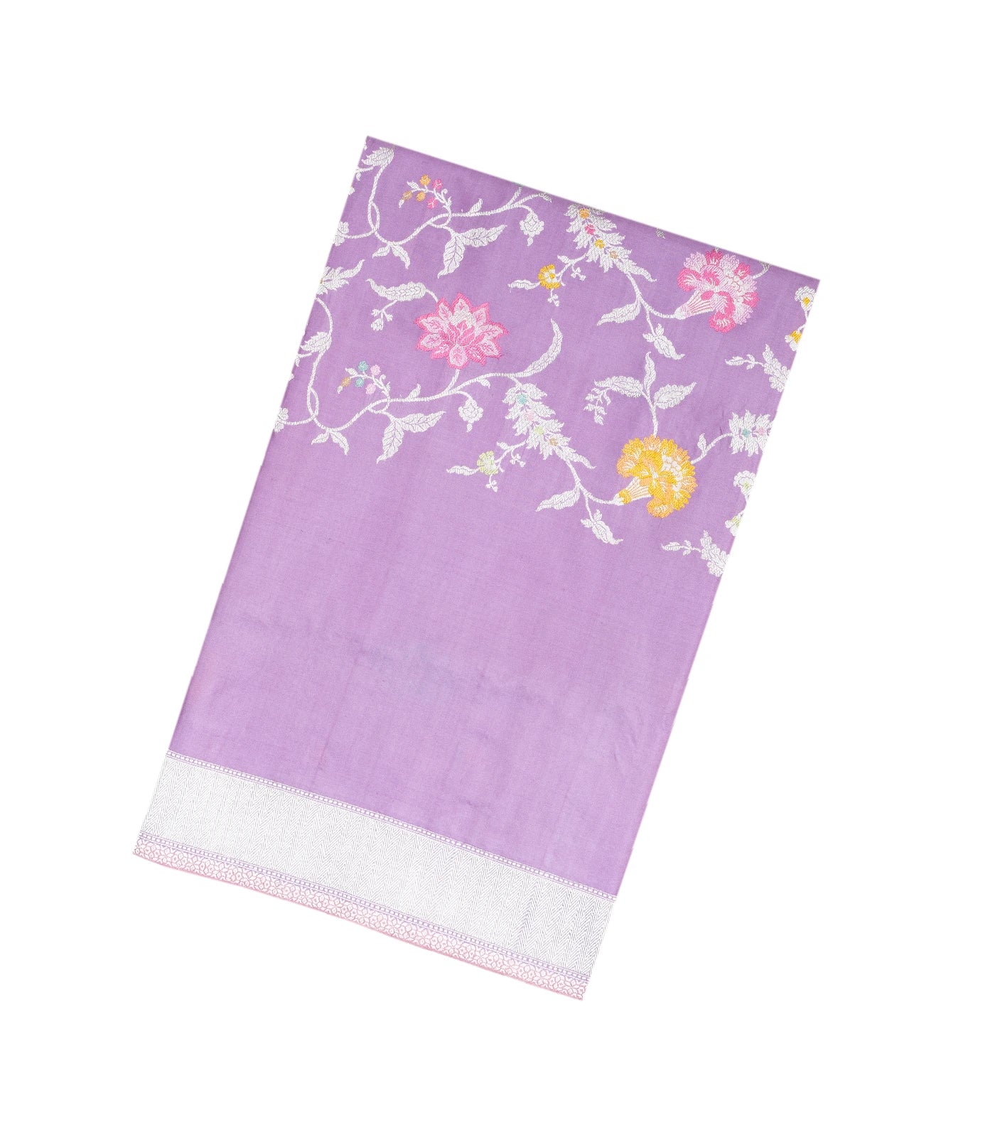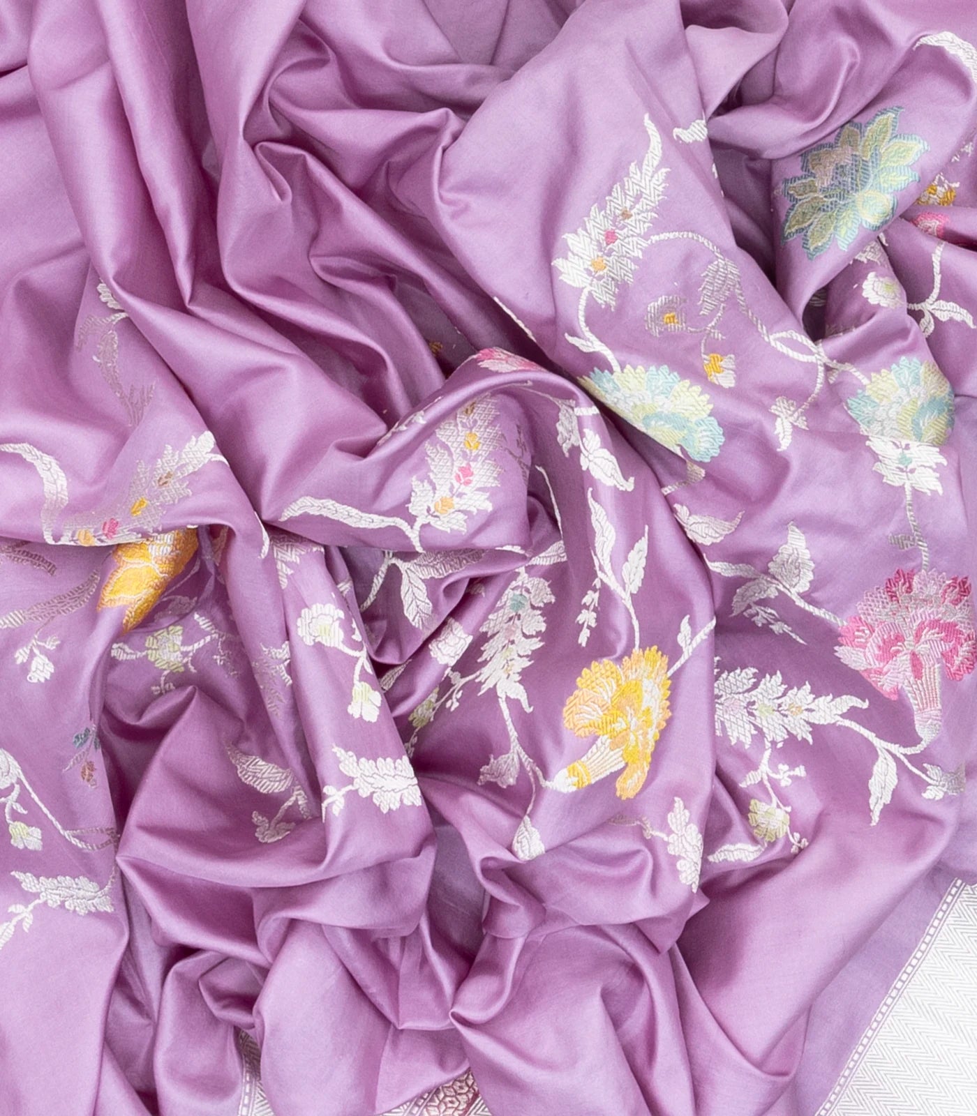 This handwoven banarasi silk saree is filled with meena floral motifs in lavender body along with border and pallu
