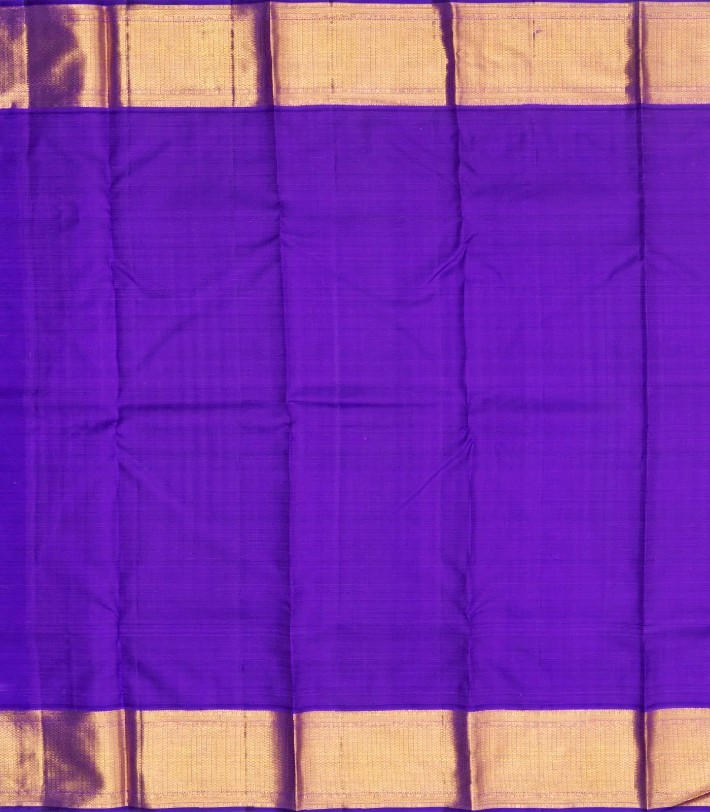 This handwoven kanchipuram korvai silk saree with floral zari motifs in lavender body along with contrast purple border and pallu