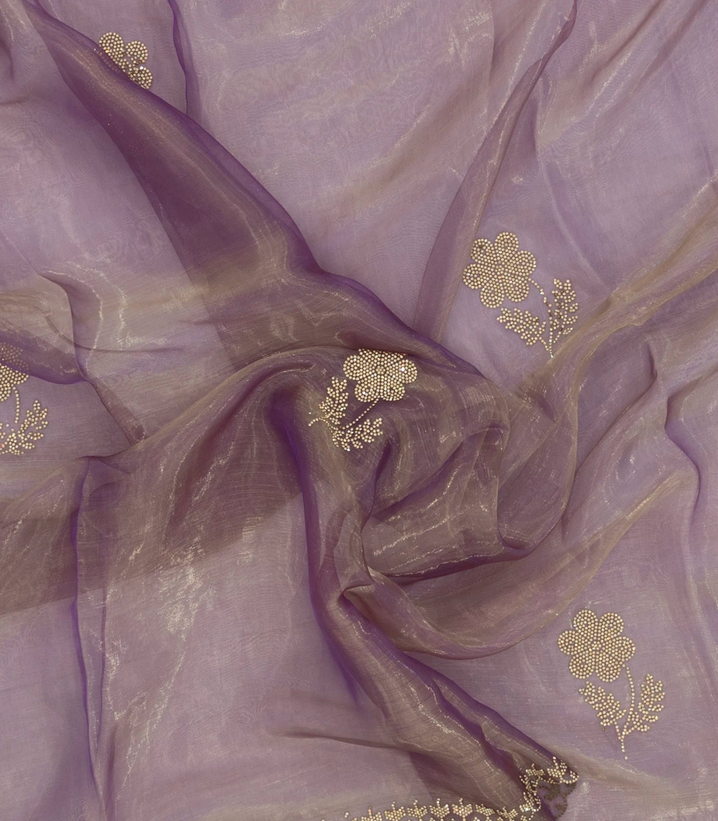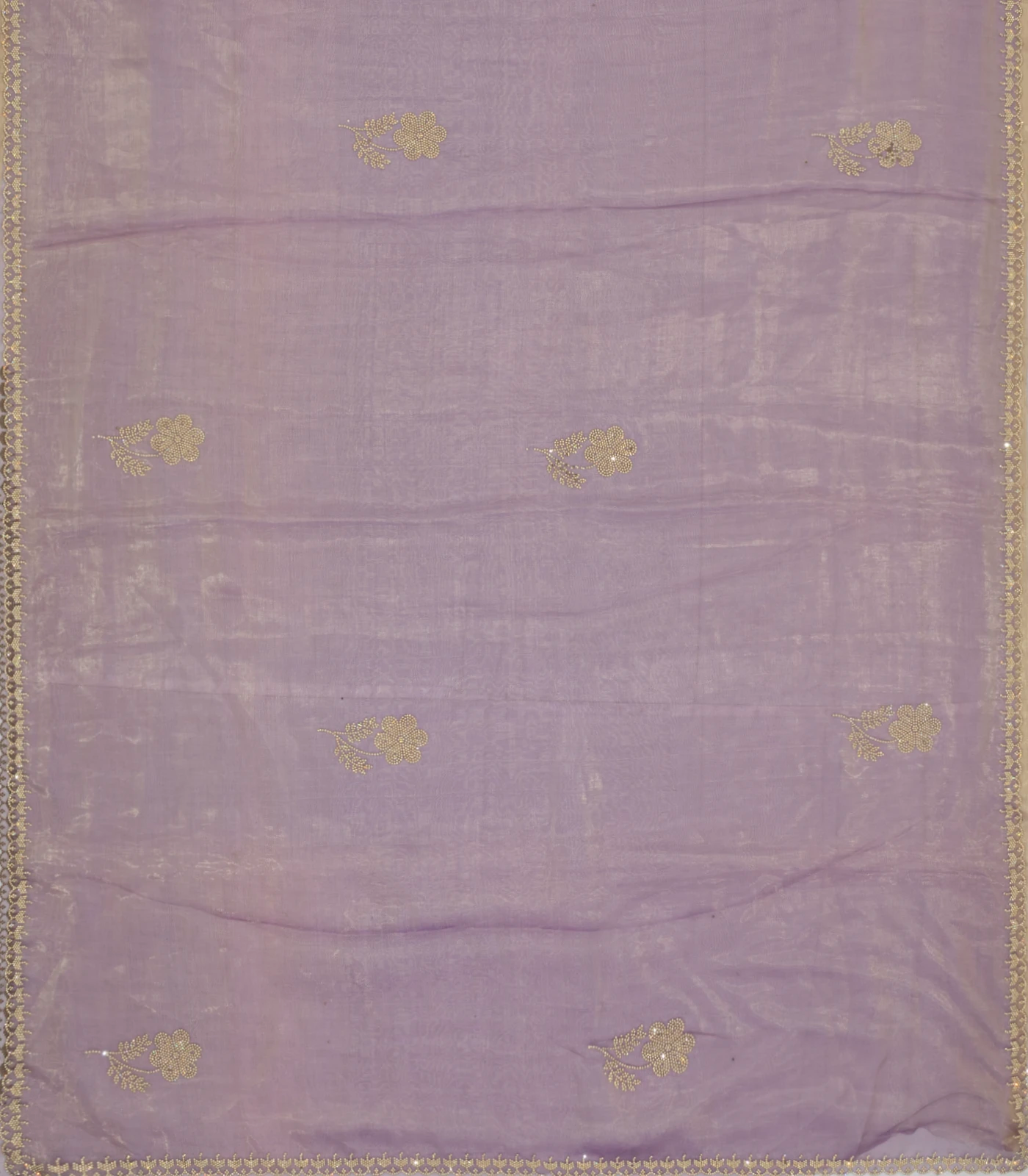 This woven blended organza tissue saree is filled with embroidered floral motifs in lavender body along with pallu