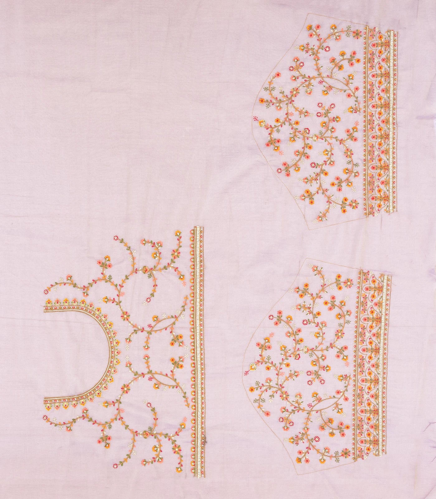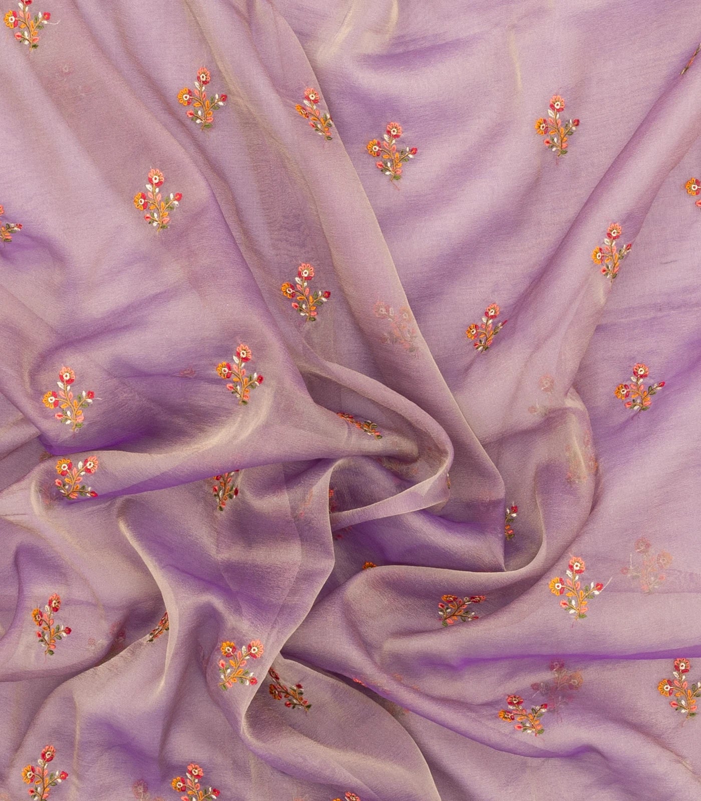 This woven blended tissue saree is filled with embroidered floral motifs in lavender body along with border and pallu