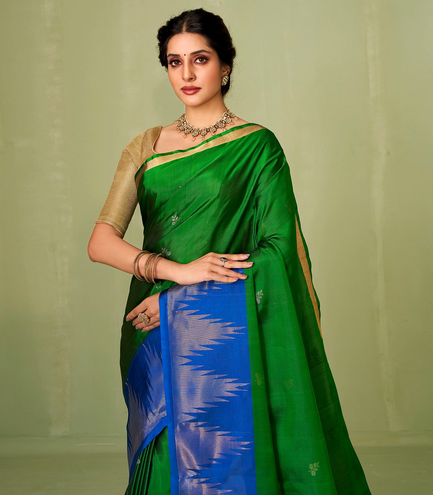 This handwoven soft silk saree is filled with floral motifs in leafy green body along with contrast border and pallu
