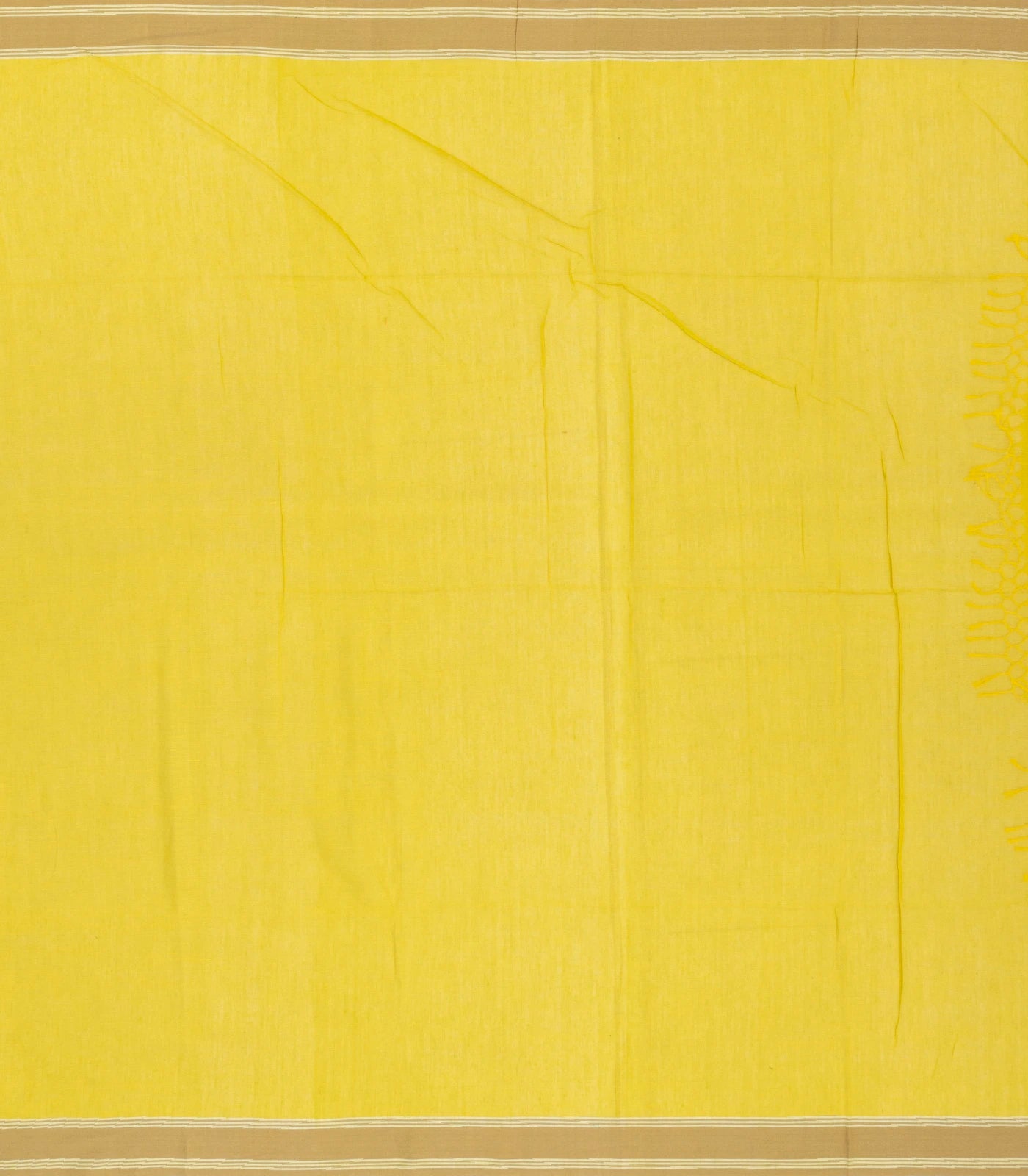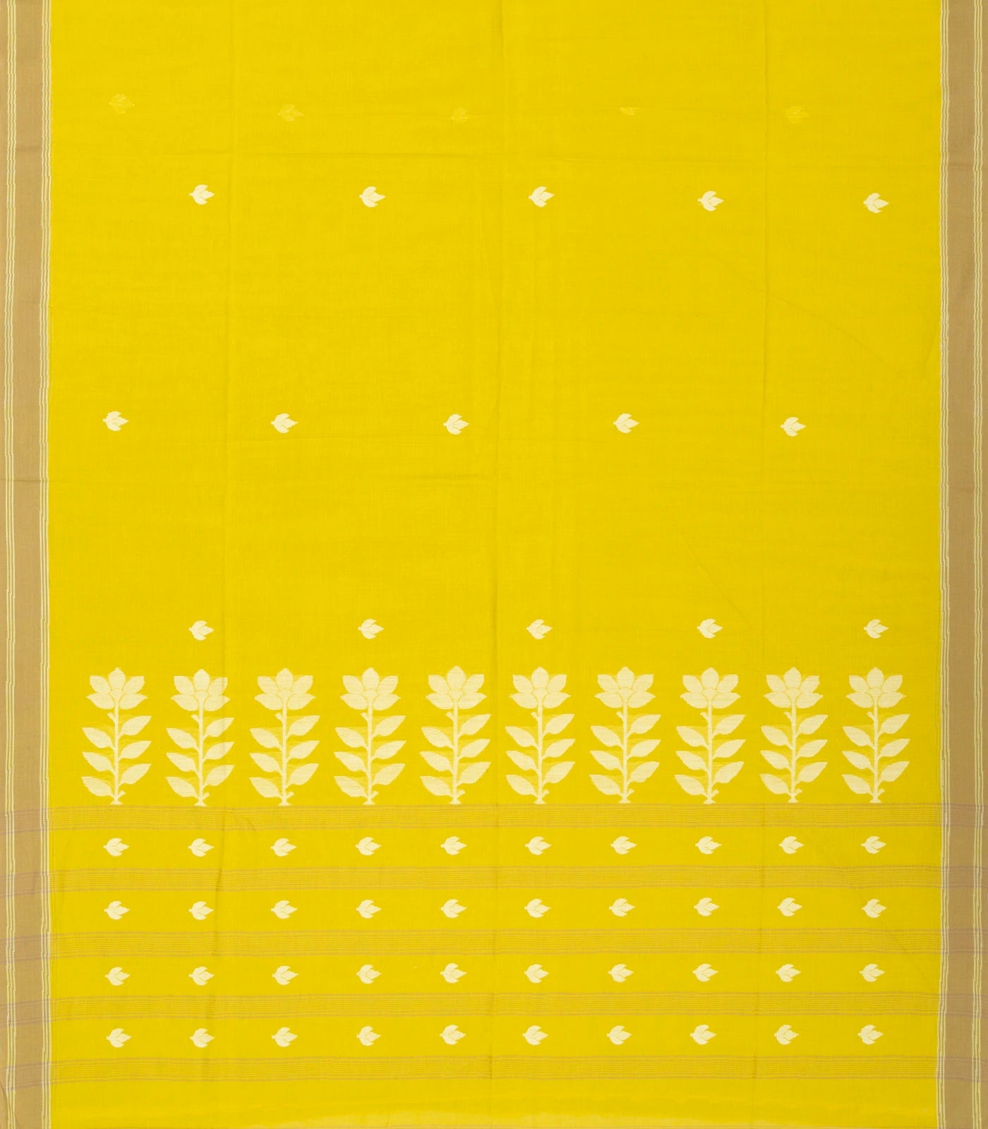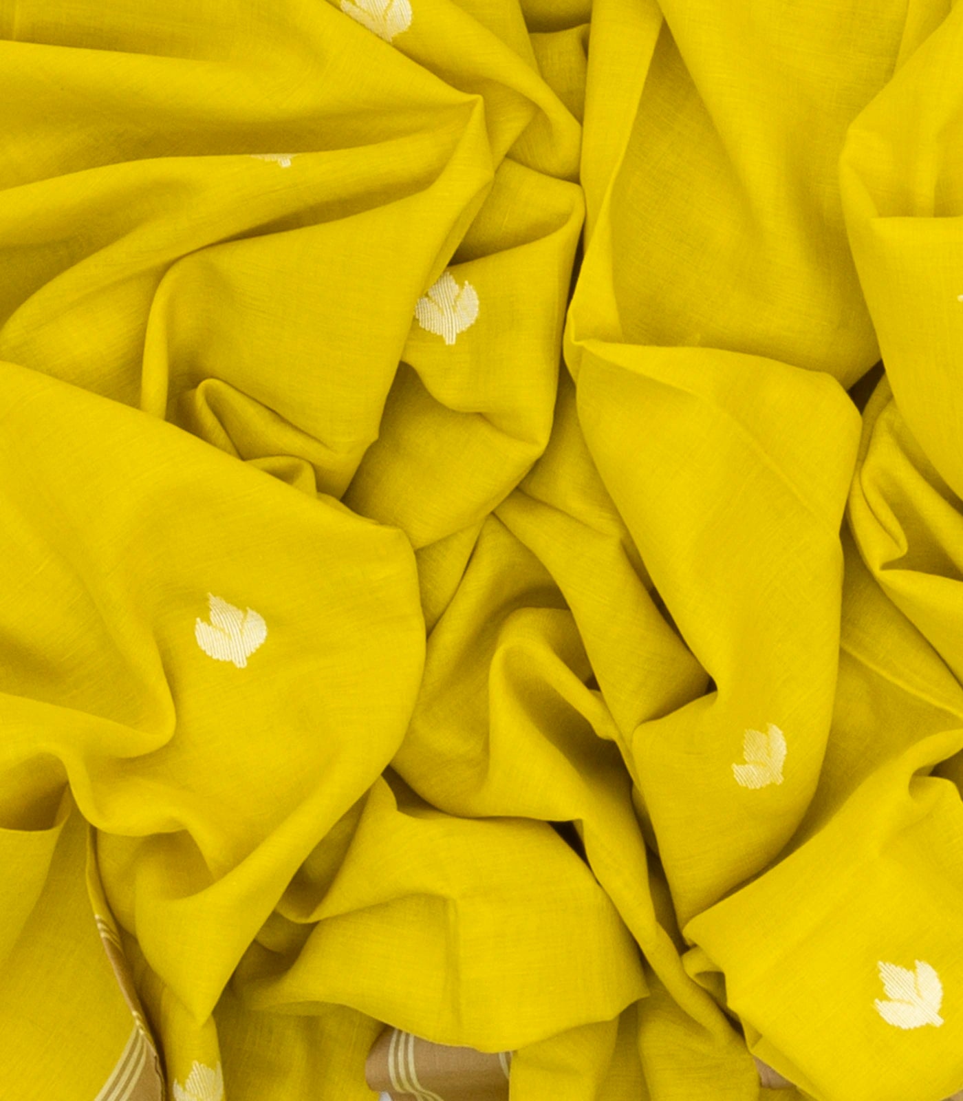 This handwoven bengal cotton saree is filled with buttas in lemon yellow body along with contrast border and pallu