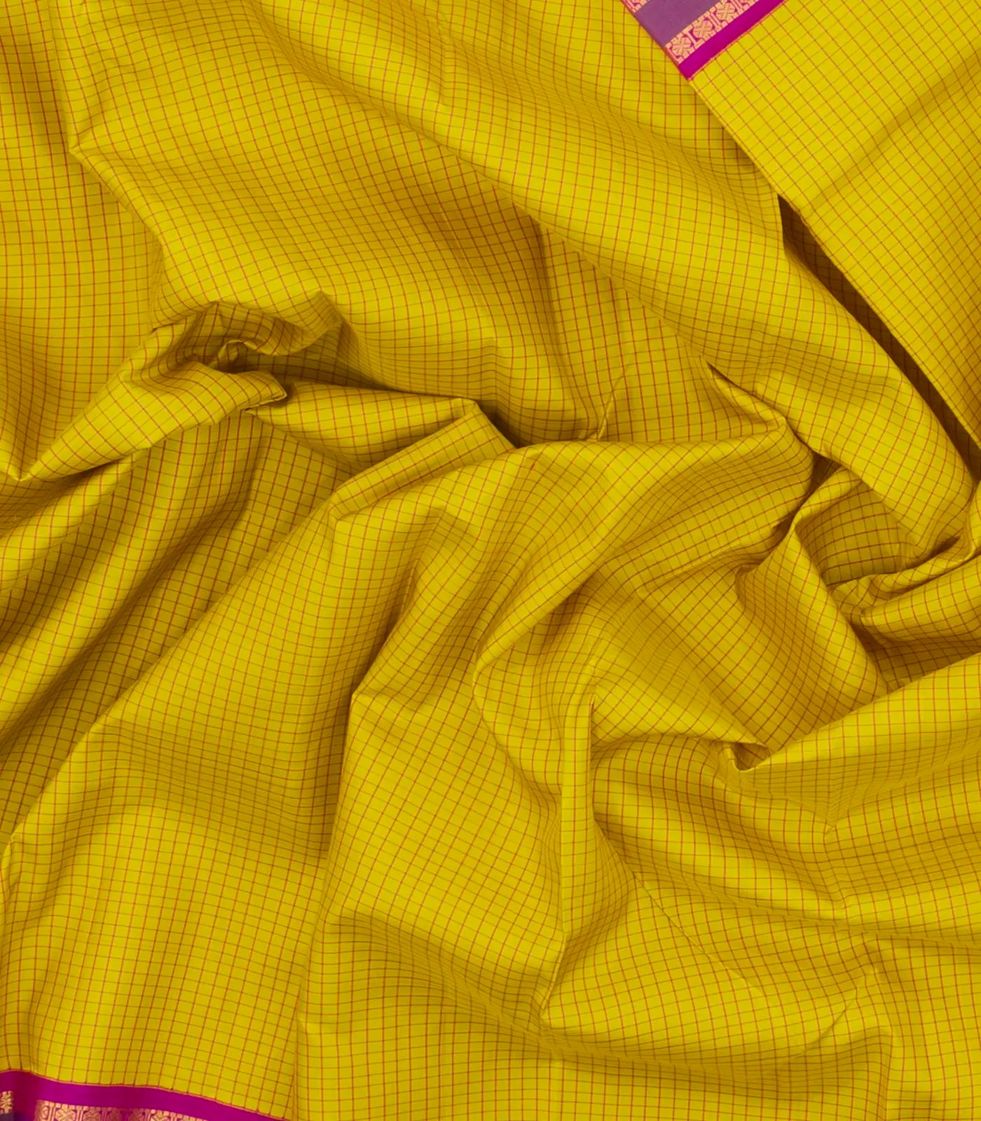 This handwoven korvai kanchipuram silk saree is filled with checks in lemon yellow body along with contrast zari border and pallu