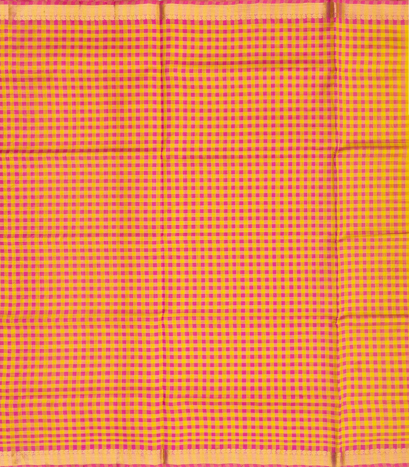 This handwoven silk cotton saree is filled with plain lemon yellow body along with contrast border and checked pallu