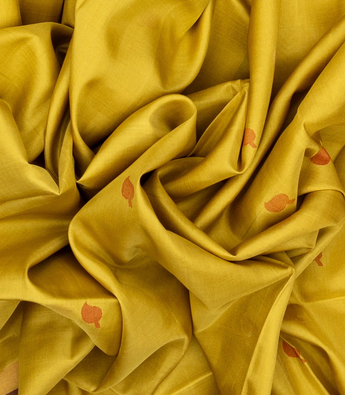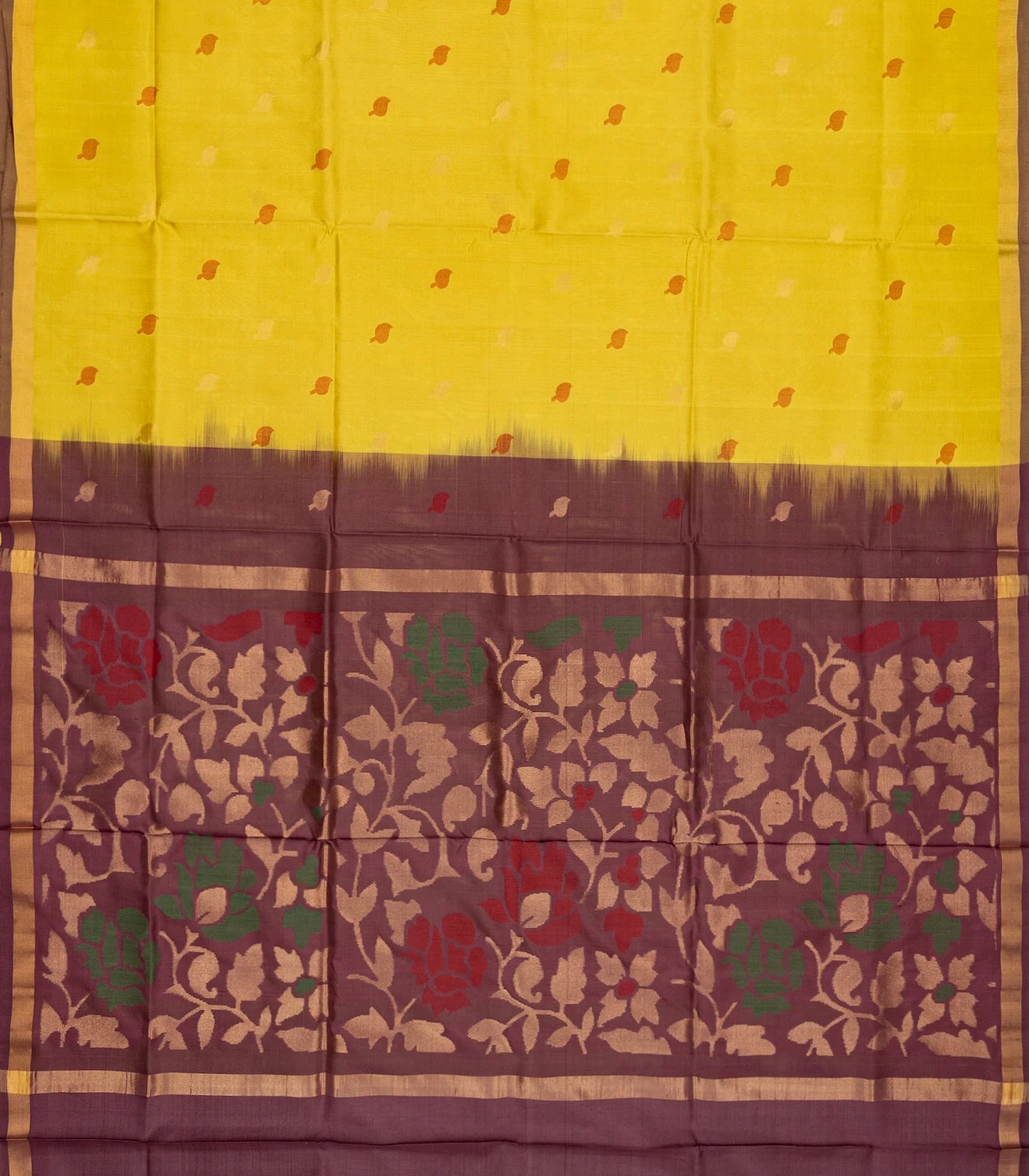 This handwoven uppada silk saree is filled with floral buttas in lemon yellow body along with zari border and maroon pallu
