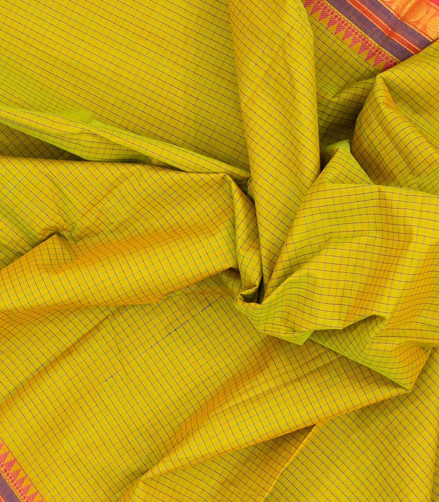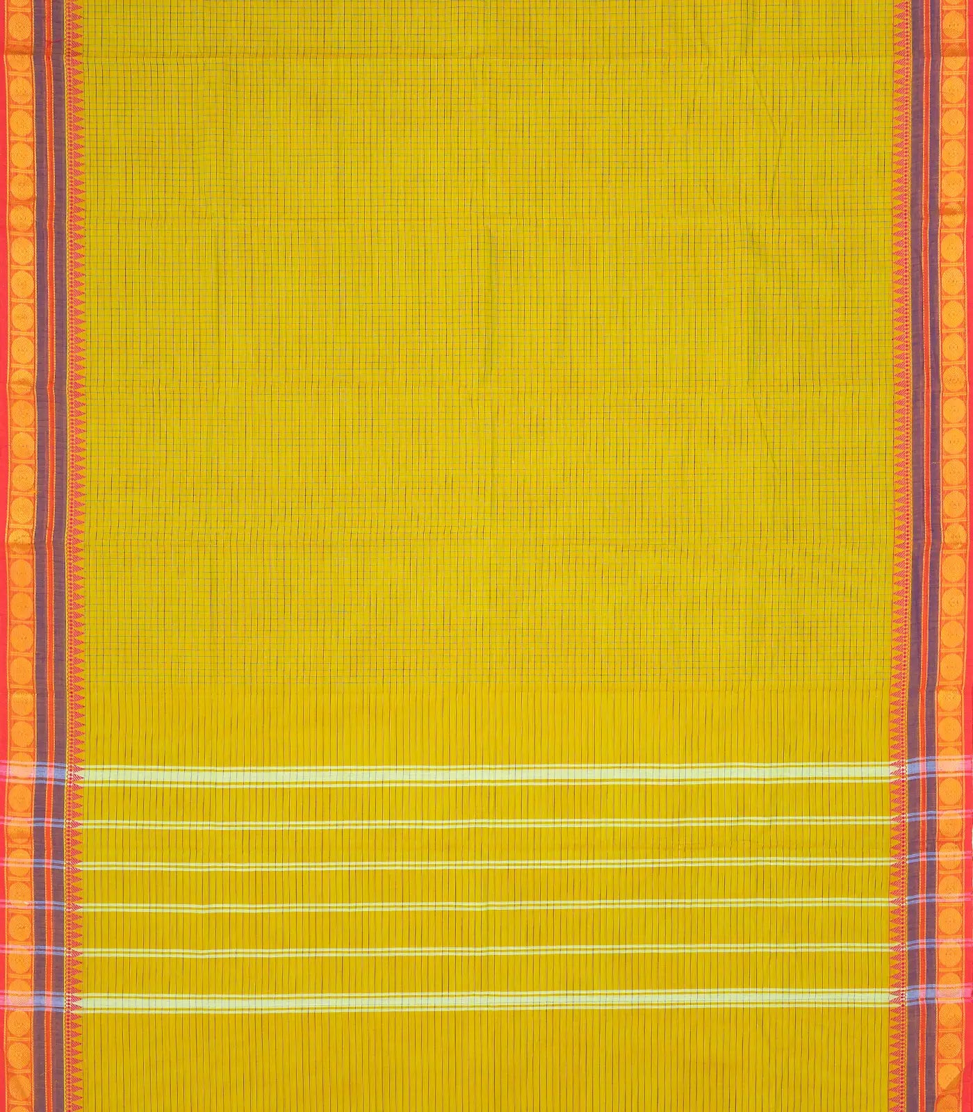 Lemon Yellow Woven Chettinad Cotton Saree With Checks & Contrast Border-CN1768