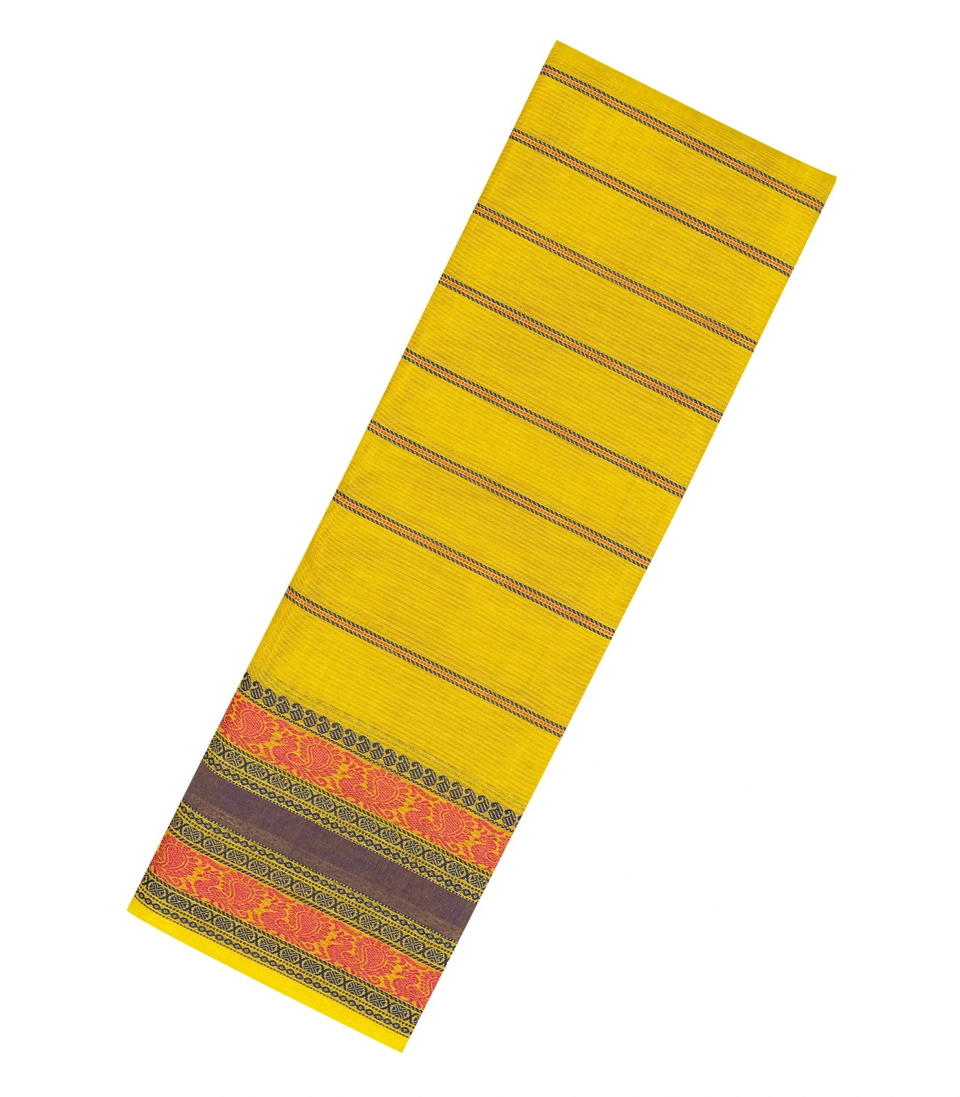 This woven chettinad cotton saree is filled with stripes in lemon yellow body along with border and pallu