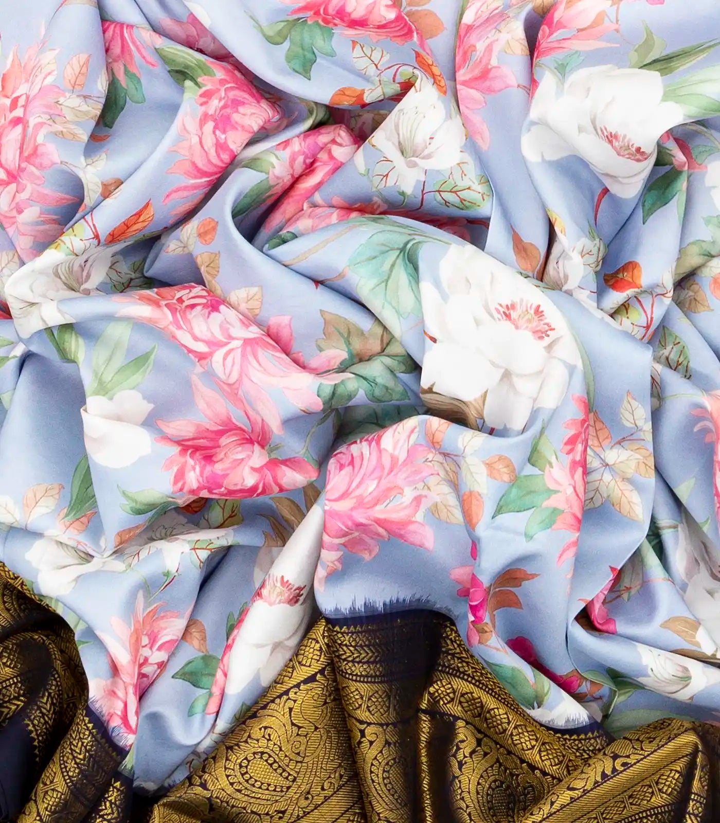 This handwoven kanchipuram korvai silk saree is printed with floral motifs in light blue body along with contrast black border and pallu