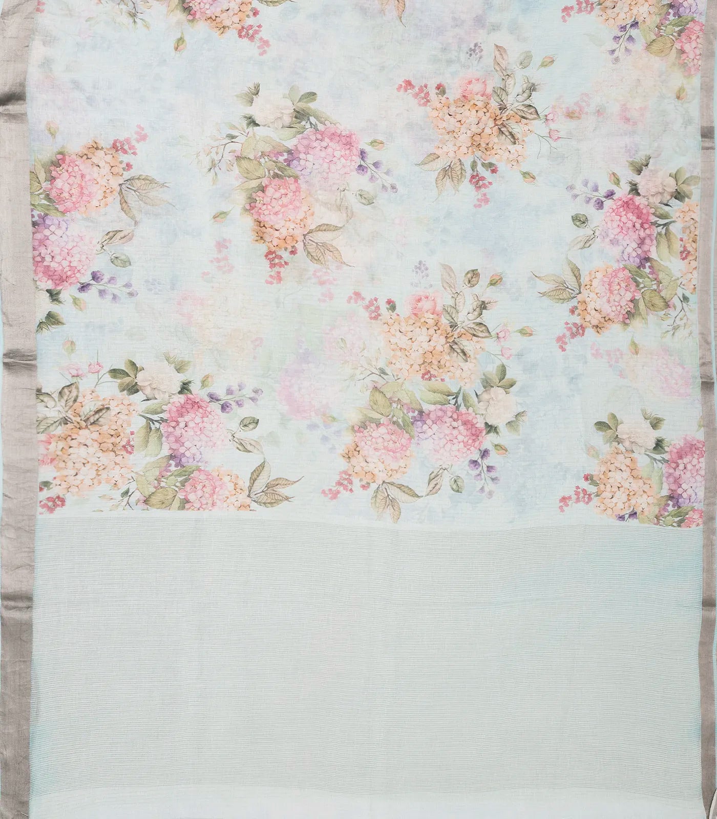 Light Blue Handloom Linen Saree With Printed Floral Motifs