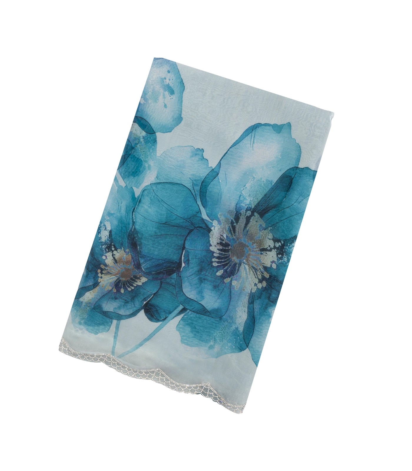 This woven blended chiffon saree is filled with printed floral motifs in light blue body along with embroidered selvage & pallu