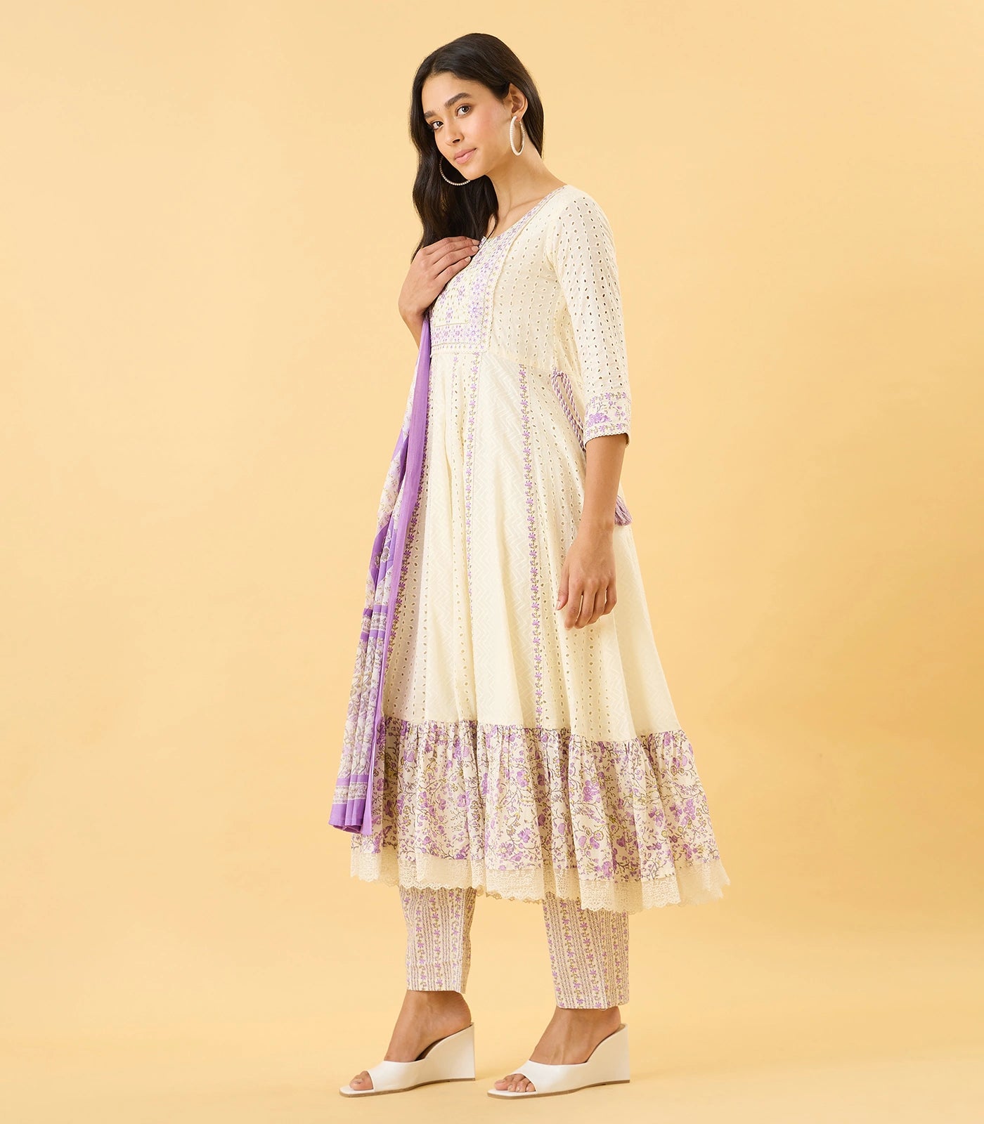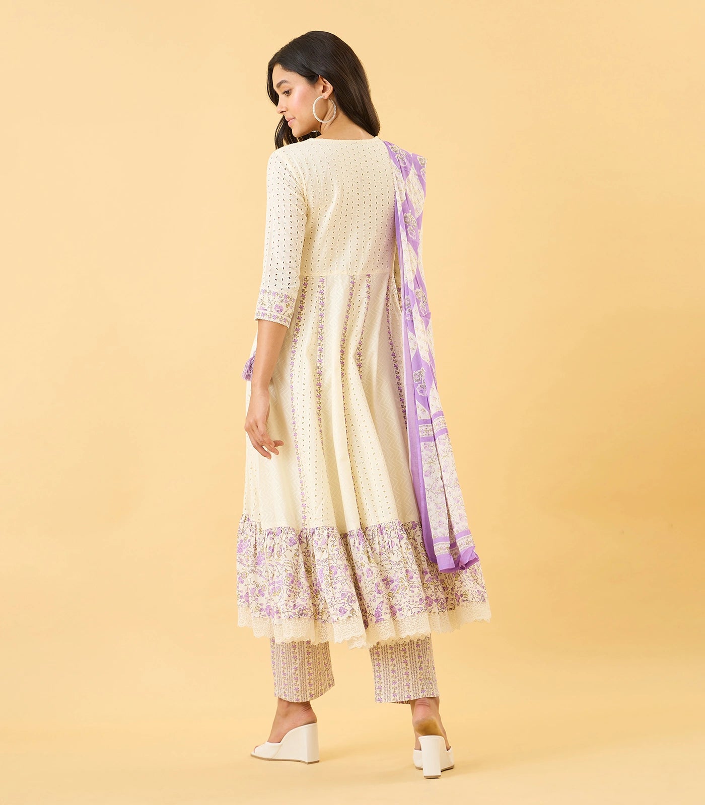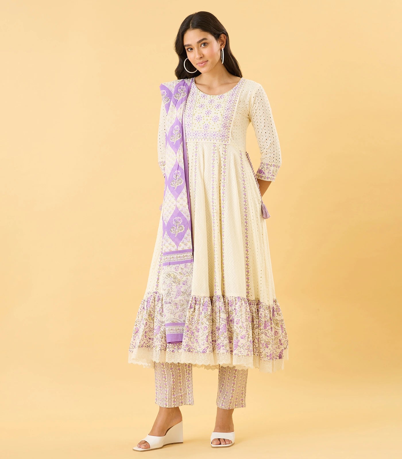 Light Cream And Lavender Embroidered Schiffli Anarkali Set