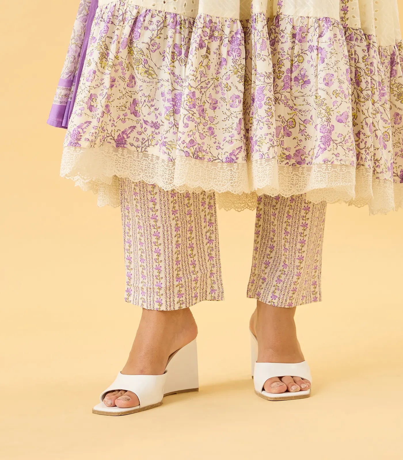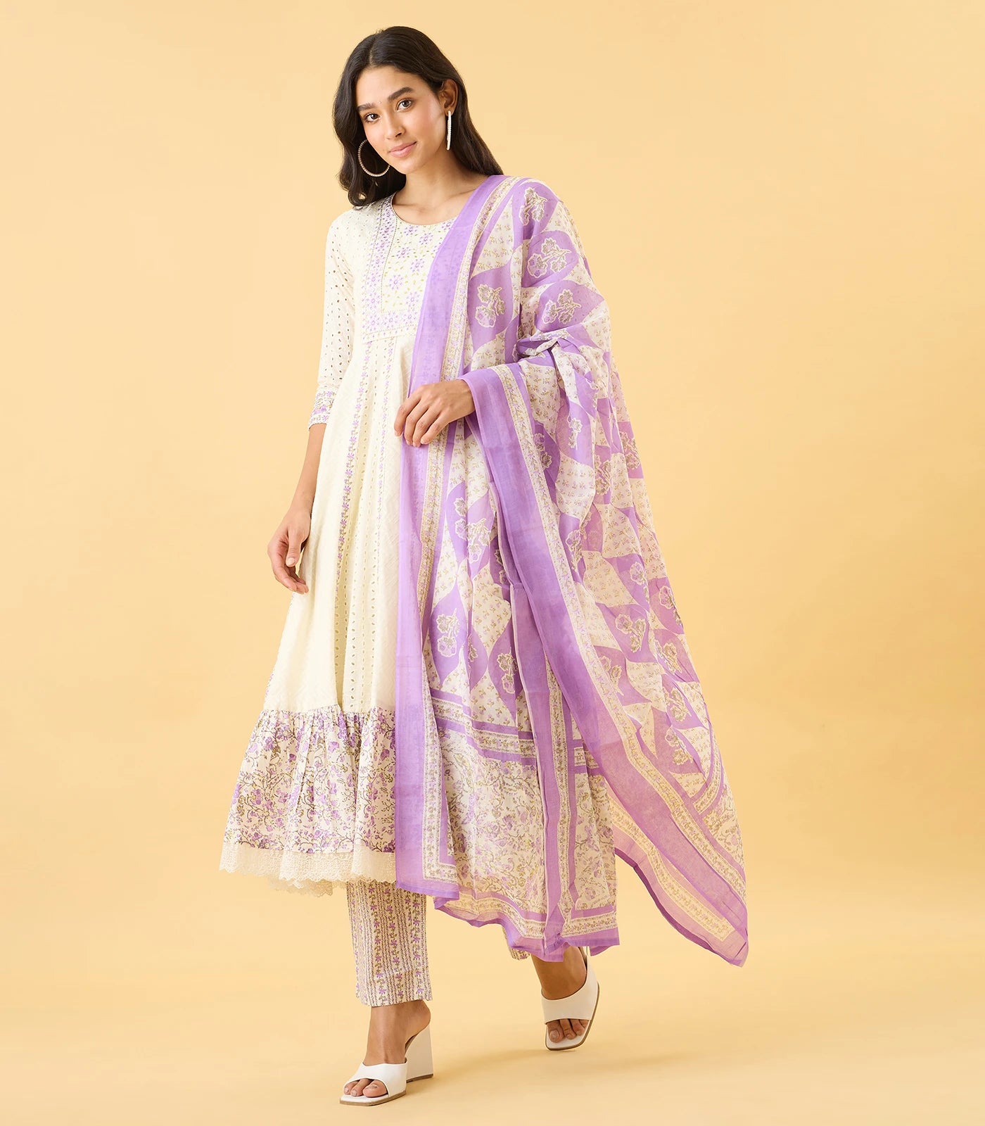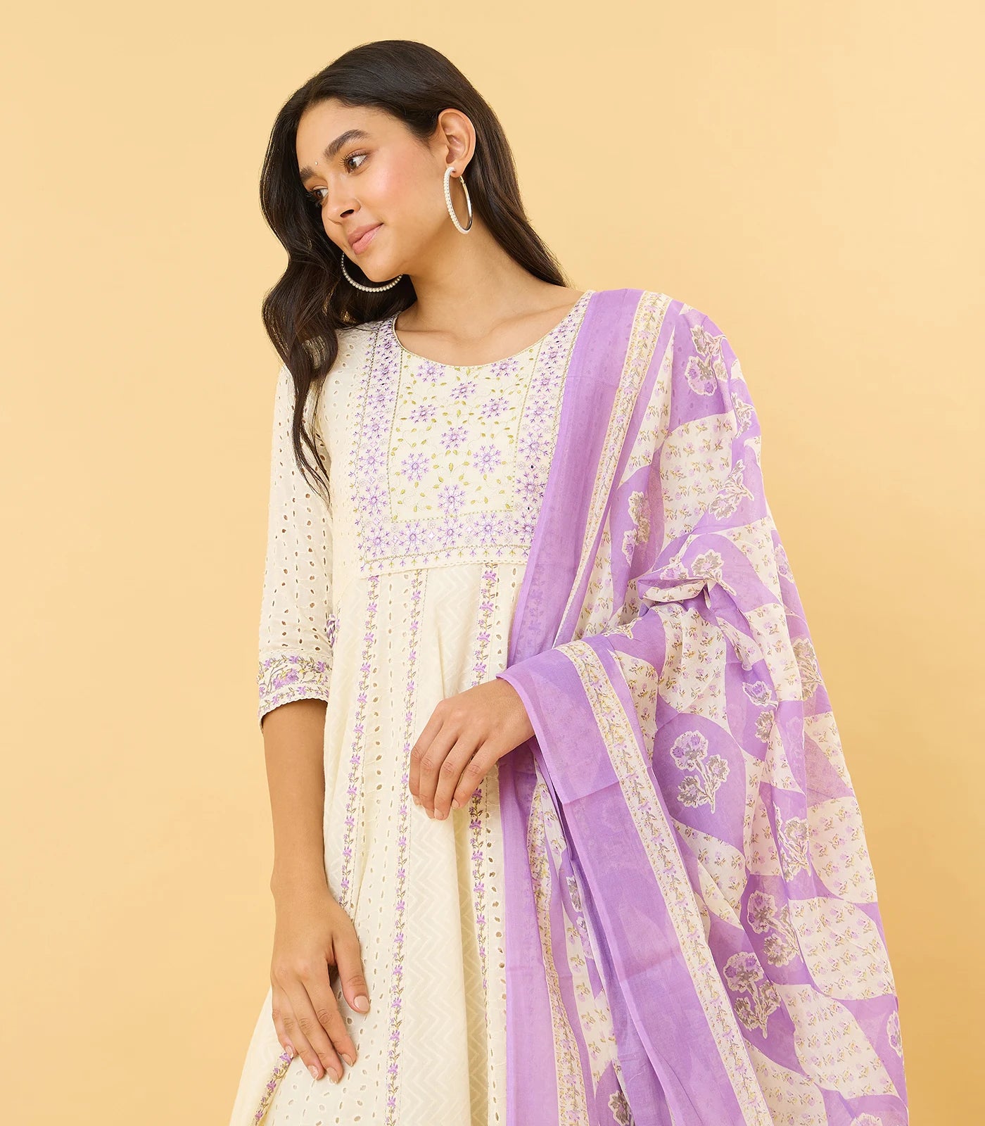Light Cream And Lavender Embroidered Schiffli Anarkali Set