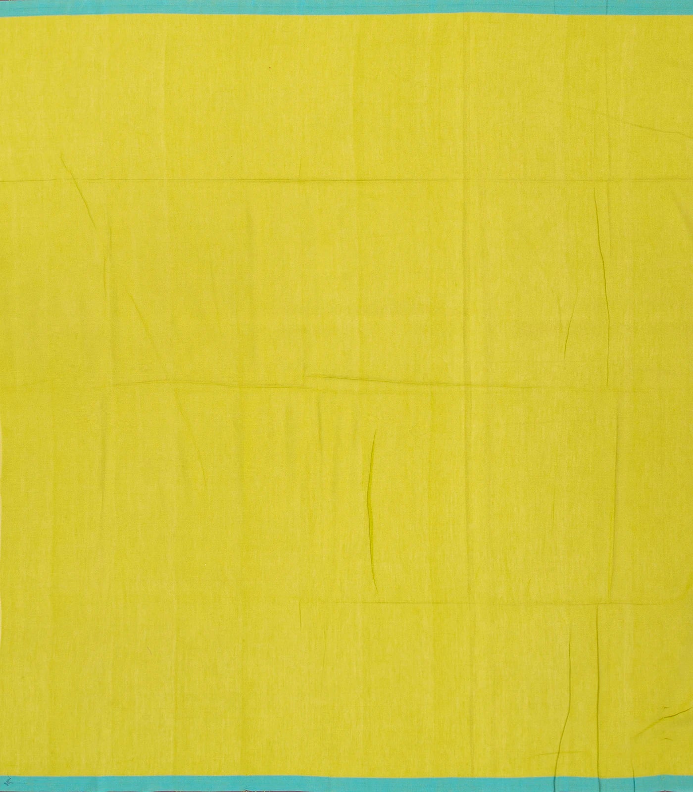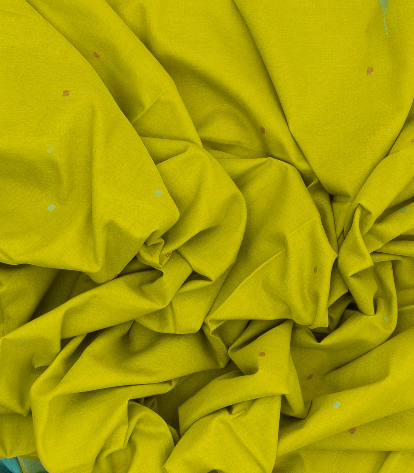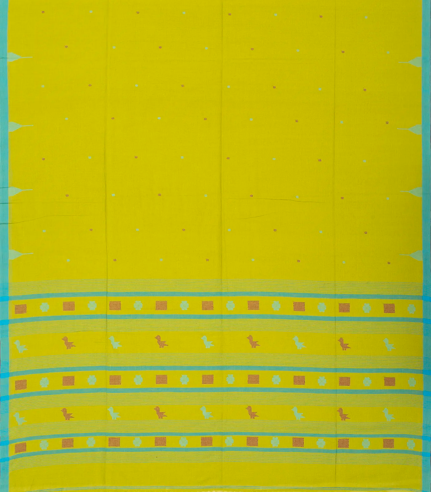 This handwoven bengal cotton saree is filled with coin buttas in light green body along with contrast temple border and pallu