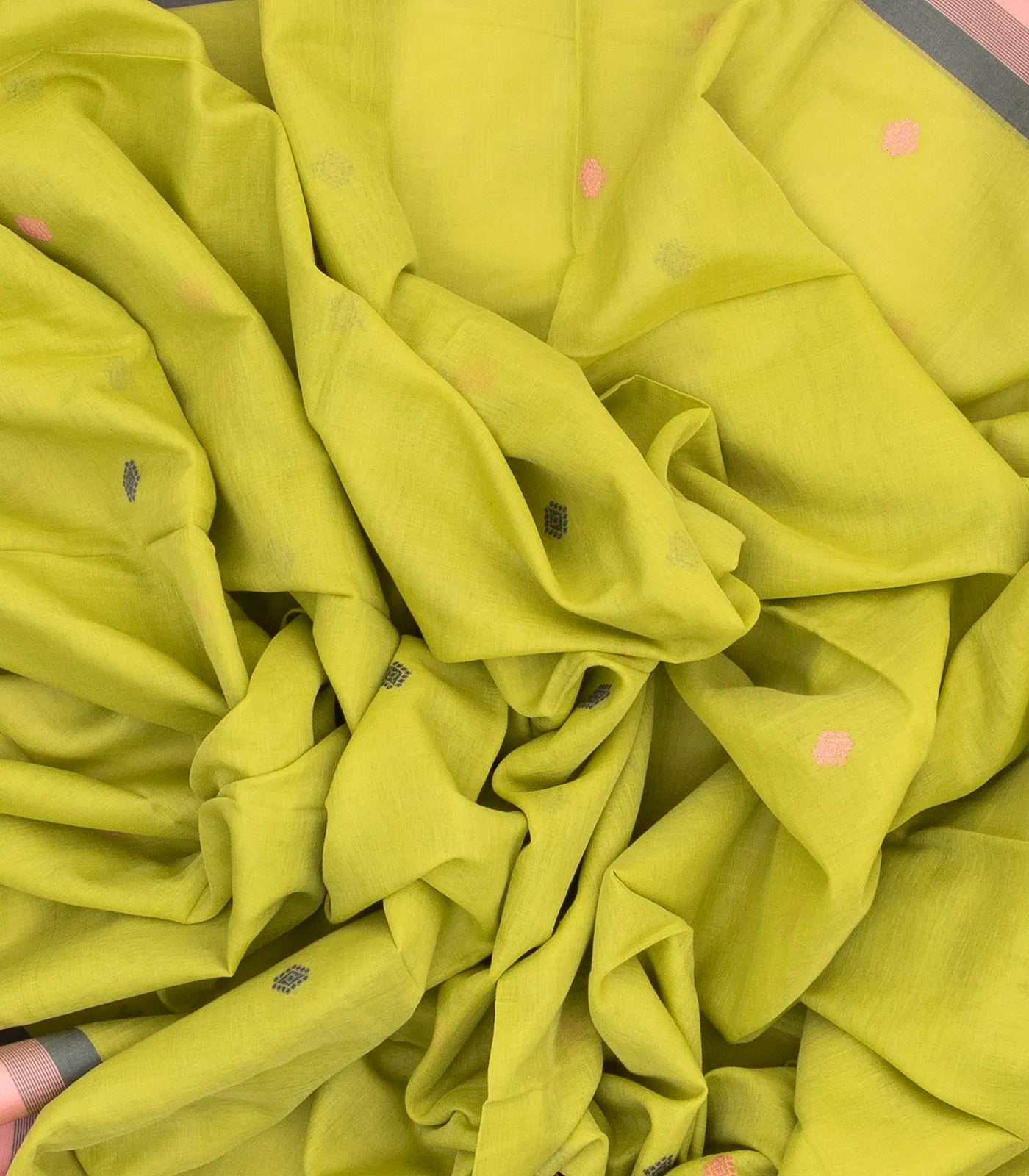 This handwoven bengal cotton saree is filled with diamond buttas in light green body along with contrast border and pallu