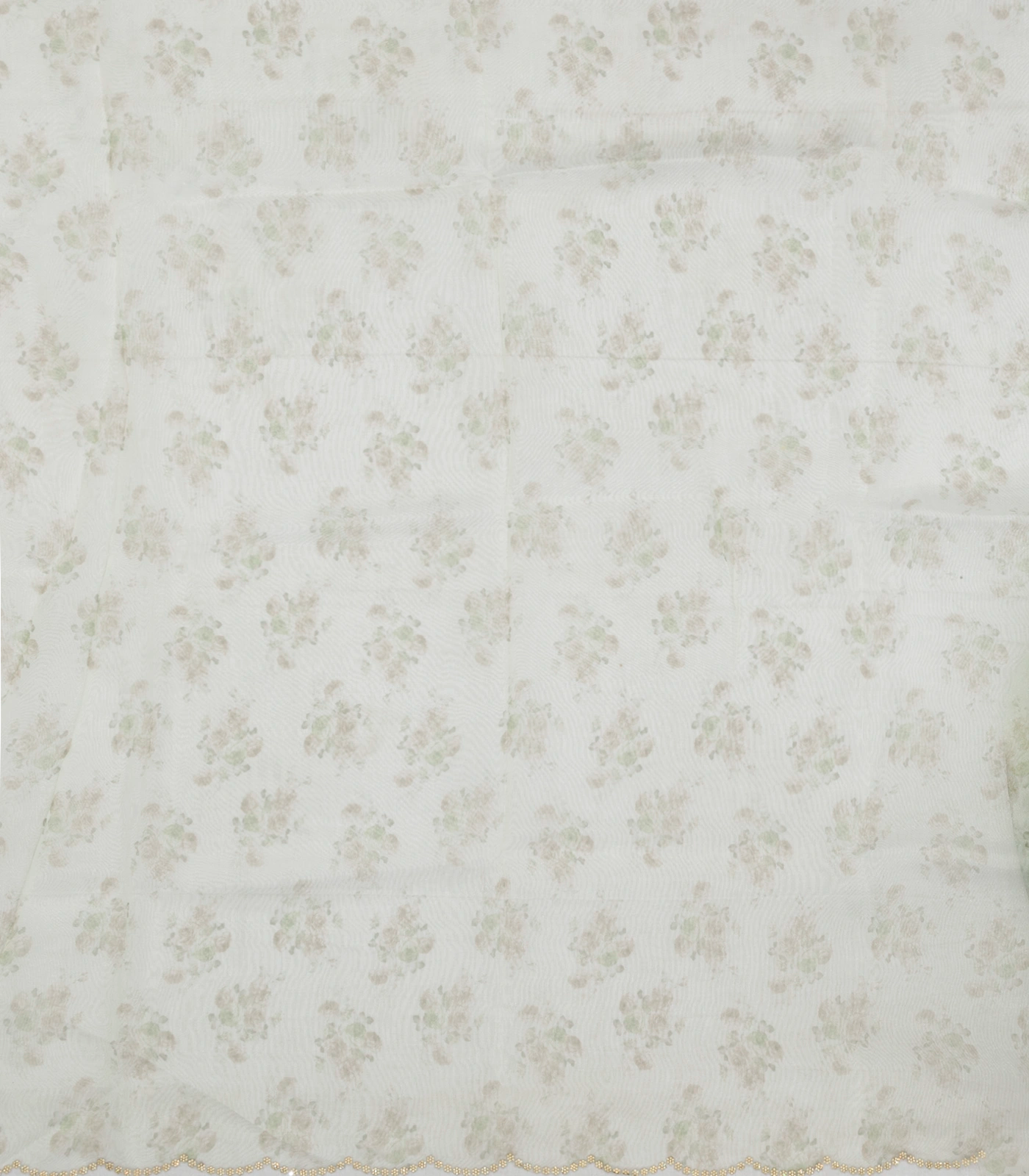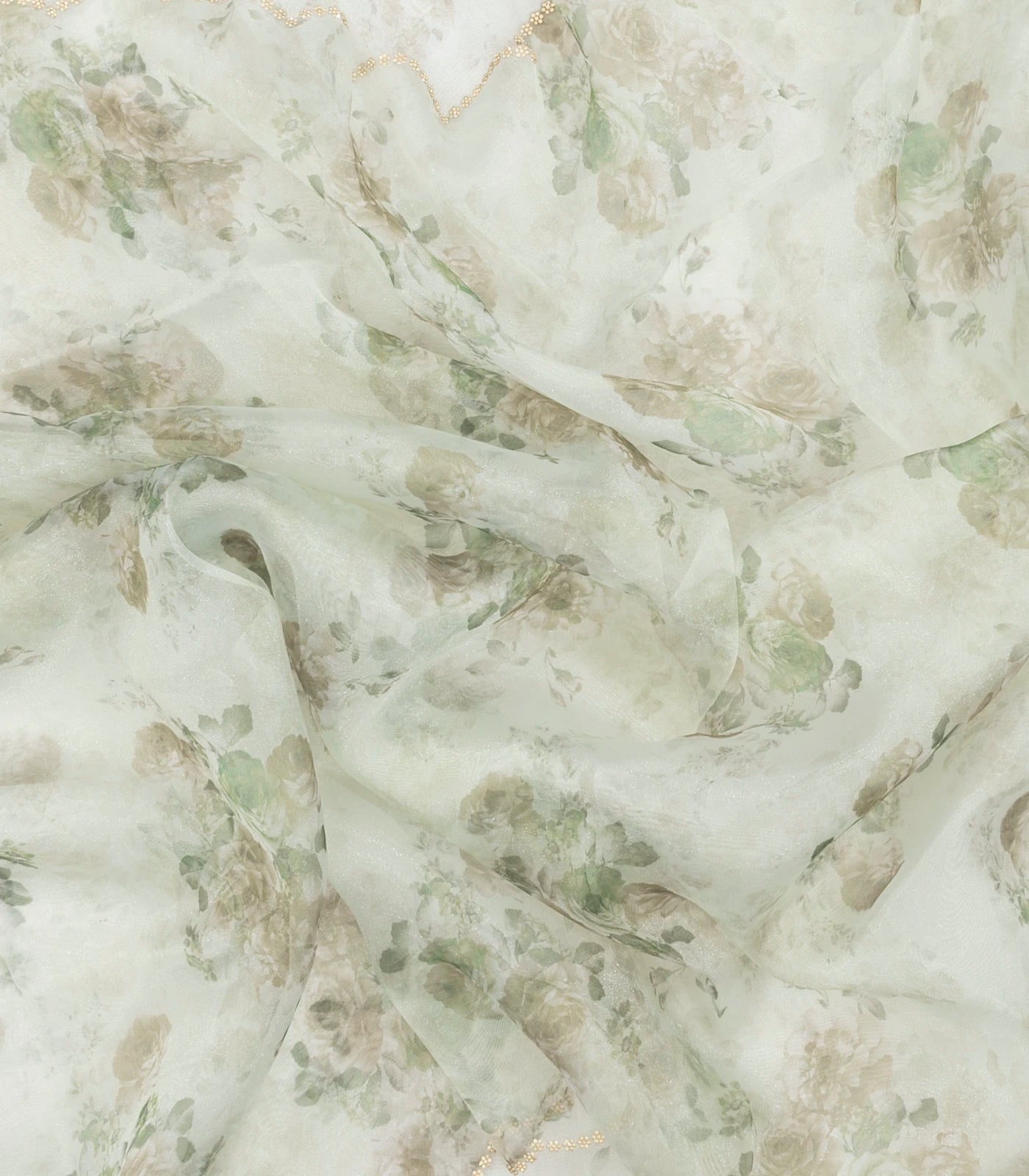 This woven blended chiffon saree is filled with printed floral motifs in light green body along with embroidered selvage & pallu
