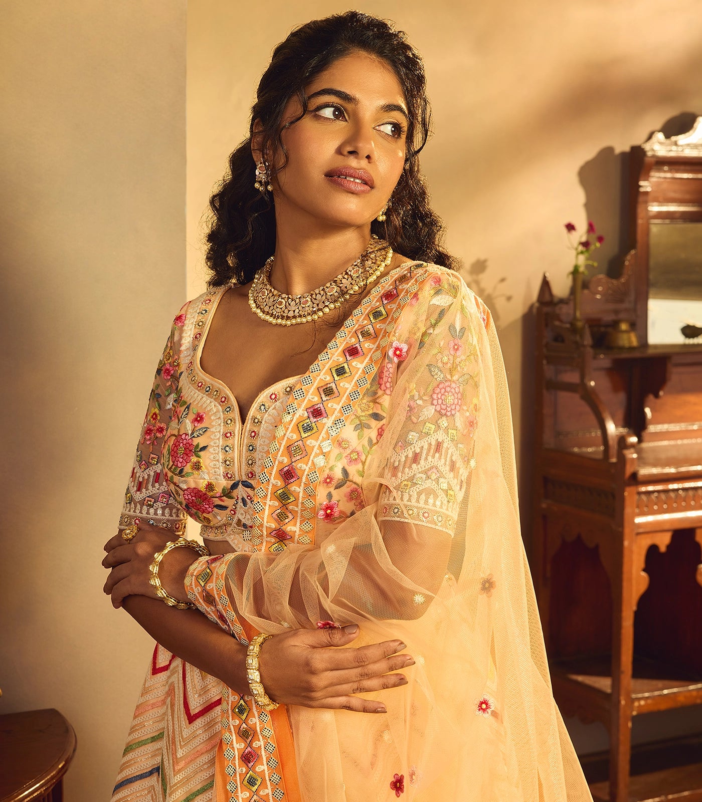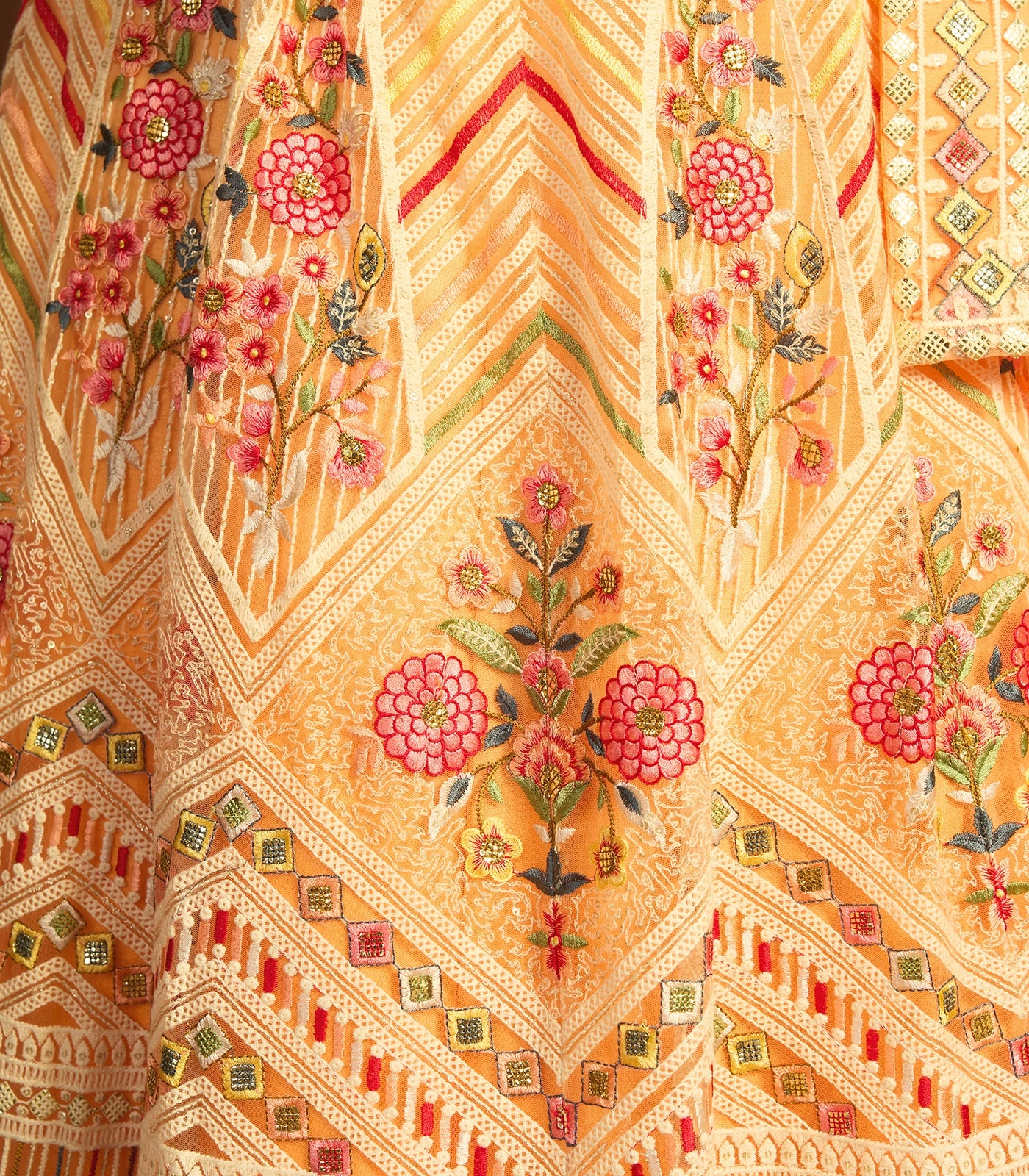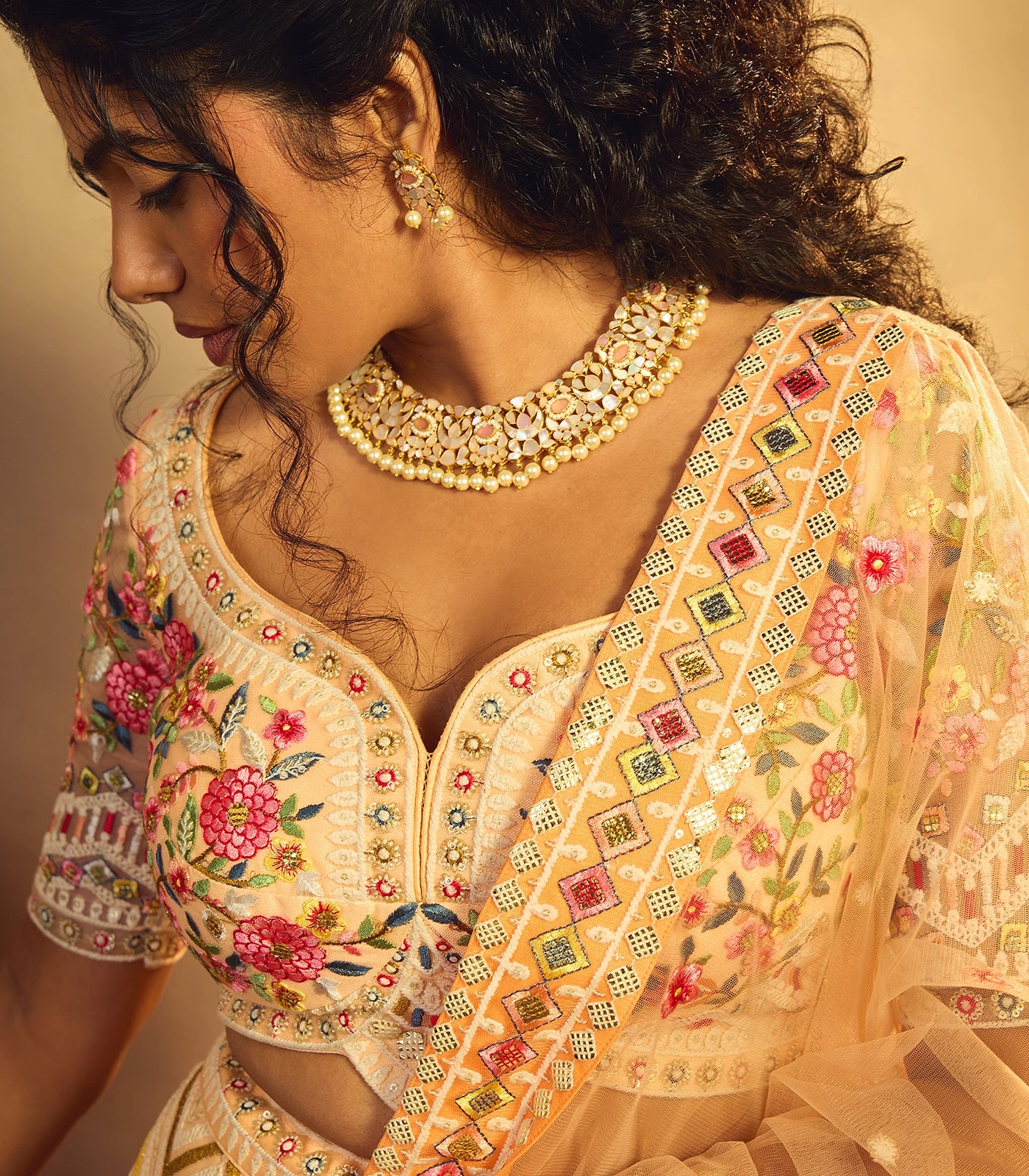 Elevate your celebration in our captivating Pastel Peach Embroidered Lehenga Set. The chic blouse features a sweetheart neckline, elegant elbow sleeves, and a stylized waist hemline. The flared skirt showcases a striking chevron pattern, all intricately adorned to perfection, and is perfectly complemented by a matching dupatta.