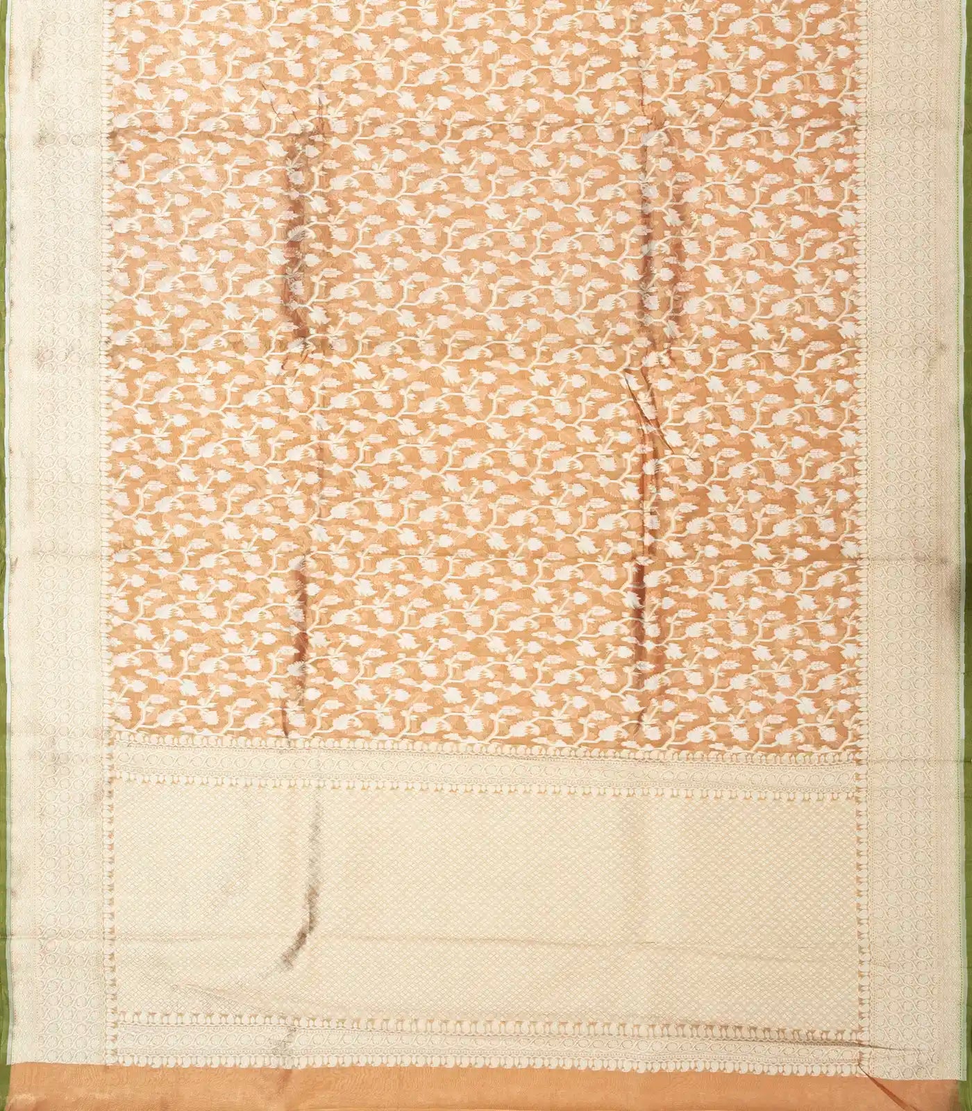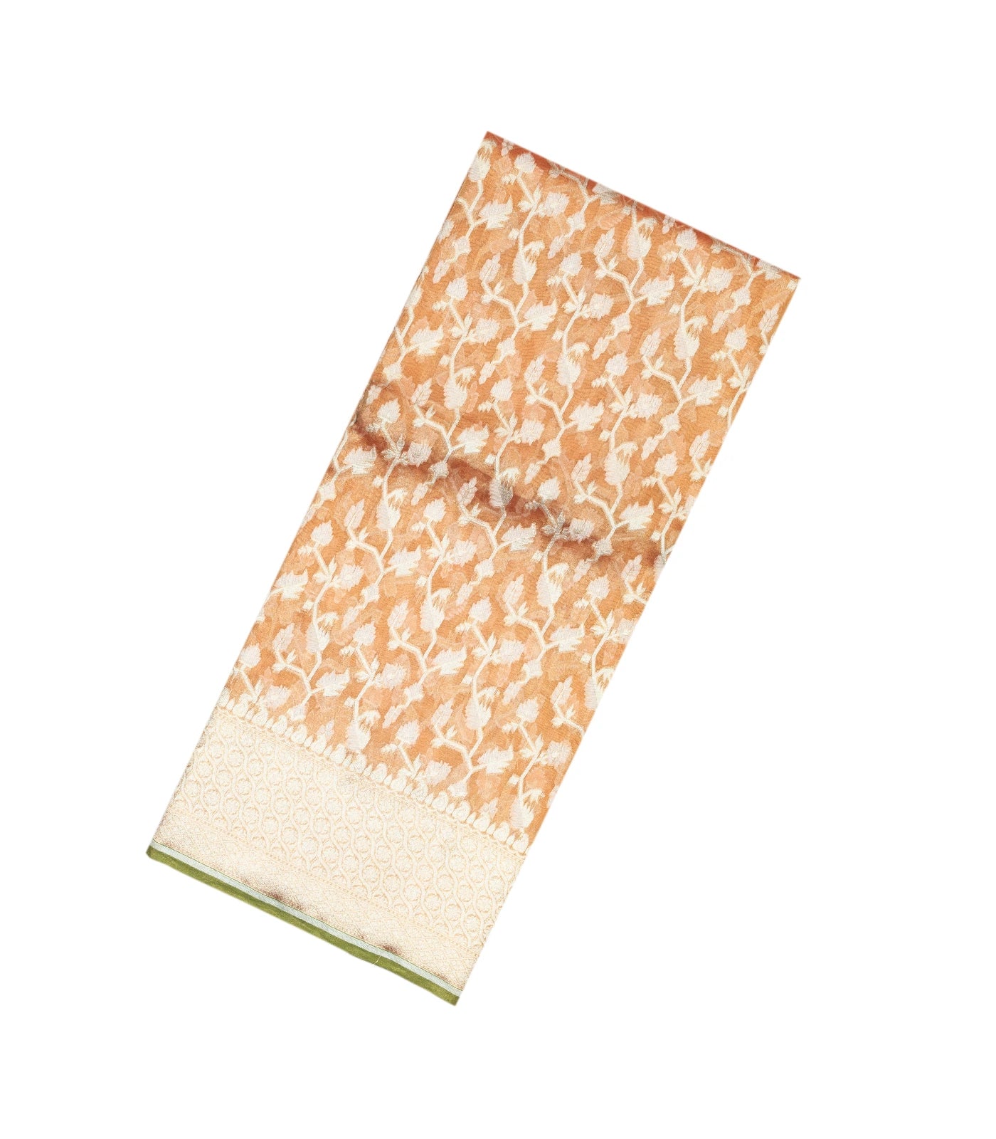 This handwoven banarasi tissue silk saree is filled with floral vine motifs in light peach body along with border and pallu