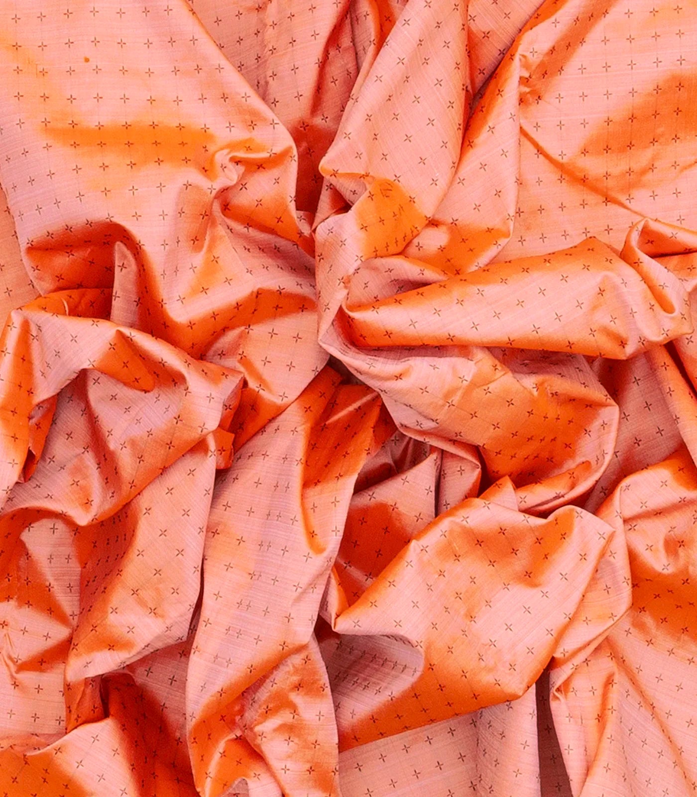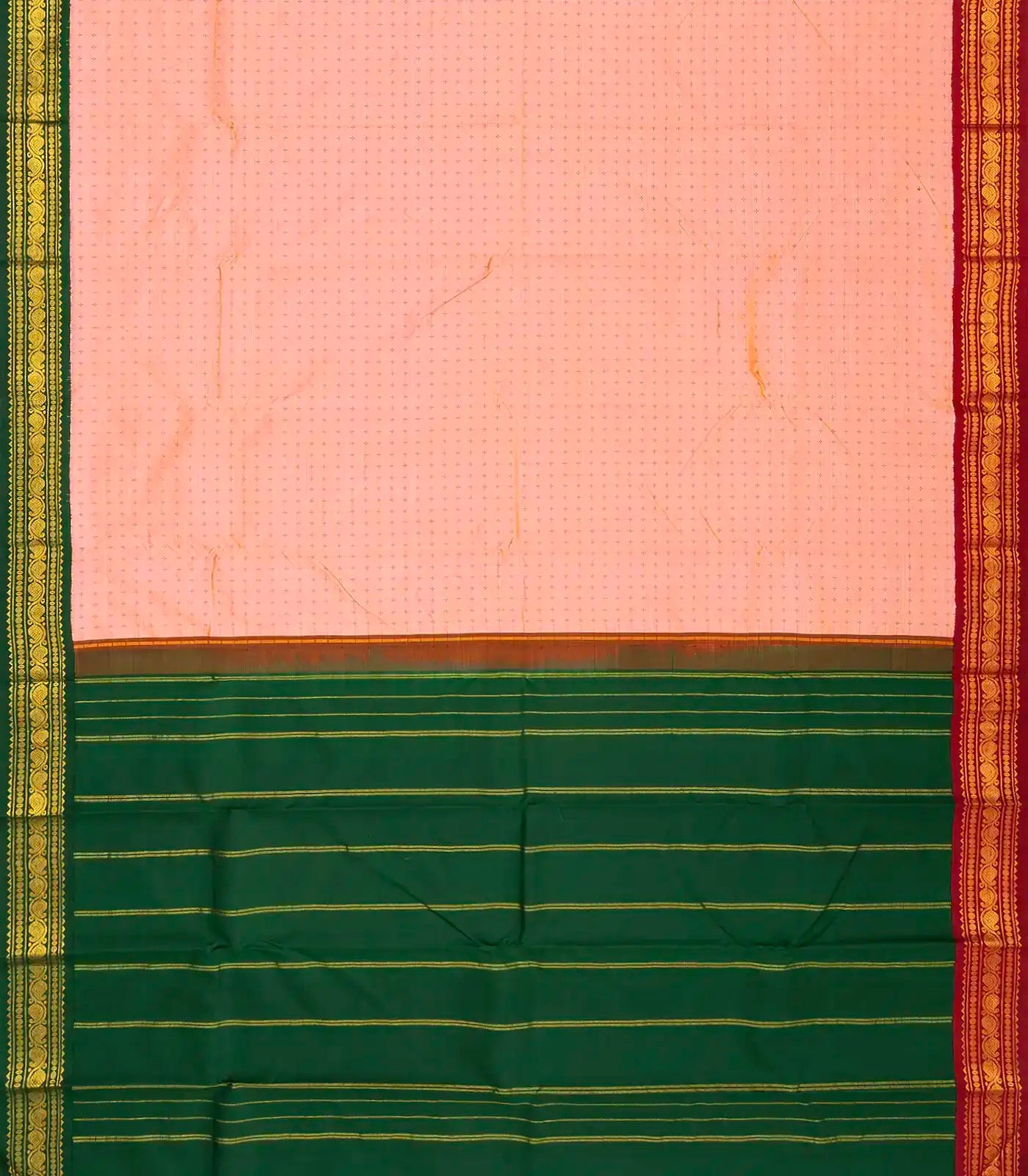 This handwoven korvai kanchipuram silk saree is filled with plus motifs in light peach body along with contrast ganga jamuna border and pallu