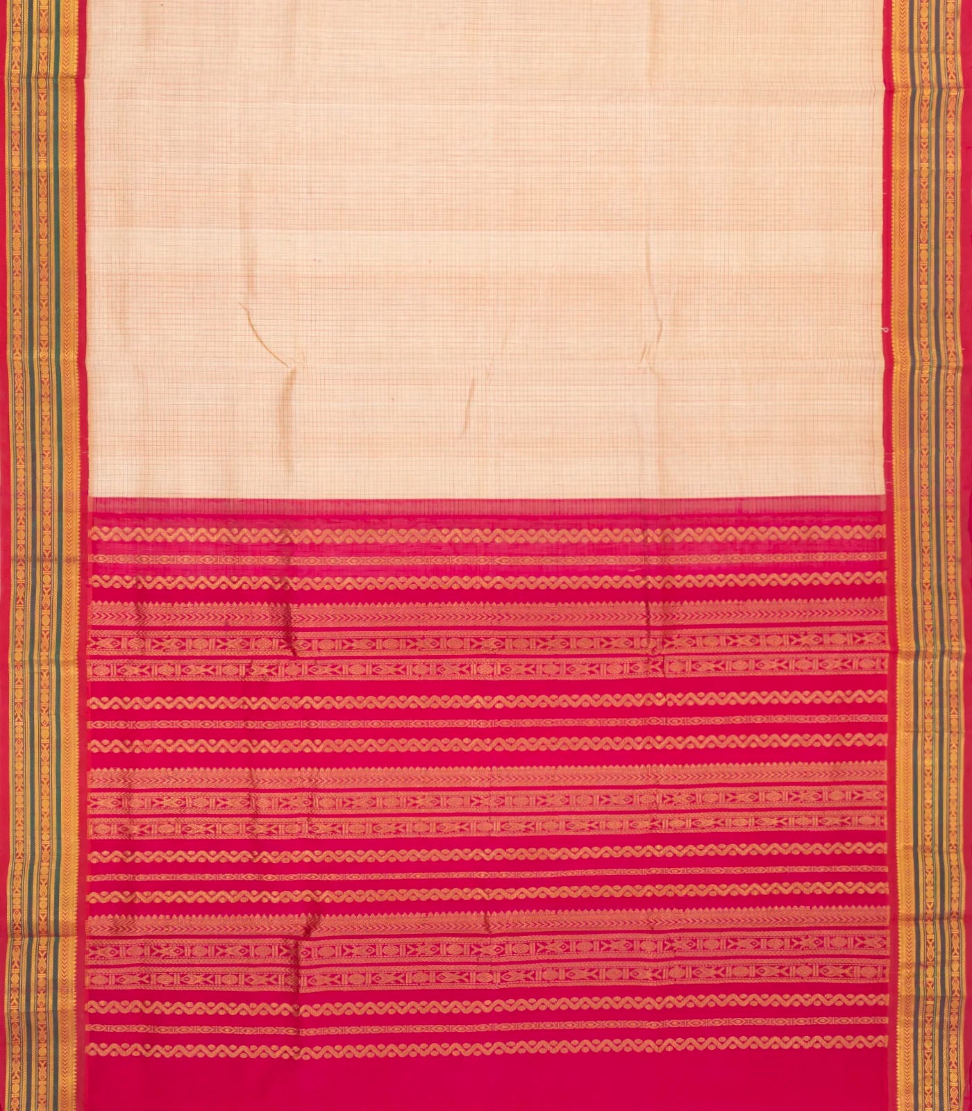 Light Peach Handloom Korvai Silk Cotton Saree With Checks & Contrast Border-SC3872