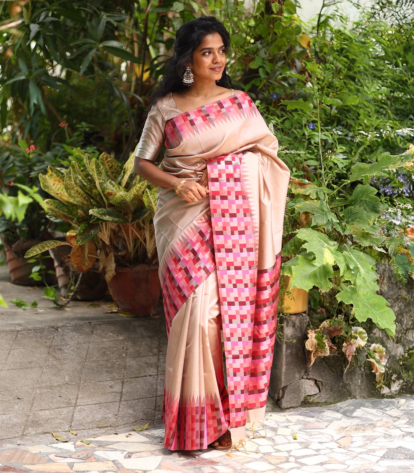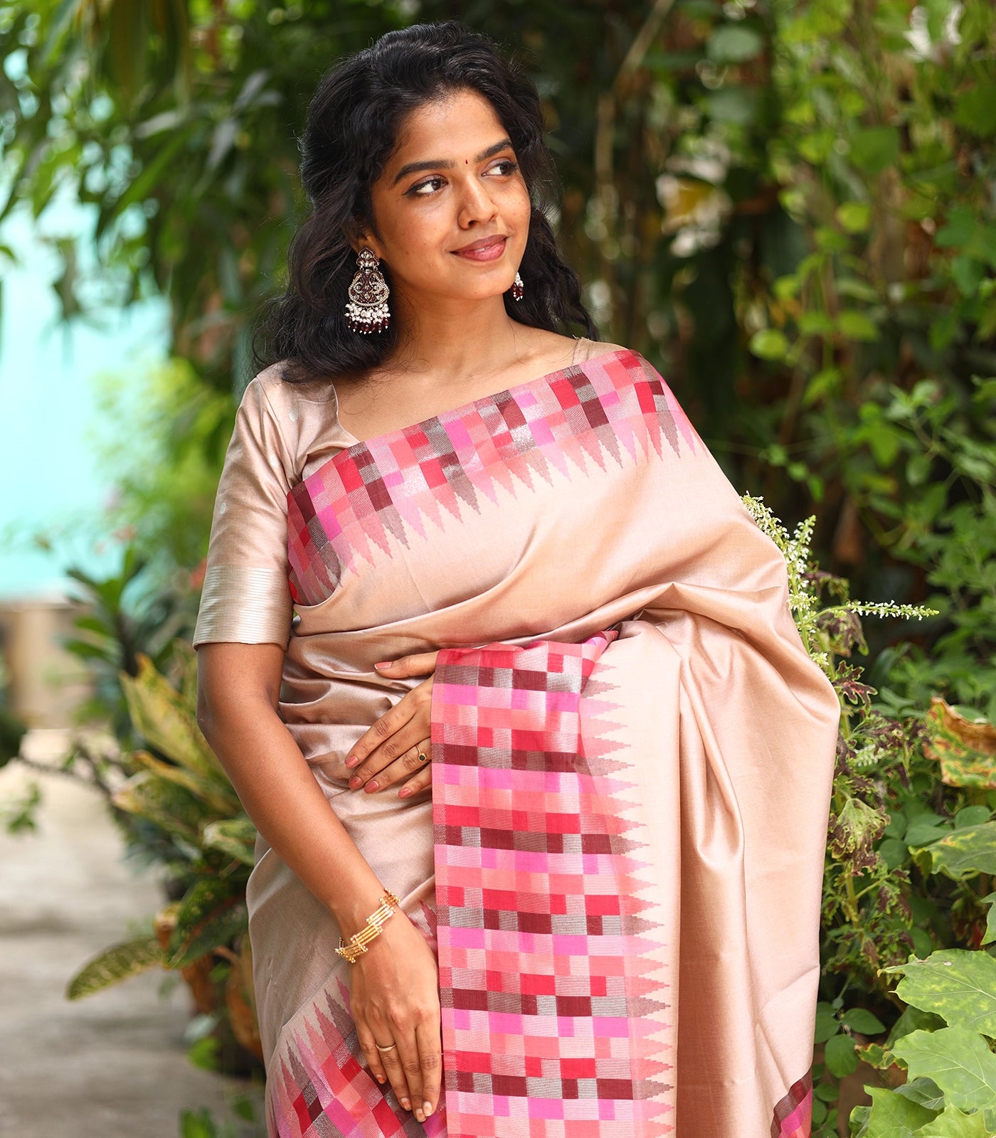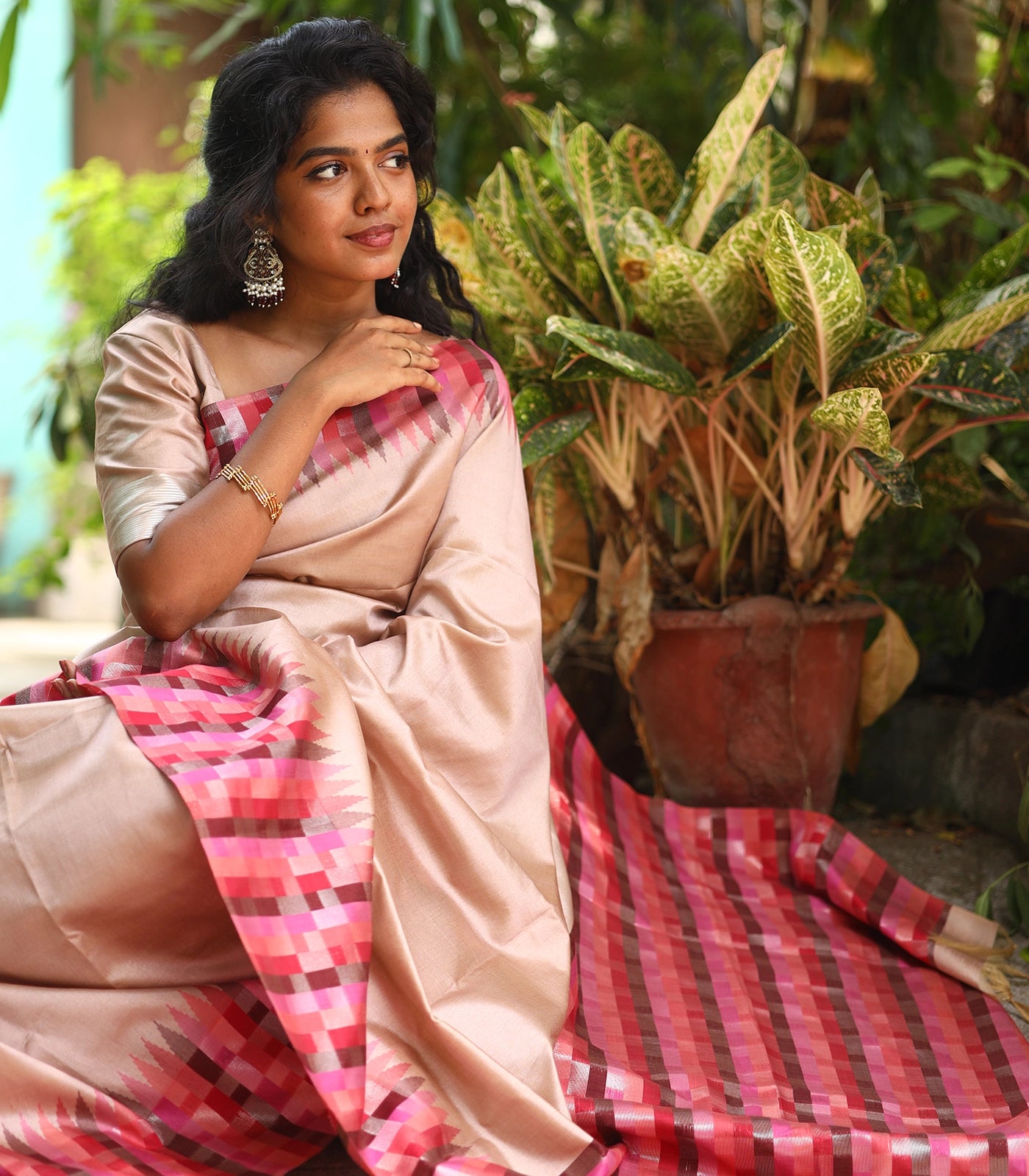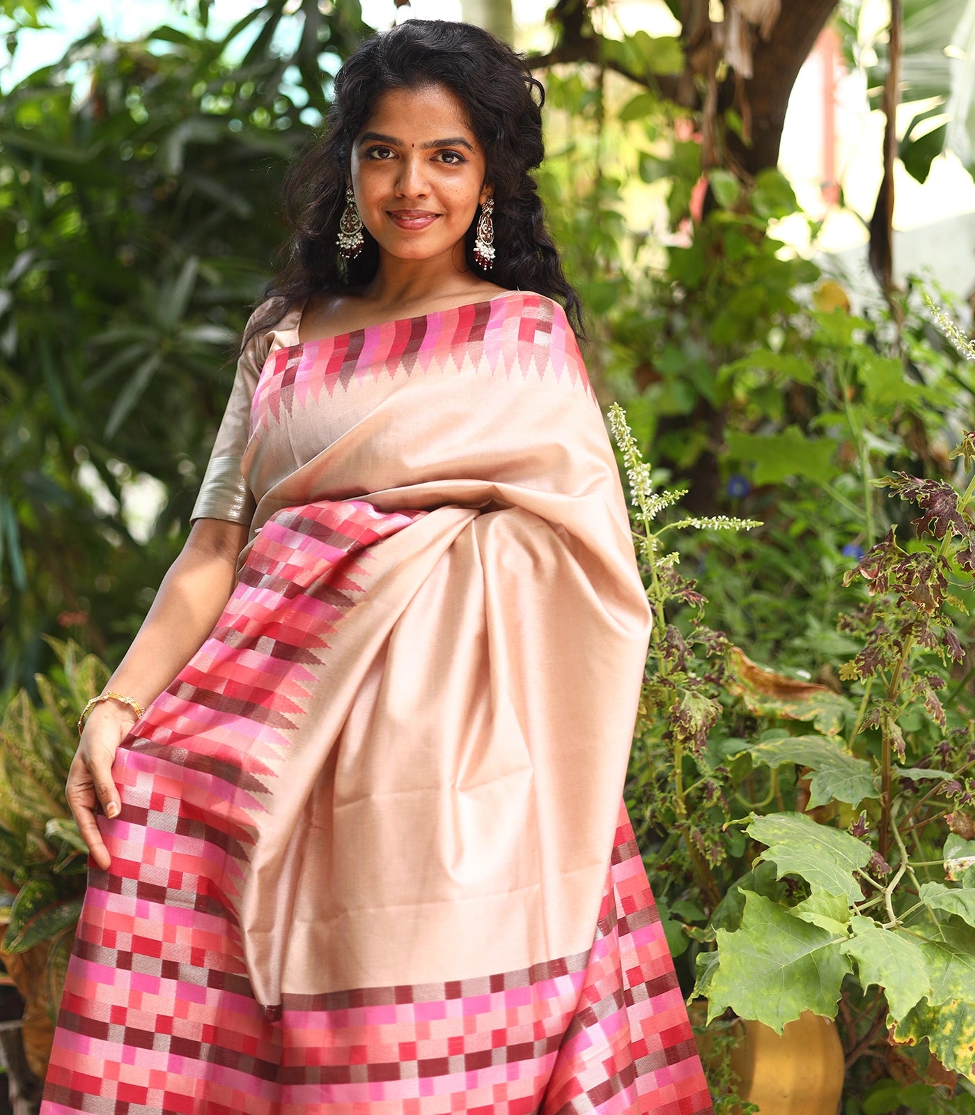 Light Peach Woven Art Tussar Saree With Contrast Checks Border