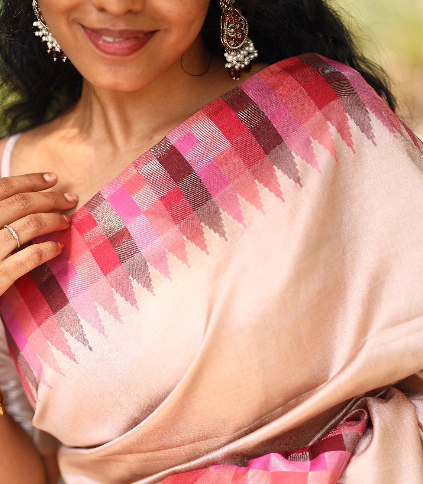 This woven art tussar saree is filled with plain light peach body along with contrast checked border and pallu
