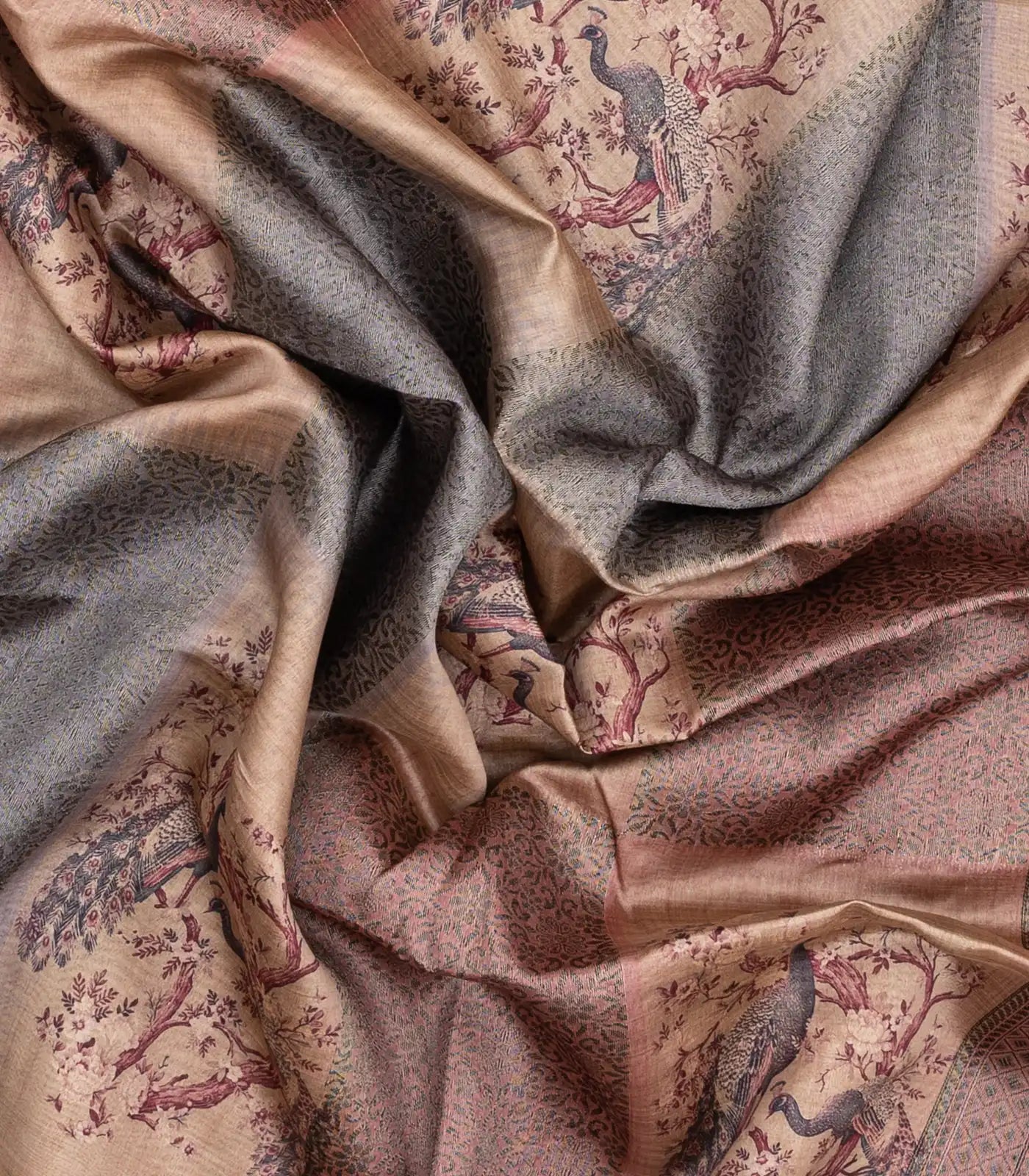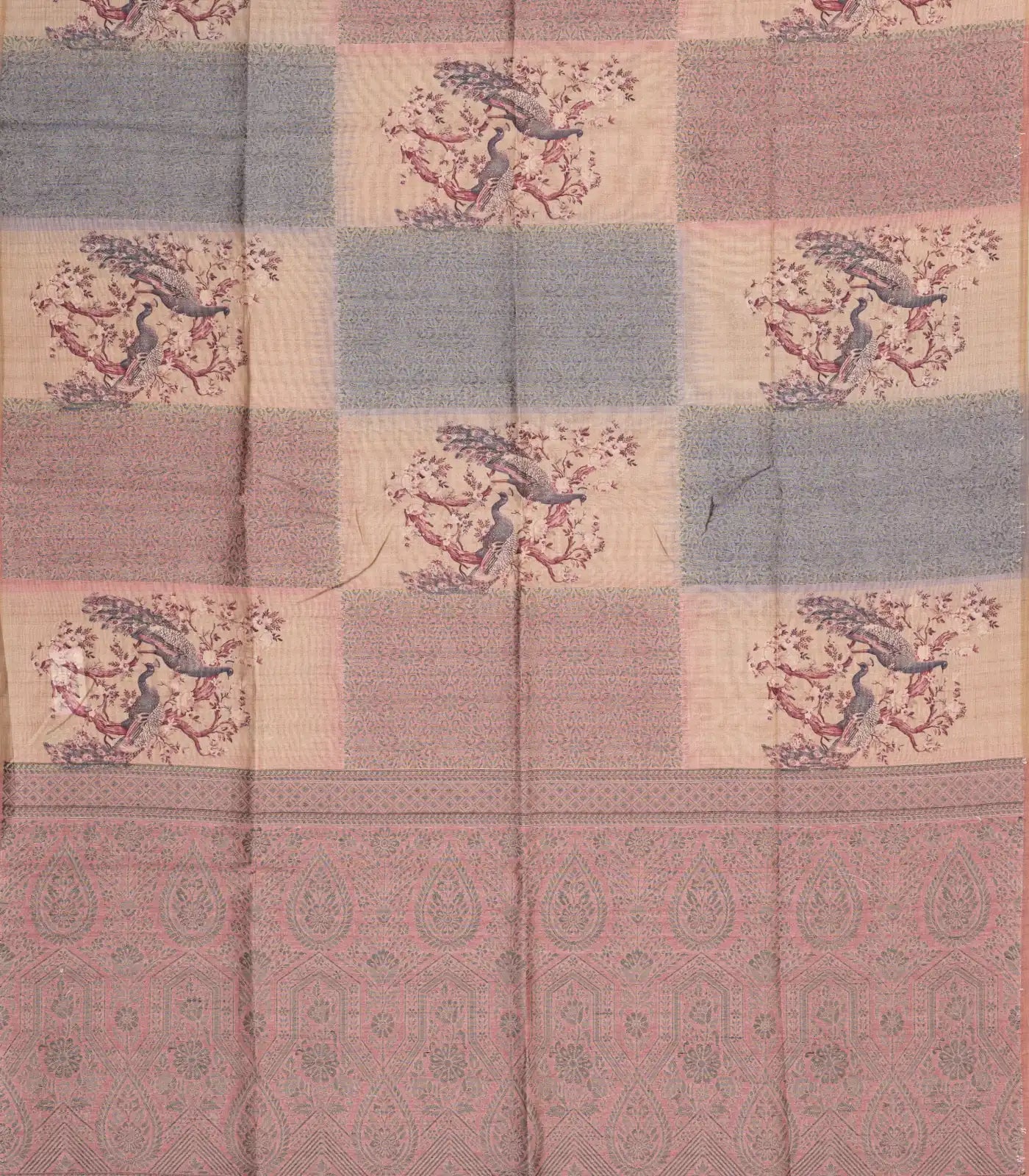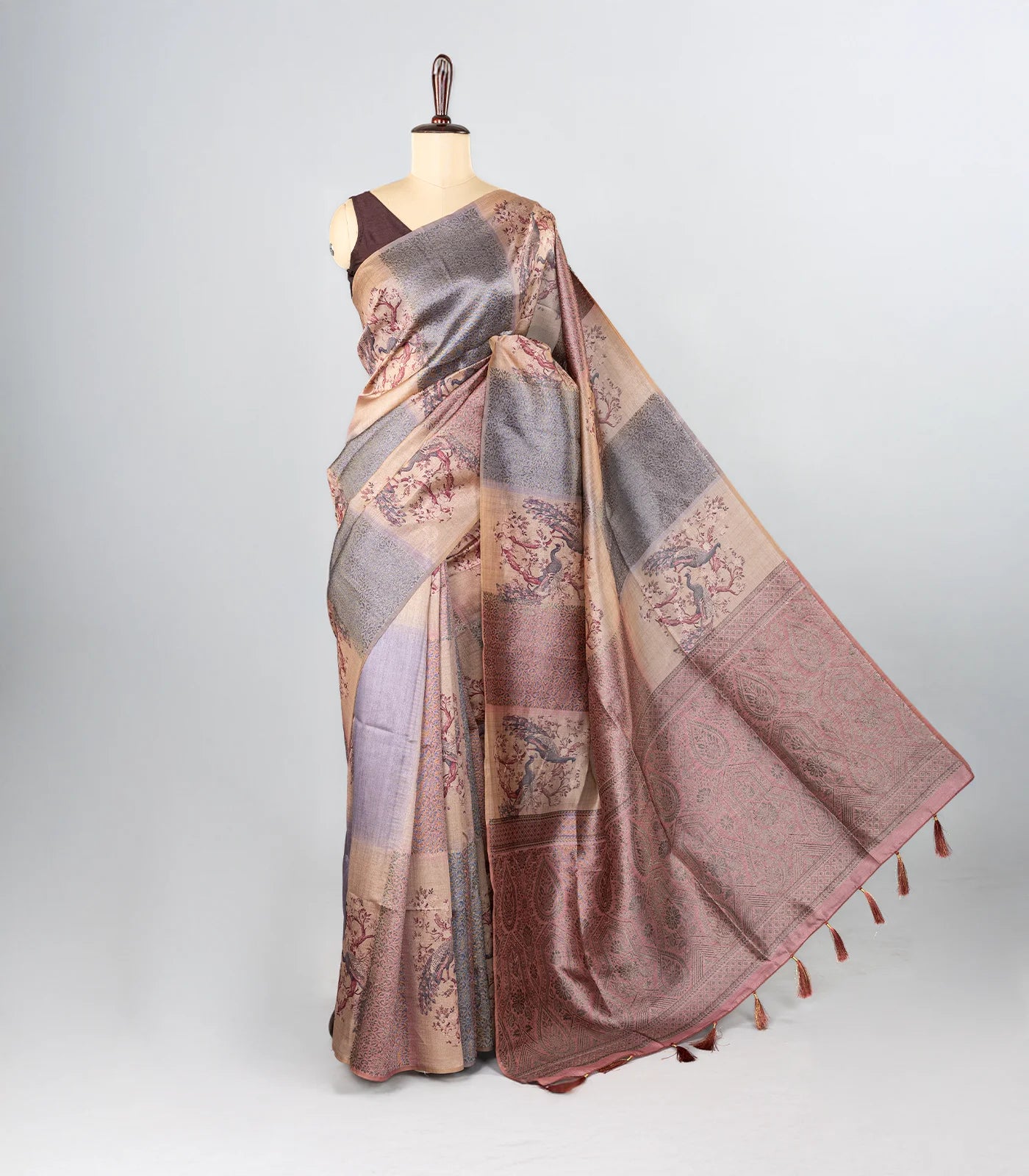 Light Peach Woven Synthetic Dola Silk Saree With Woven & Printed Floral Motifs
